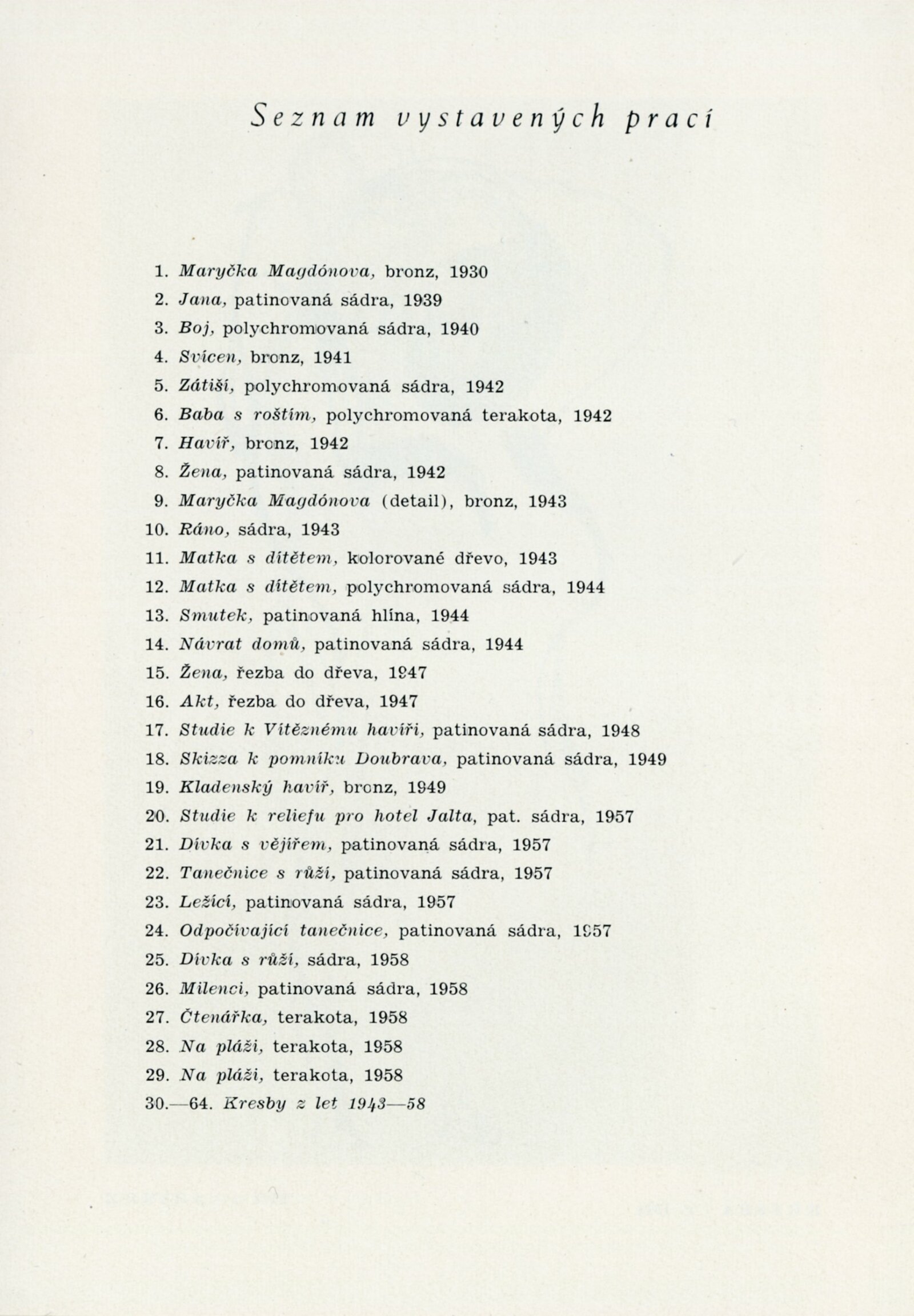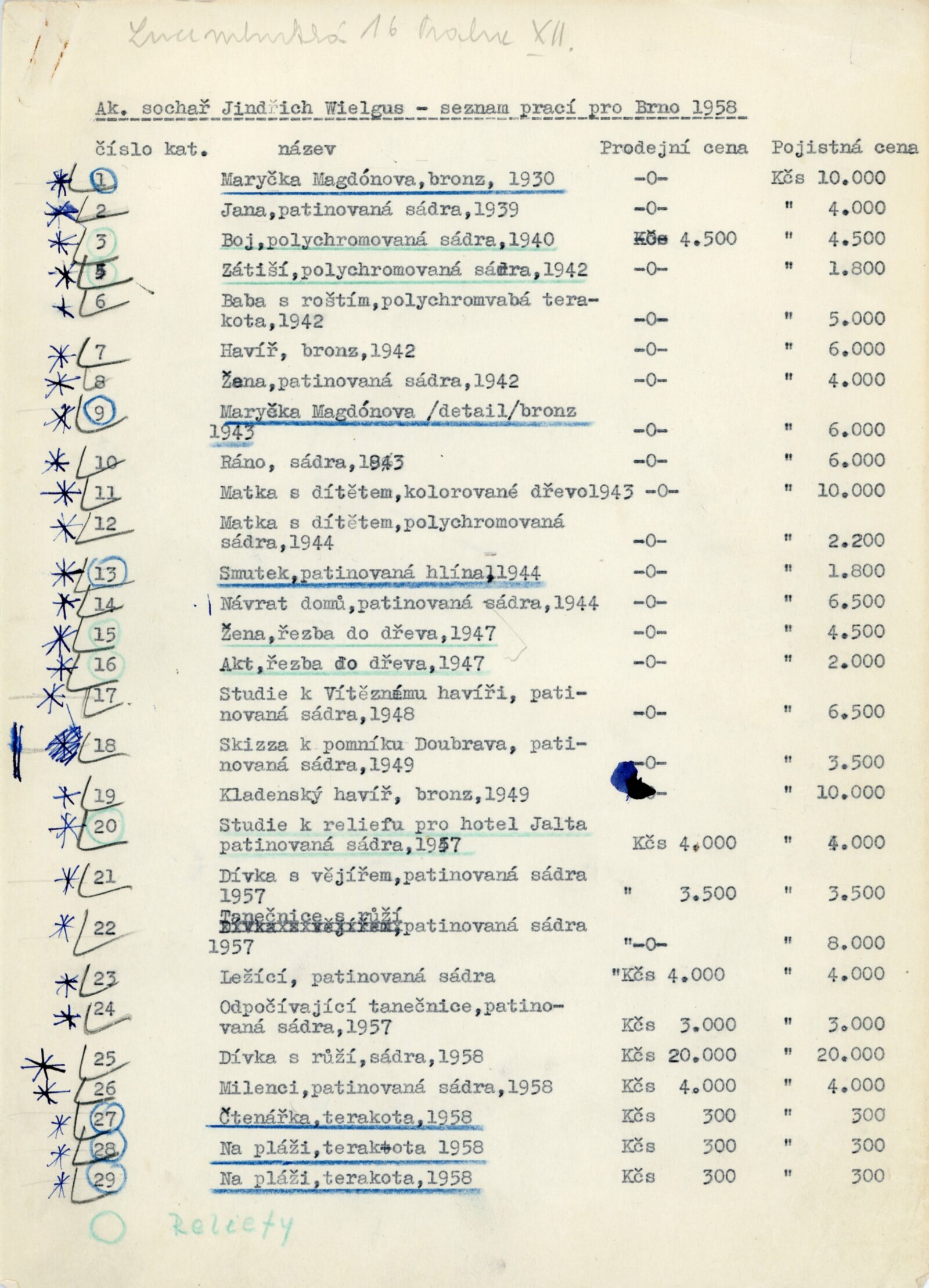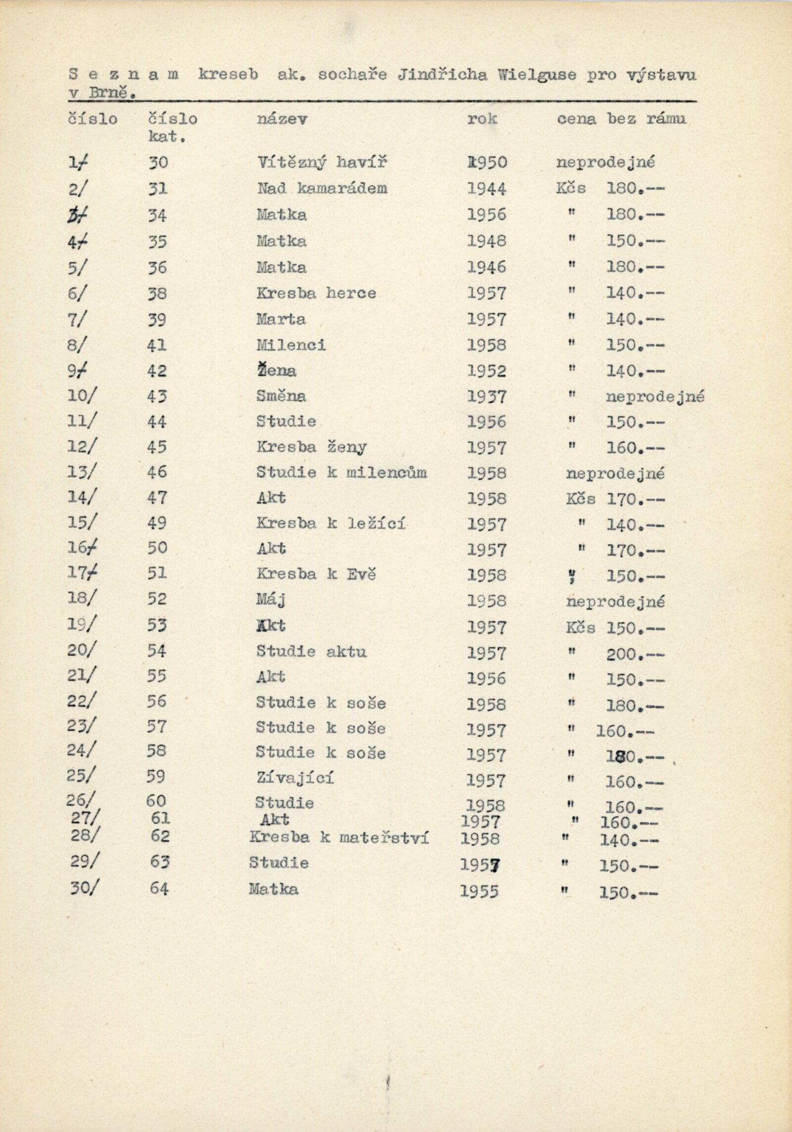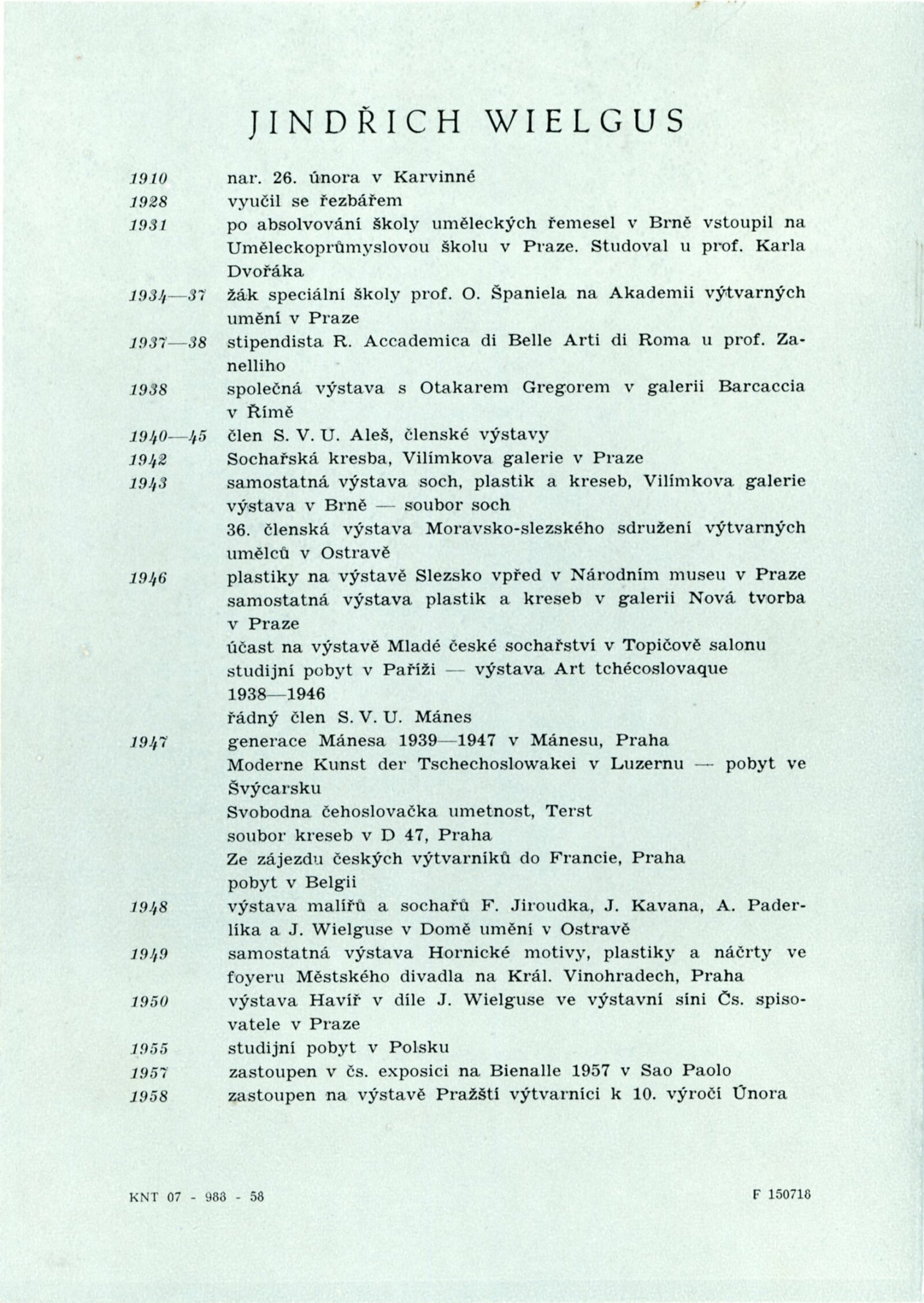 Jindřich Wielgus. Plastiky a kresby 1938–1958: Dům umění v Brně / Dům pánů z Poděbrad, 5. 7. – 10. 8. 1958 / Převzatý katalog. Jindřich Wielgus. Plastiky a kresby 1939–1958: Galerie českého fondu výtvarných umění, Praha, Národní třída 30, 2. 5. – 26. 5. 1958 / Text: Jan Řezáč. – Praha: ČFVU, 1958. – 12 s., obr., životní data, DPK 8