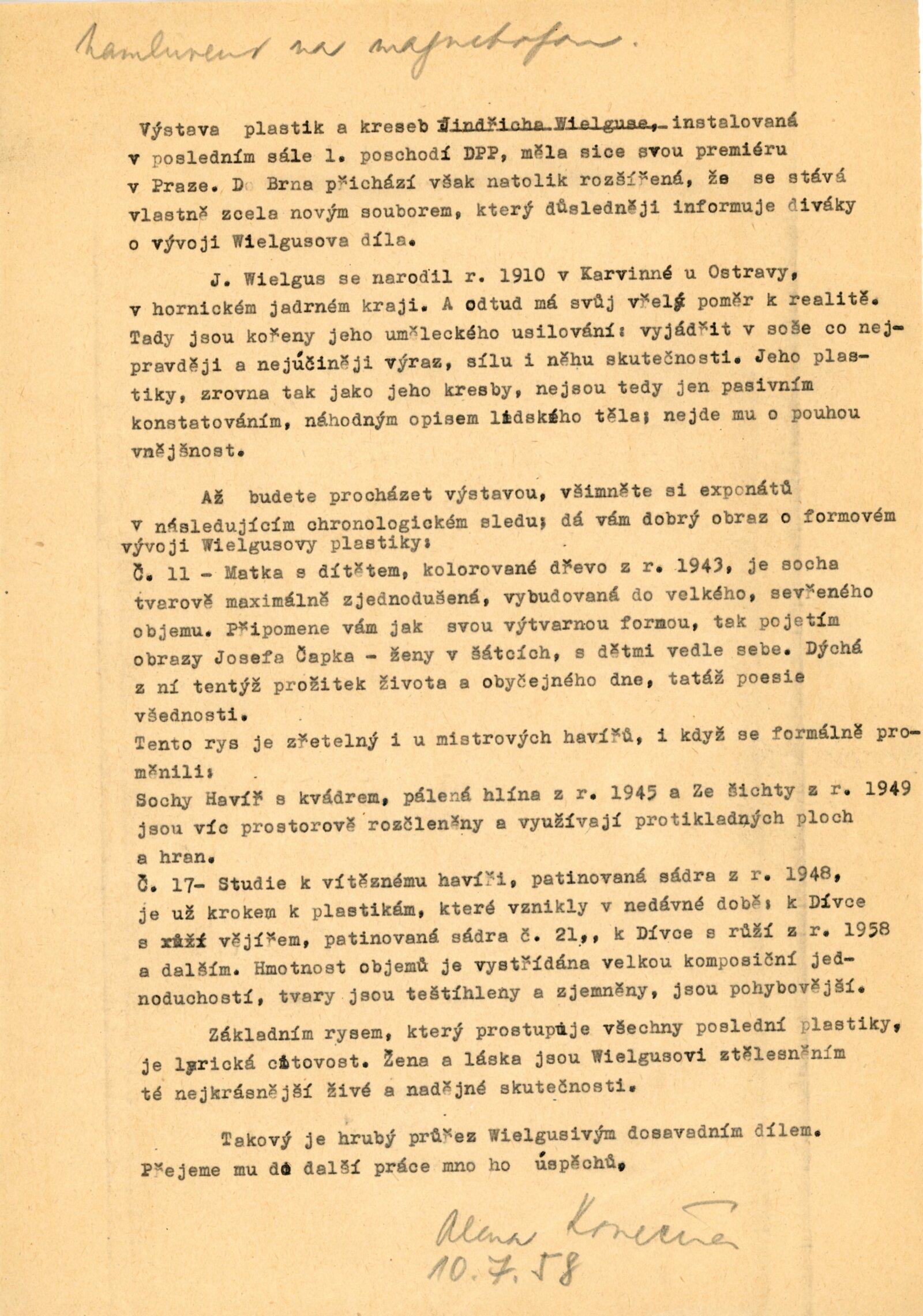 pozvánka (i pro předchozí výstavy v Praze, ČFVU), seznam vystavených děl, strojopis textu pro rozhlas a audionahrávku (Alena Konečná), fotografie z expozice, korespondence (Adolf Kroupa s umělcem, rukopis Jiřího Wielguse, provozní korespondence), recenze v tisku, katalog převzaté výstavy v Praze