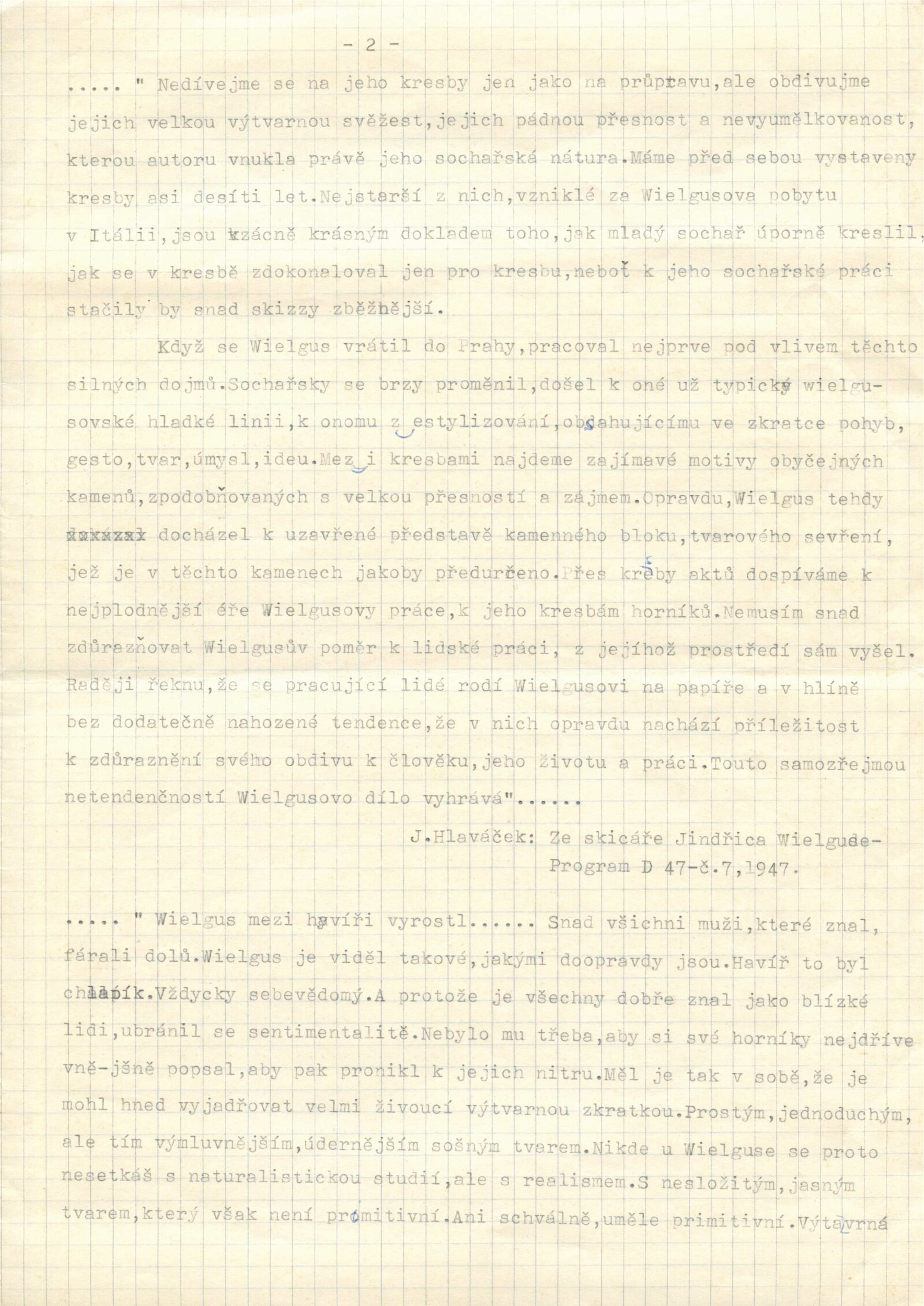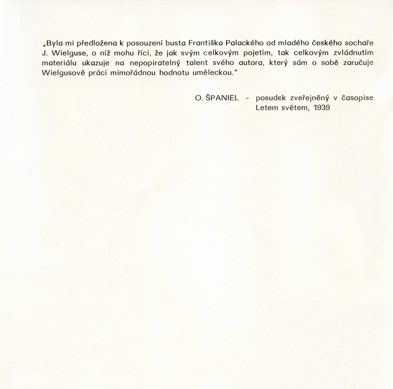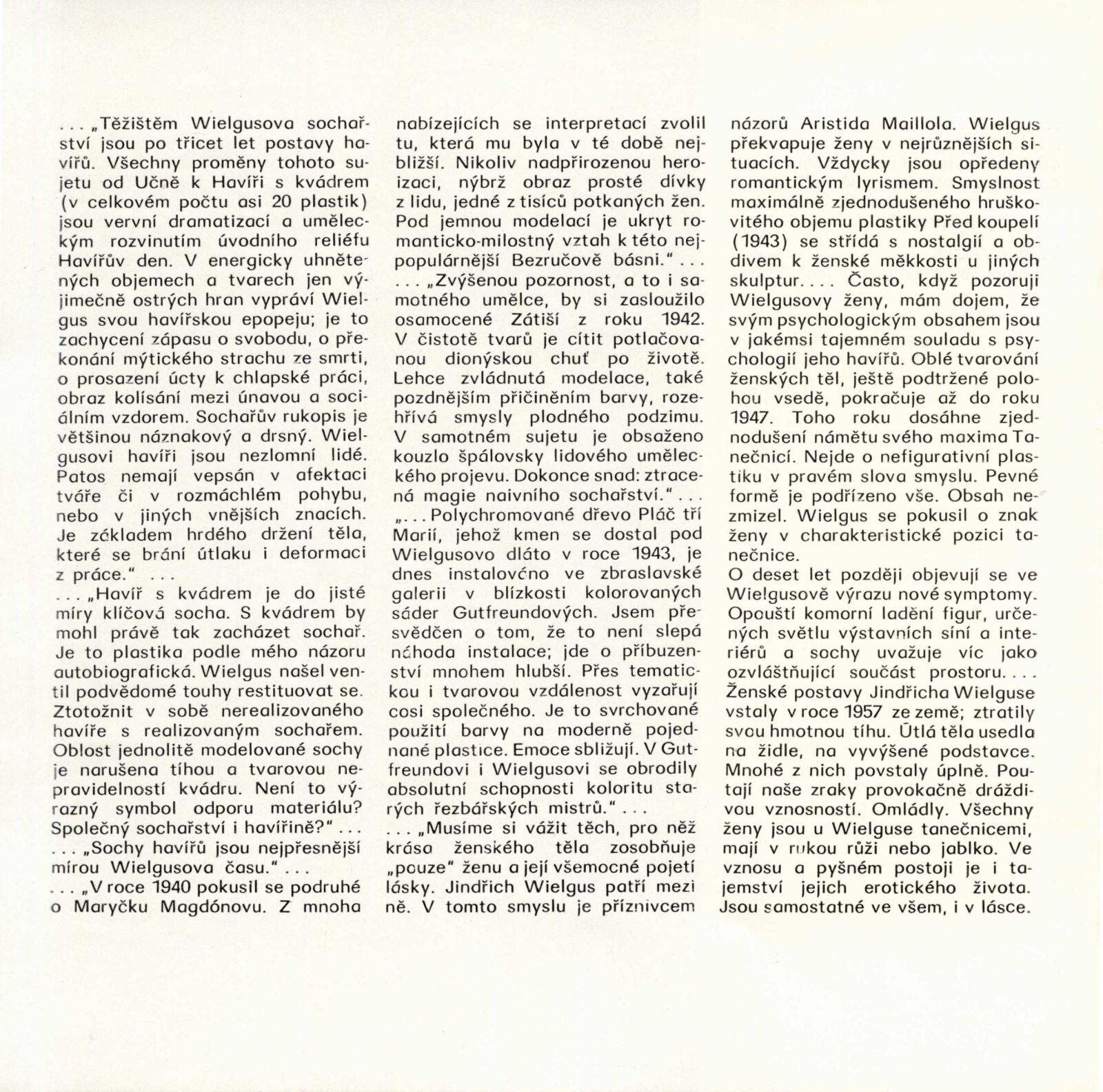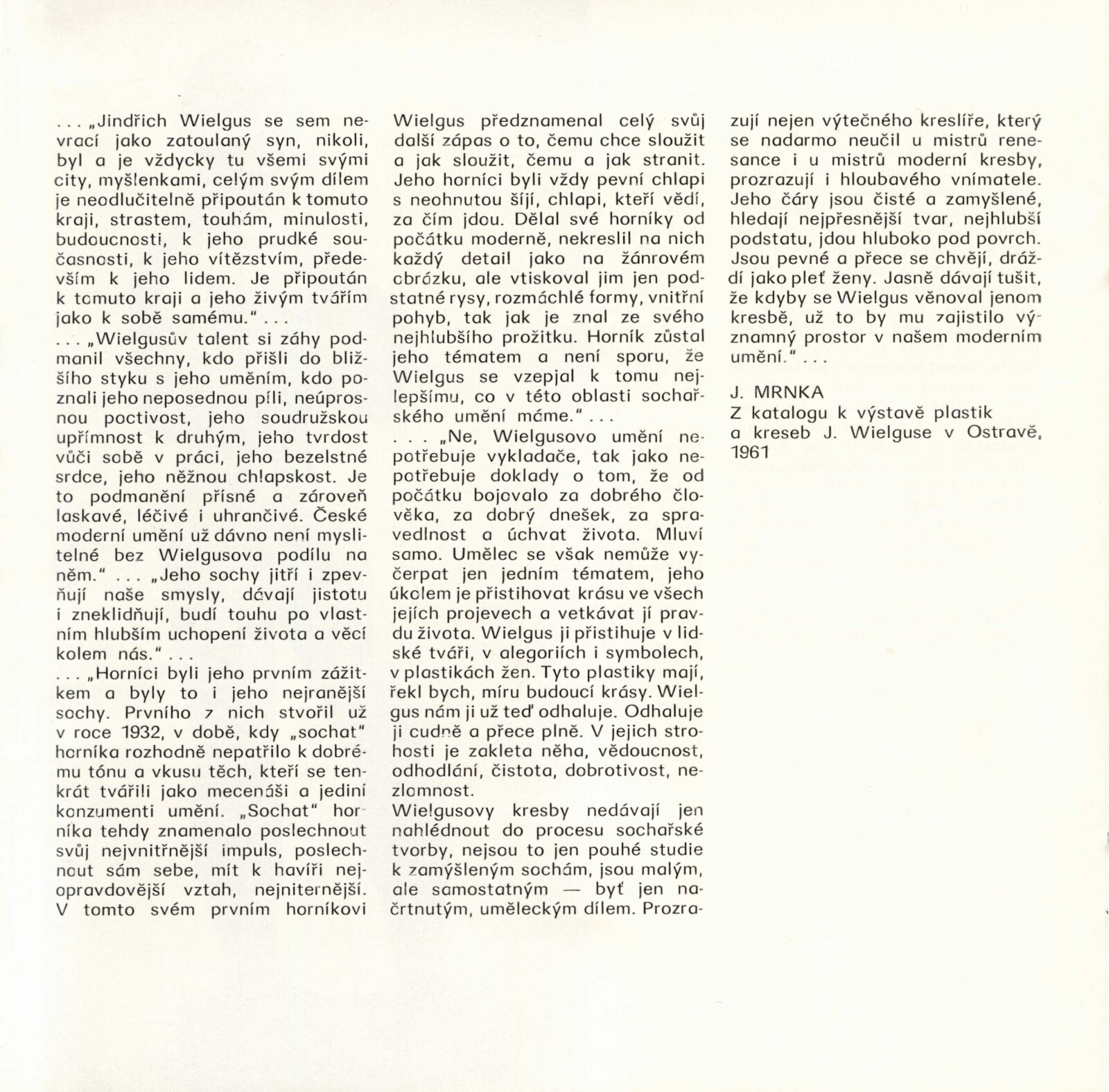 Jindřich Wielgus. Sochy a kresby: Dům umění města Brna 28. 11. 1973 – 1. 1. 1974 / Výňatky z kritik různých autorů. Báseň Václav Daňek. Brno: DUmB, 1973. – 36 s., obr., portrét, životní data, výstavy, ceny, zastoupení ve sbírkách, realizace, DU 600. – MZK; MG; MMB