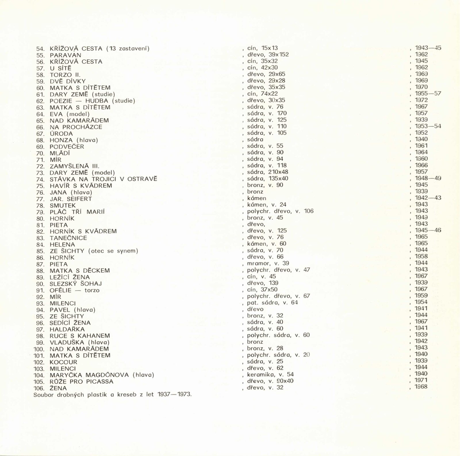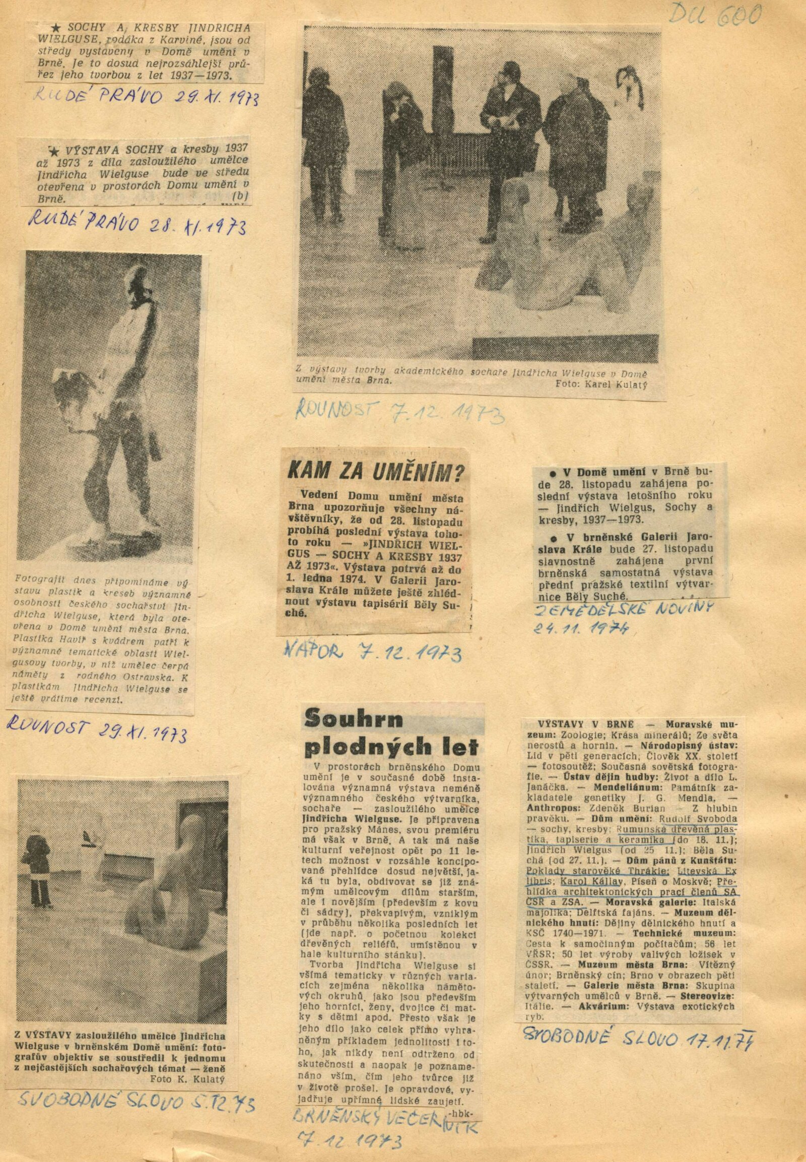 pozvánka, katalog, fotografie z vernisáže, seznam vystavených exponátů, strojopis textu pro katalog, organizace výstavy, provozní korespondence, dopisy Jindřicha Wielgus Domu umění, reverzy, žádost o povolení výstavy, recenze v tisku