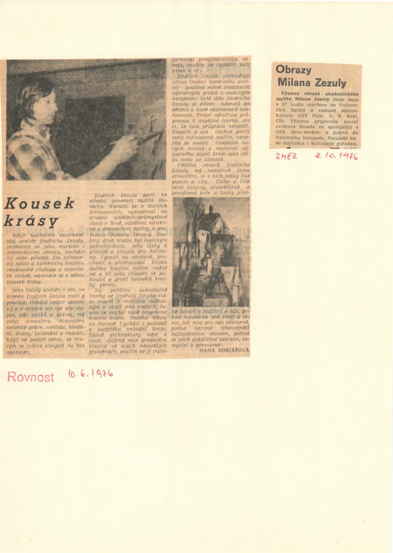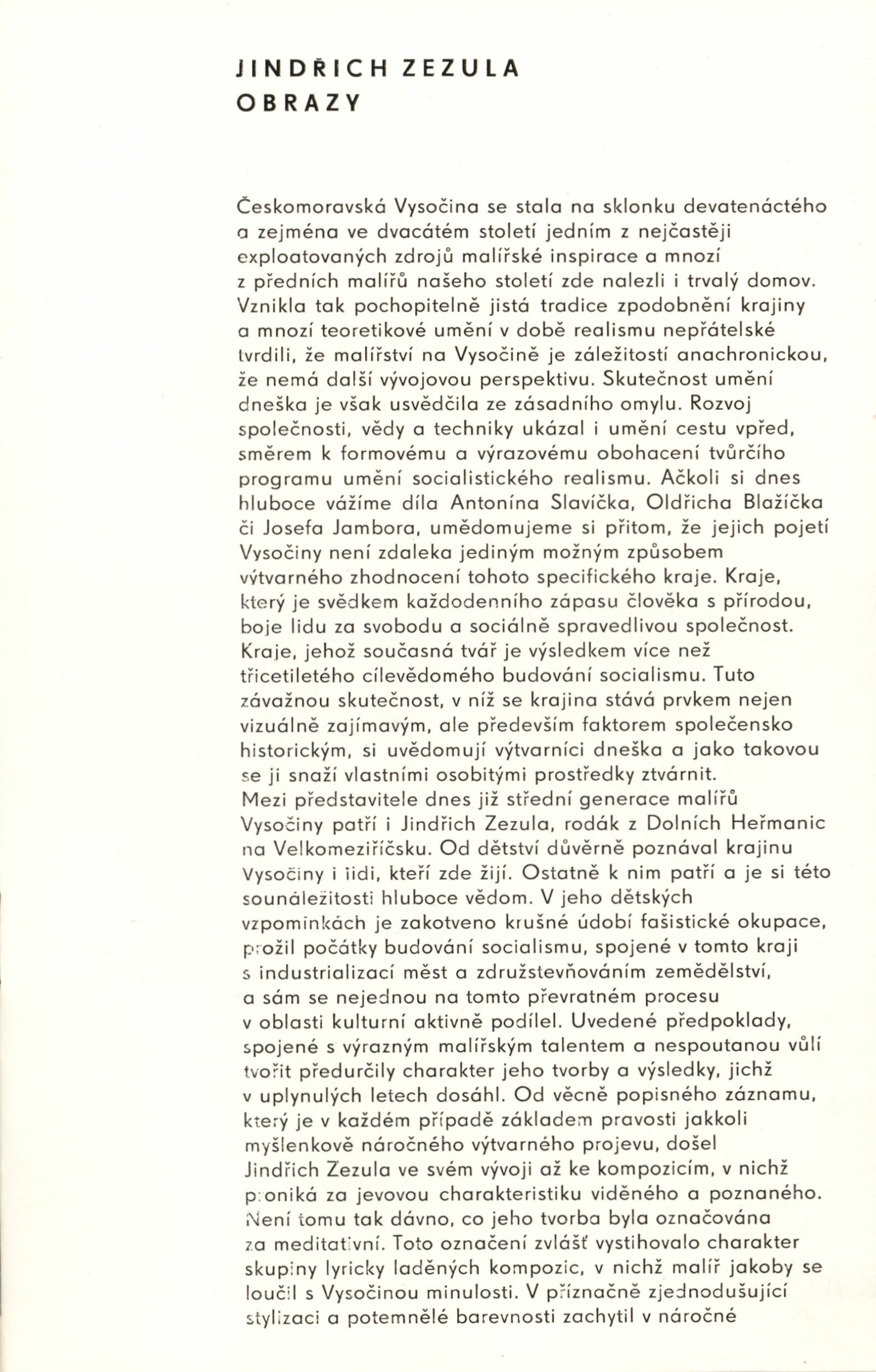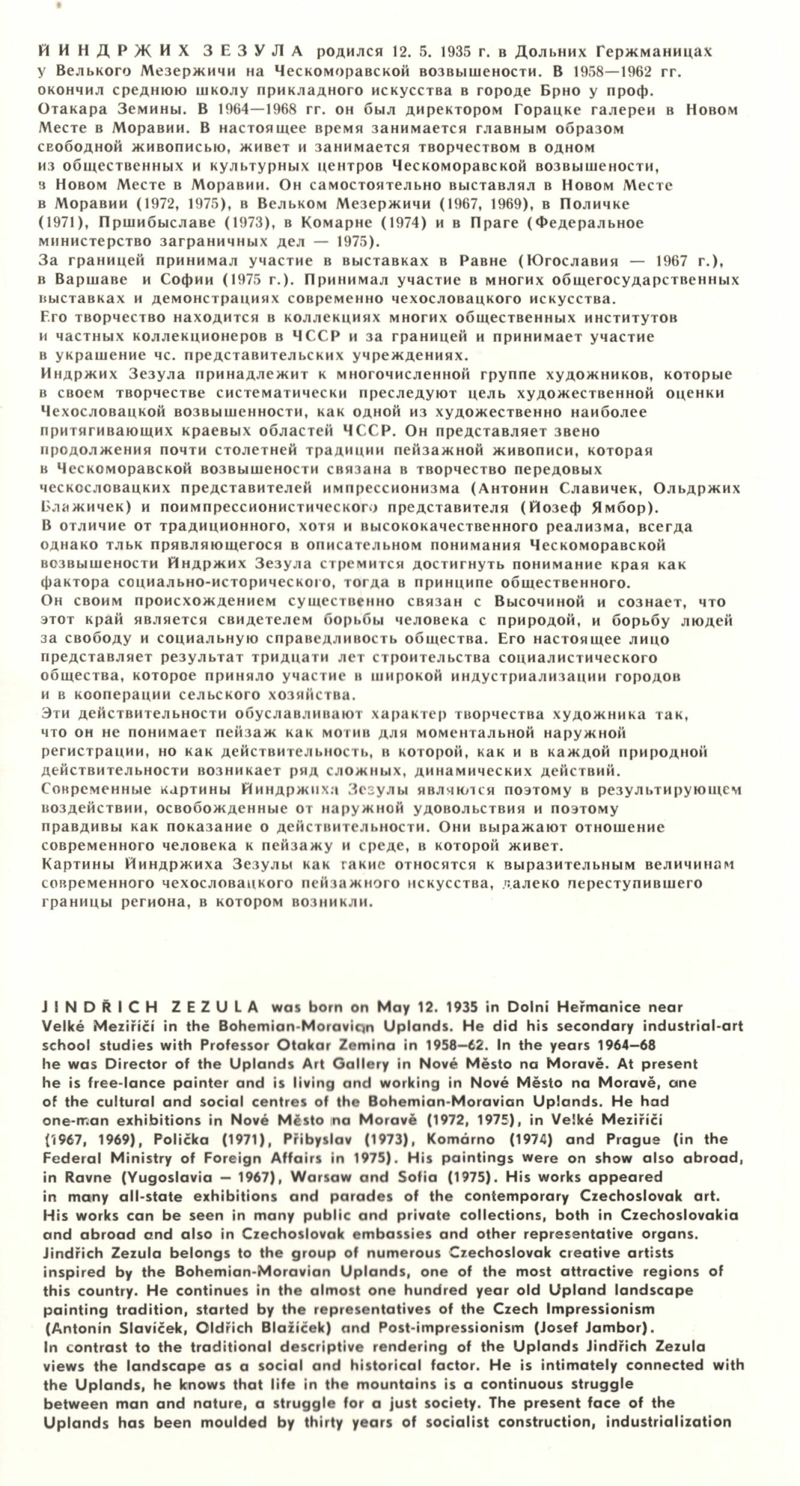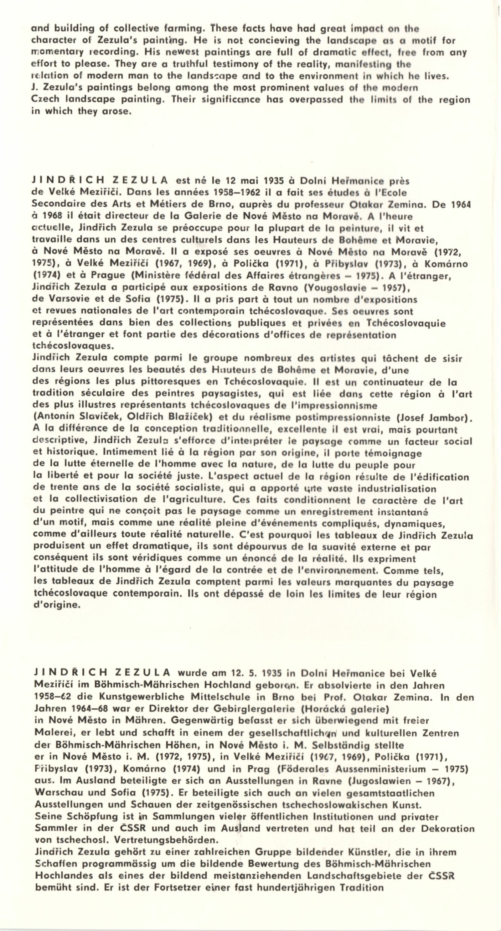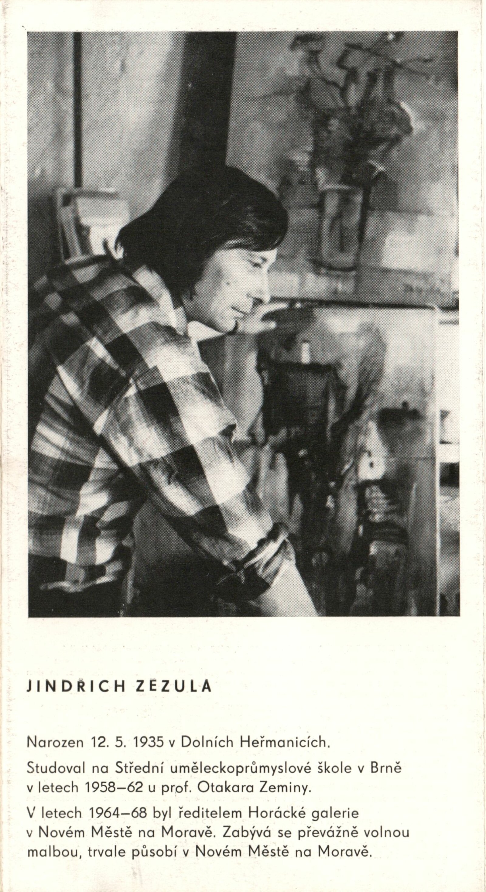 Jindřich Zezula. Obrazy: Dům umění, 74. výstava v Galerii Jaroslava Krále, 31. 8. – 26. 9. 1976 / Text: Zdeněk Čubrda. – Brno: ČFVU, 1976. – 10 s., obr., seznam vystavených prací 2 s., portrét, životopis, výstavy, DU 644. – MZK; MG; MMB