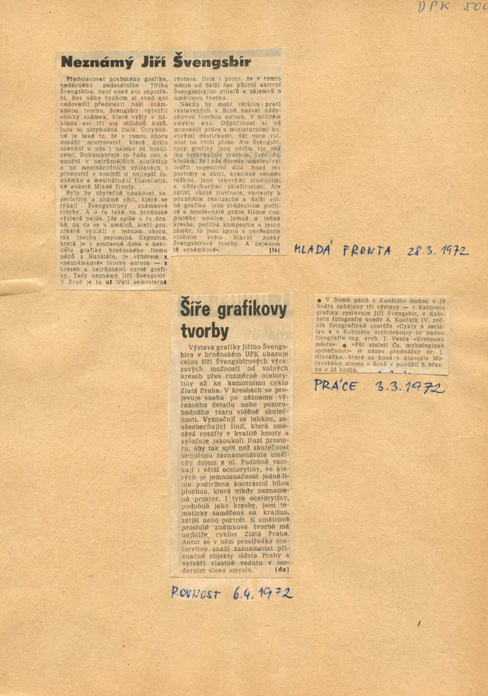 společná pozvánka (DPK 500–502), pozvánka na besedu s autorem, katalog, texty pro katalog, autorův životopis, korespondence o pořádání výstavy (Švengsbírclub), provozní korespondence, smlouva k výstavě, žádost o povolení výstavy, recenze v tisku