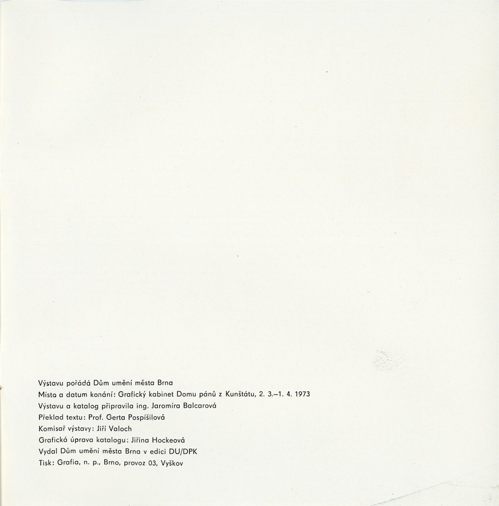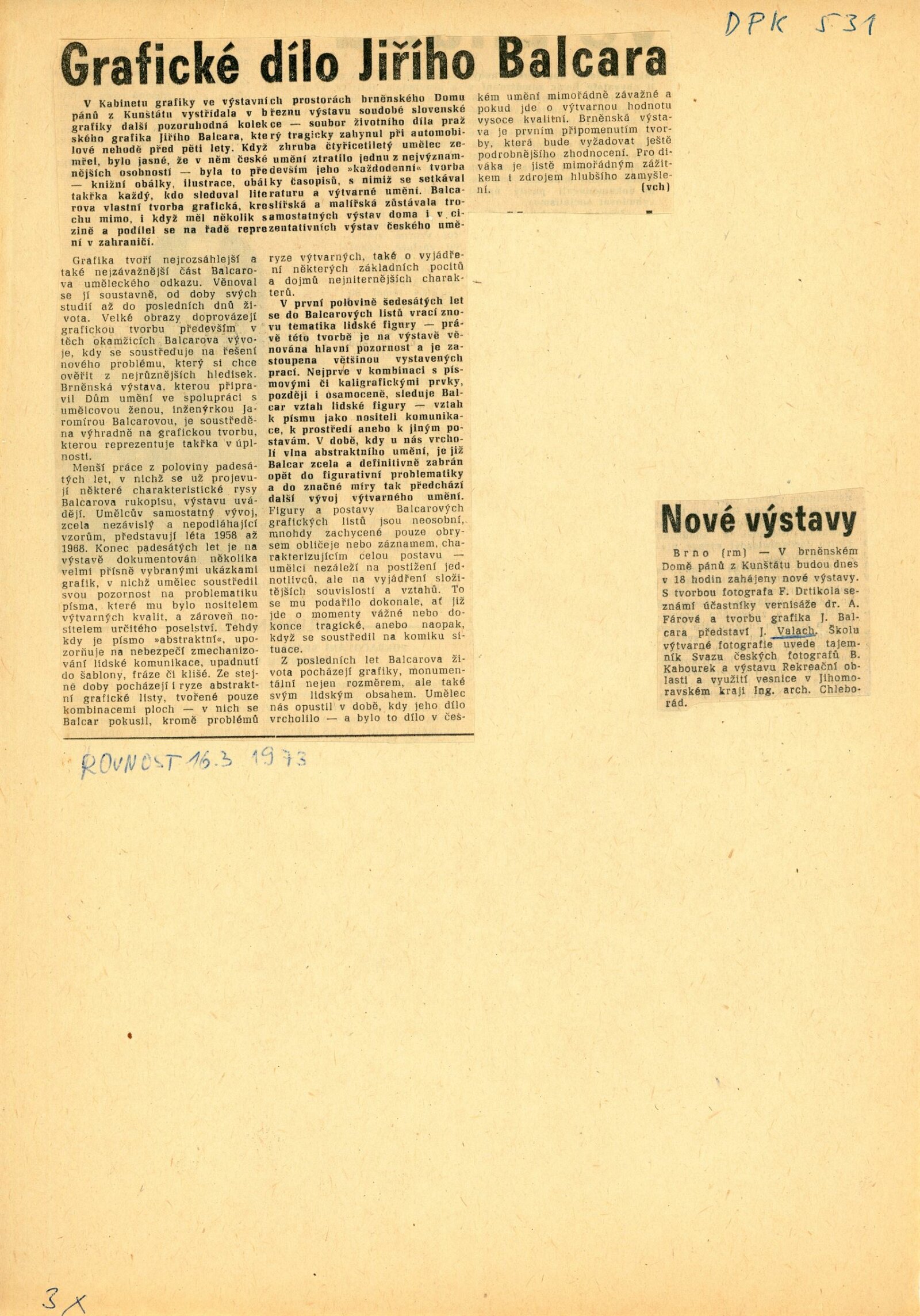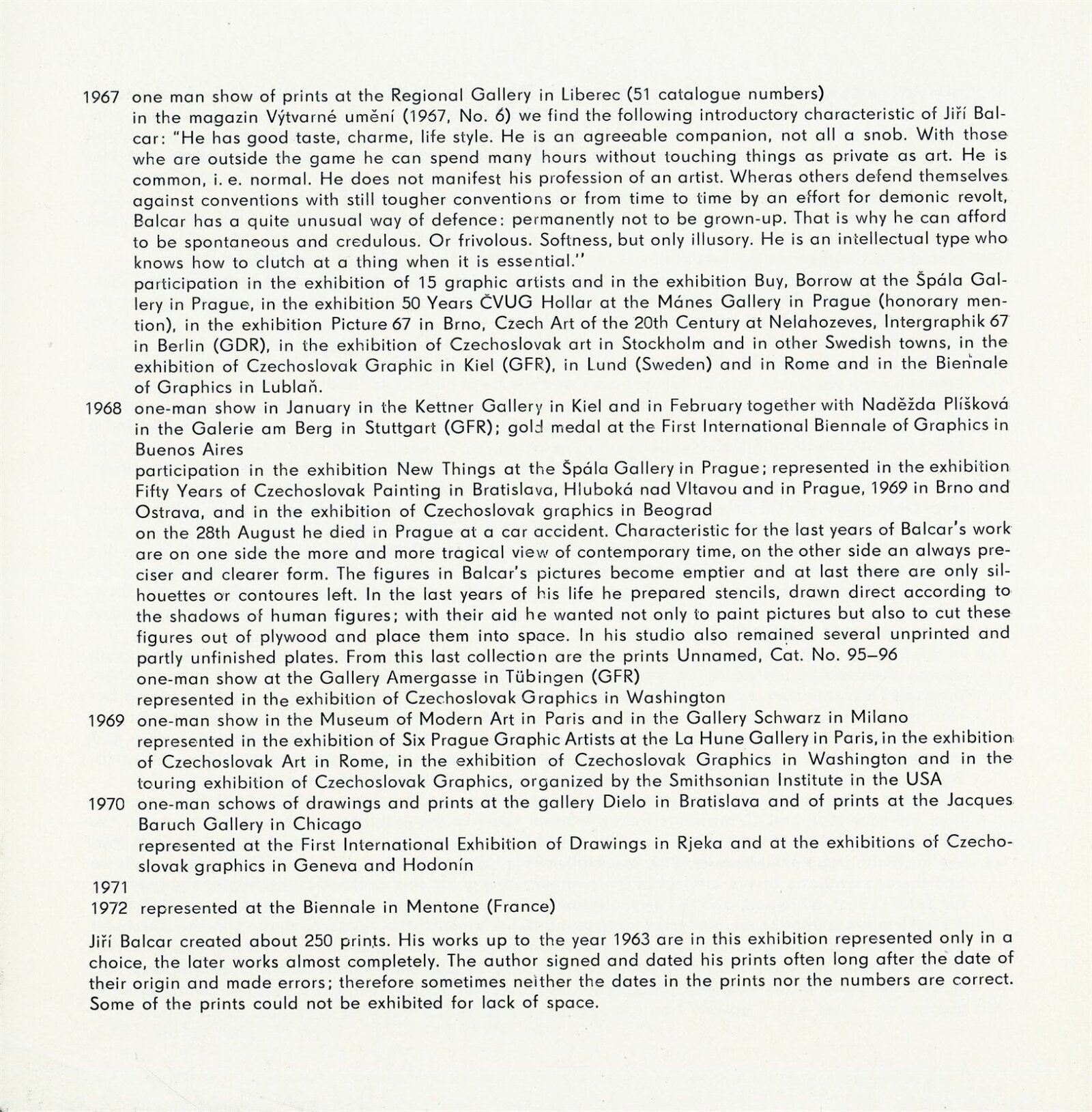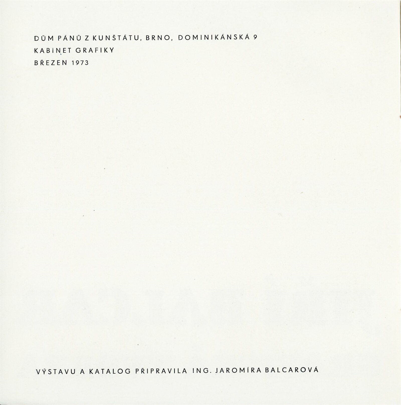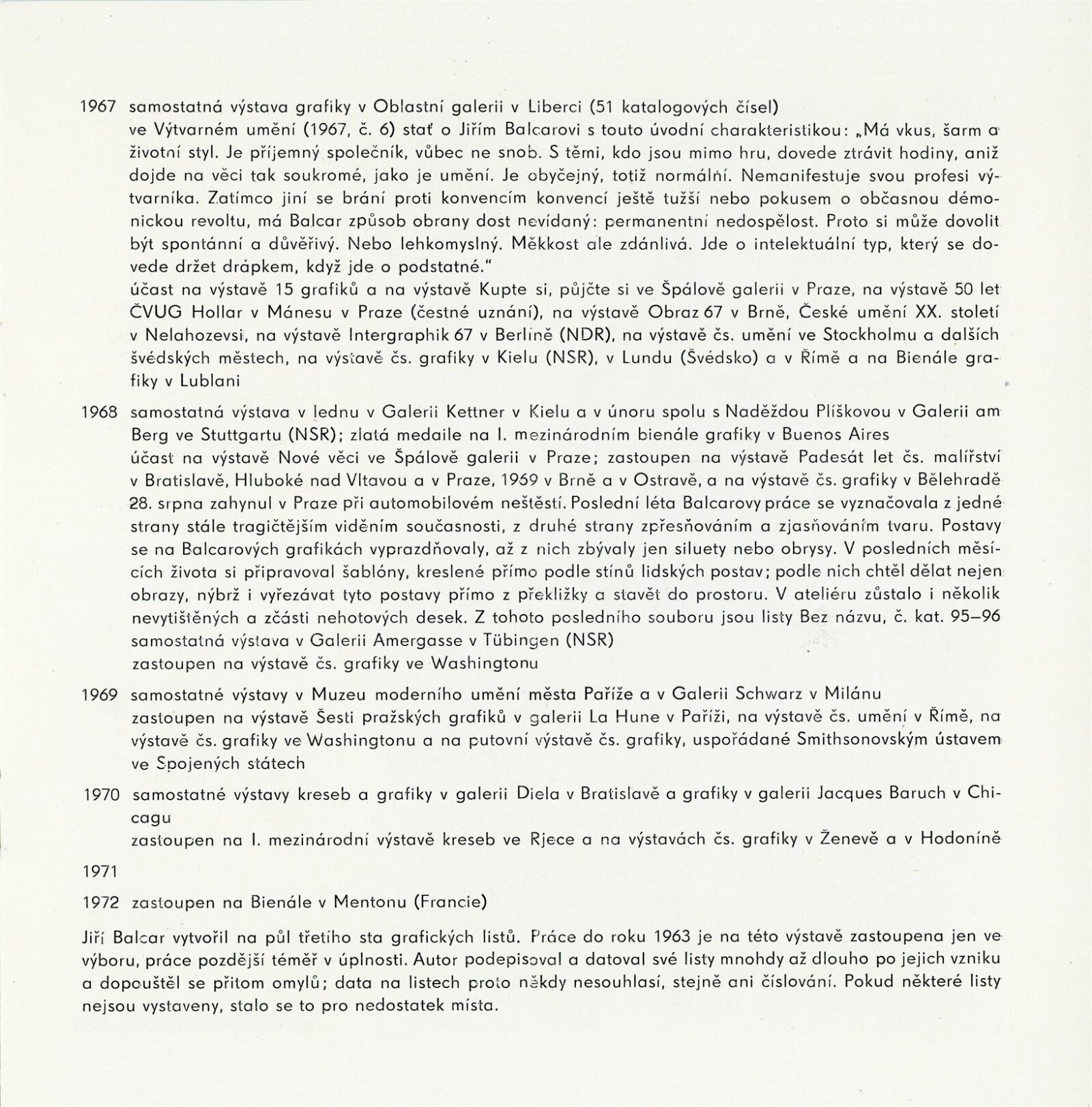 Jiří Balcar. Grafická tvorba: Dům umění / Dům pánů z Kunštátu, 132. výstava Kabinetu grafiky, 2. 3. – 1. 4. 1973 / Text: Jaromíra Balcarová. – Brno: DUmB, 1973. – 16 s., obr., vystavená díla 2 s., životopis, DPK 531. – MG; MMB