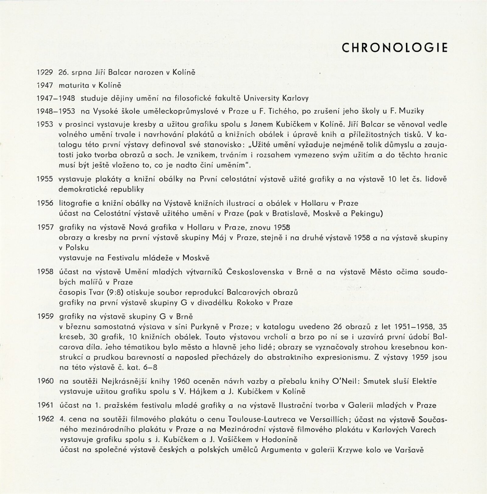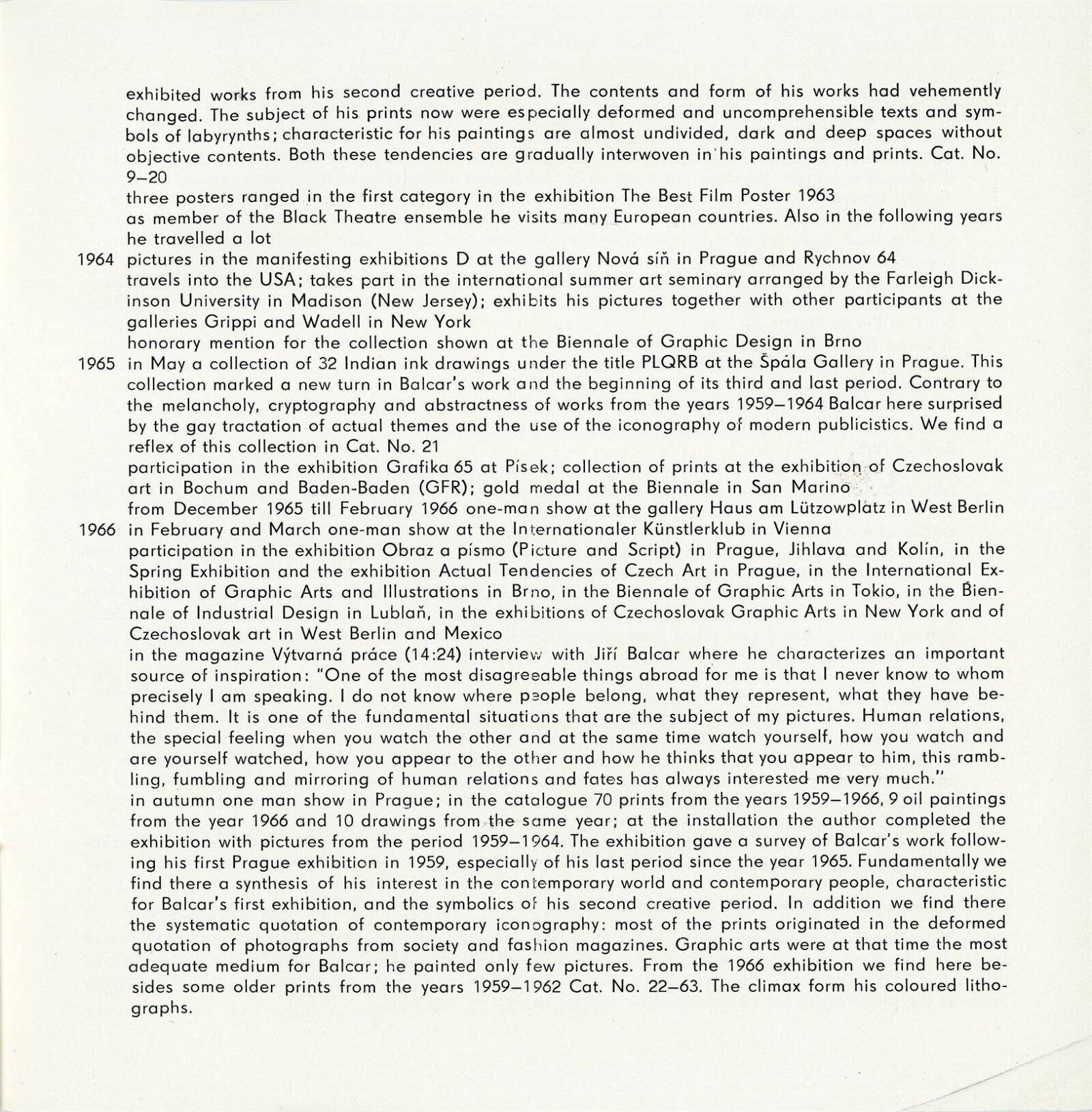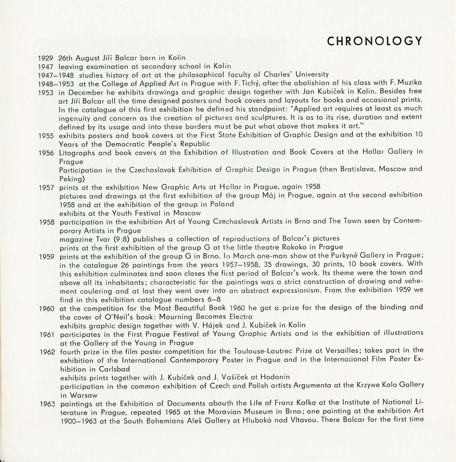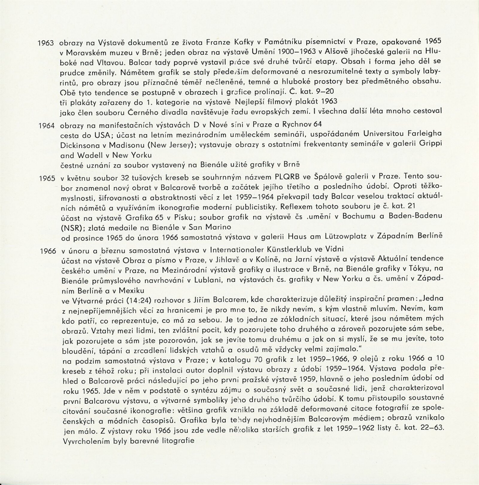 pozvánka, katalog, seznam vystavených děl, biografie, fotografie z vernisáže, dopis (Jaromíry Balcarové), provozní korespondence, podklady pro katalog, povolení tisku katalogu, žádost o povolení výstavy, recenze v tisku