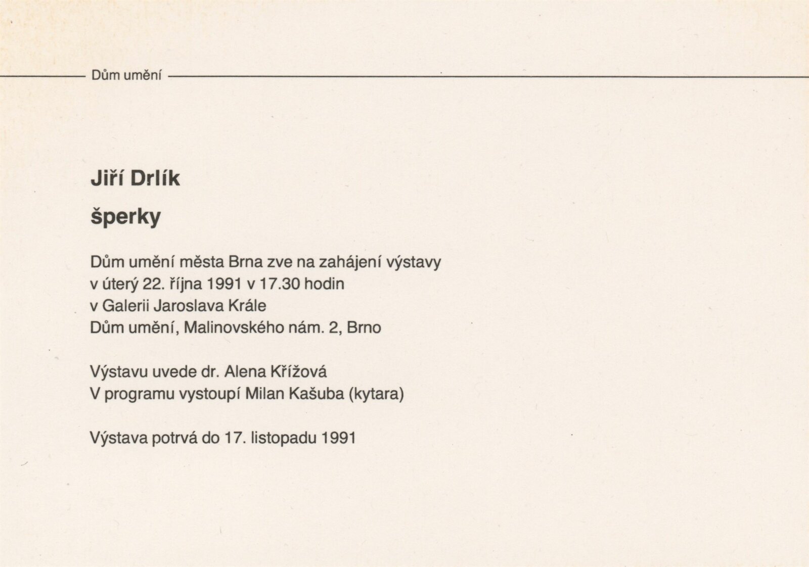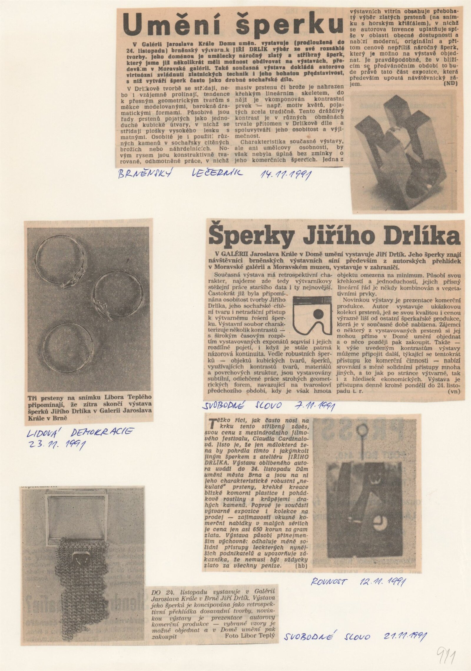 Jiří Drlík. Šperky: Dům umění města Brna, 1. patro, 22. 10. – 24. 11. 1991 / Text: Alena Konečná. – Brno: Jiří Drlík, 1991. – [16] s., obr., životní data, výstavy, DU 911