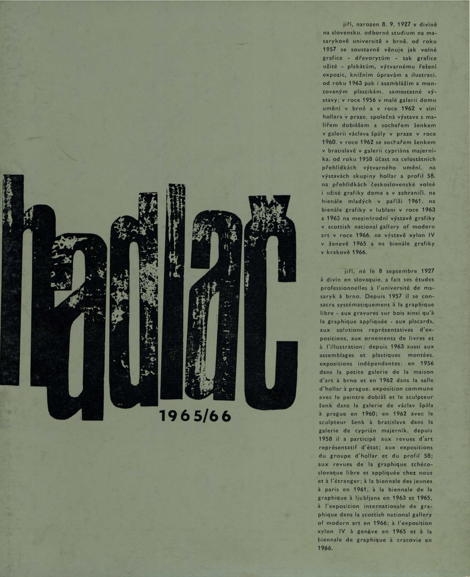 Jiří Hadlač. Výstava dřevorytů a objektů: Dům umění města Brna / Dům pánů z Kunštátu, 76. výstava Kabinetu grafiky, 30. 9. – 30. 10. 1966 / Text: Igor Zhoř. – Brno: DUmB, 1966. – 8 s., obr., seznam vystavených prací 2 s., DPK 312. – MZK; MMB
