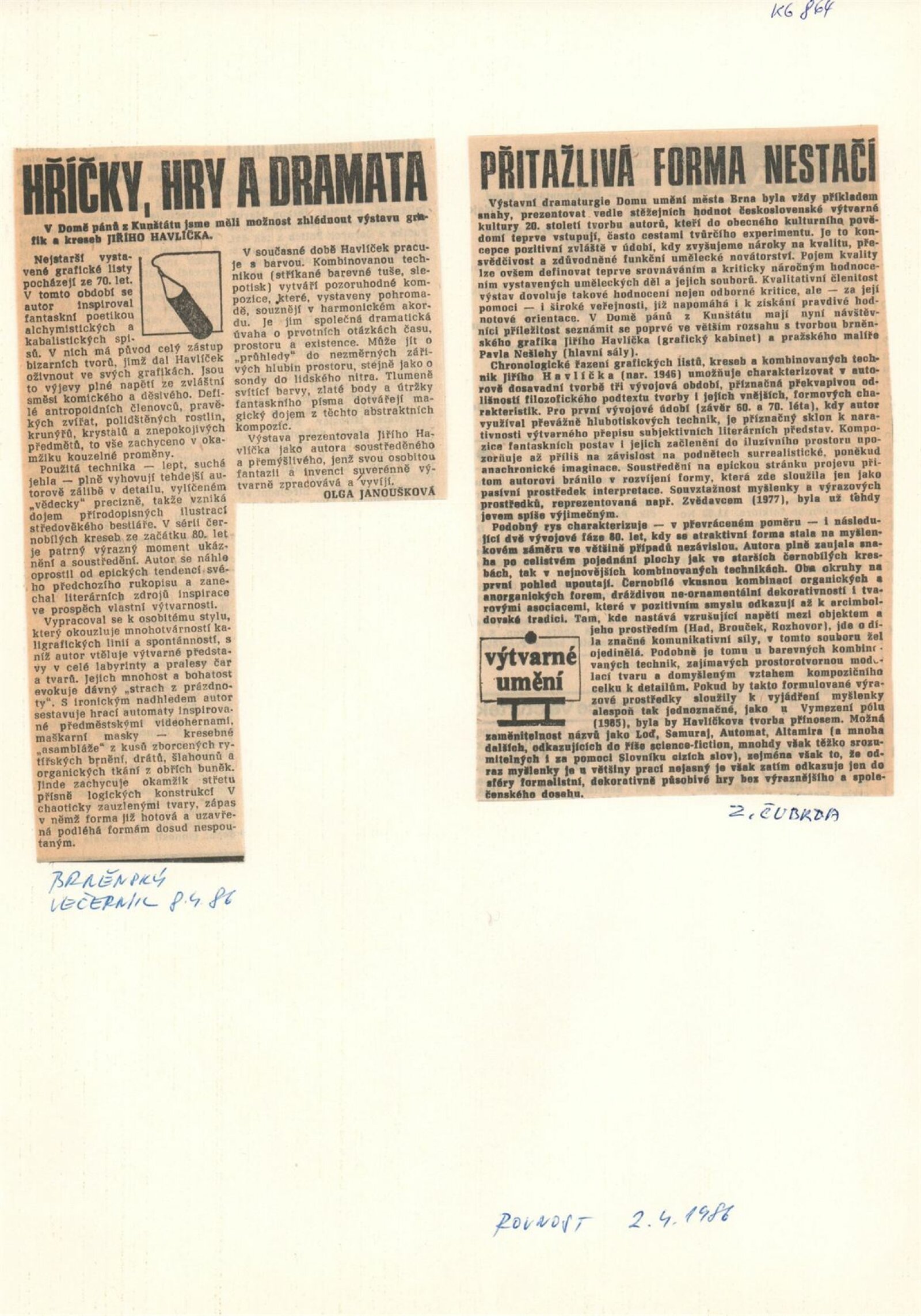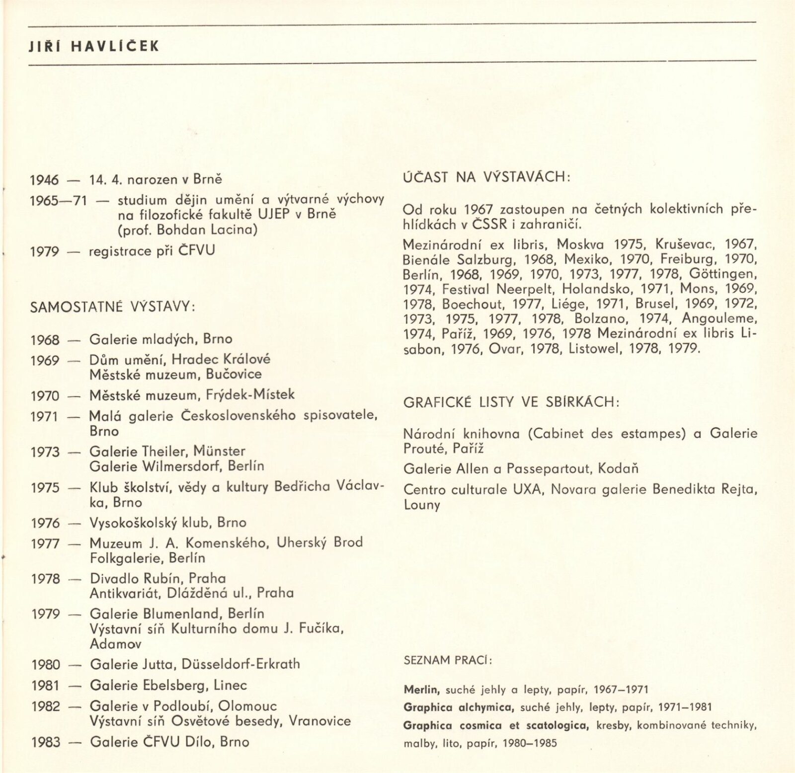 pozvánka, katalog, strojopis a fotografie ke katalogu, provozní korespondence, žádost o povolení výstavy, recenze v tisku, katalog k výstavě Jiřího Havlíčka v Galerii v Podloubí v Olomouci (1982)