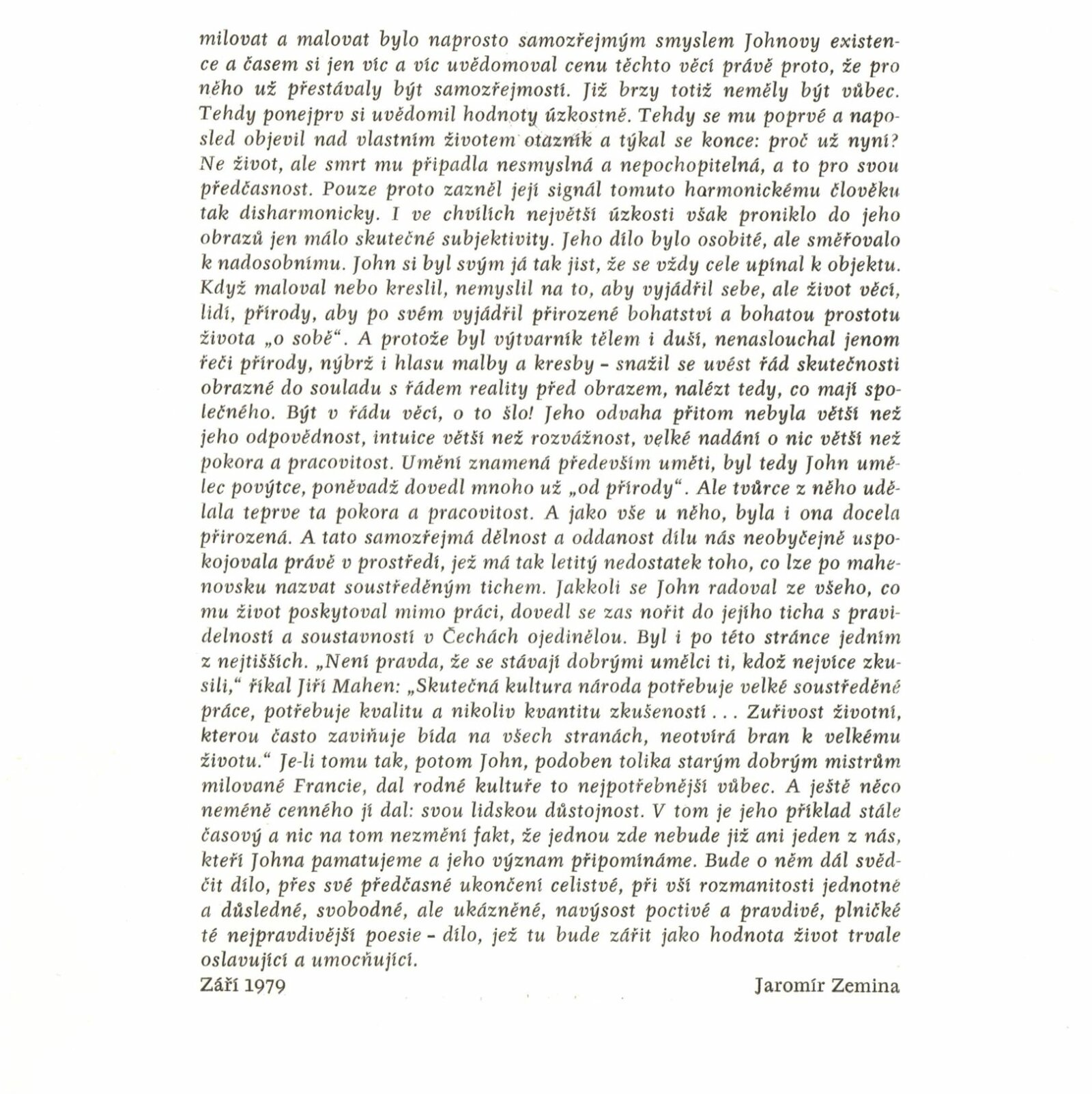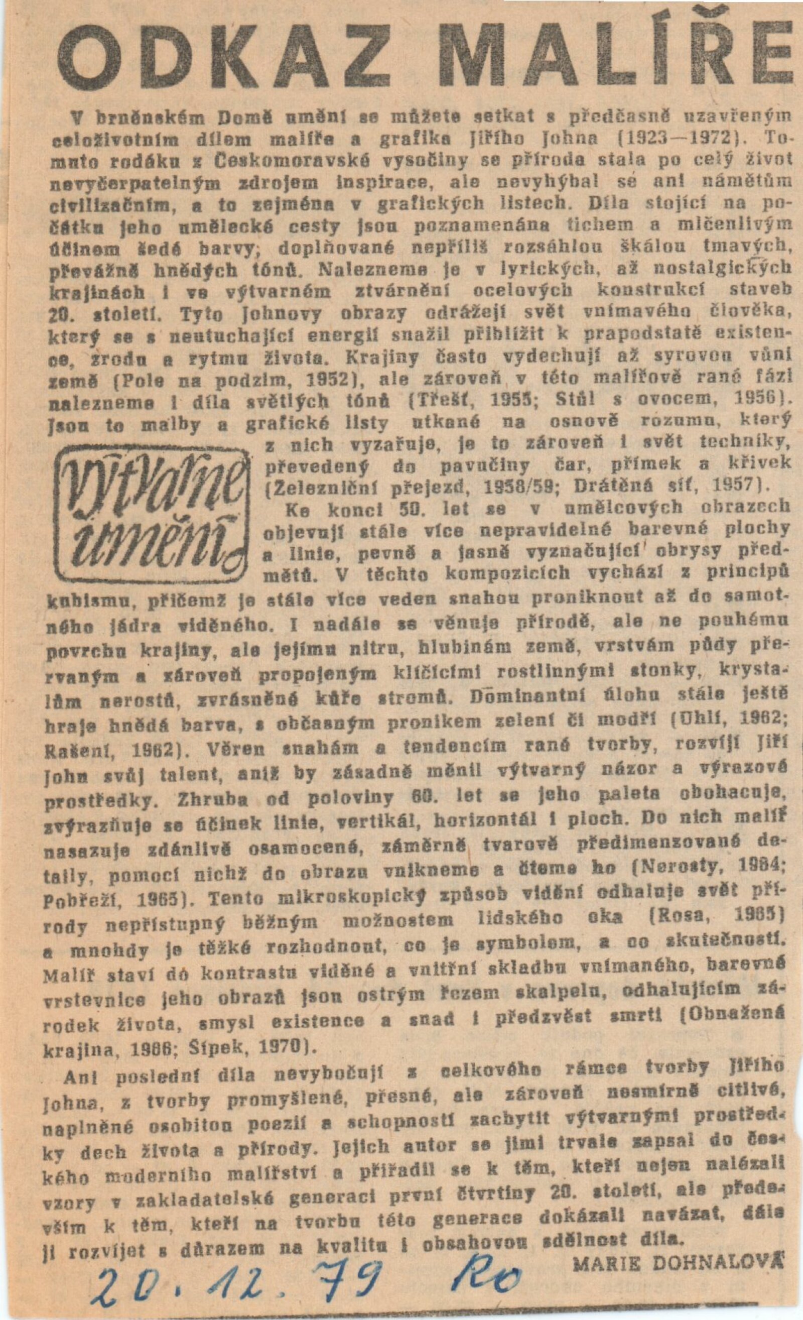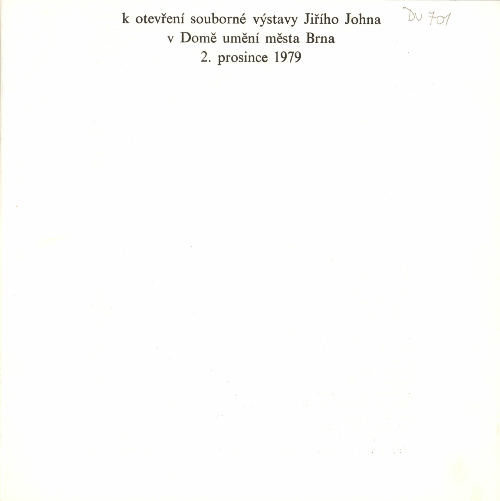 Jiří John. Malba, kresba, grafika: Dům umění města Brna 2. 12. 1979 – 7. 1. 1980 / Text Jiří Šetlík. - Brno: DUmB, - 17 s., obr. + Seznam vystavených prací 1 skládačka 6 s. Portrét, životopis. K vernisáži vyšla skládačka s textem Jaromíra Zeminy. K otevření souborné výstavy Jiřího Johna v Domě umění města Brna 2. 12. 1979 6 s. DU 701; MG; MMB