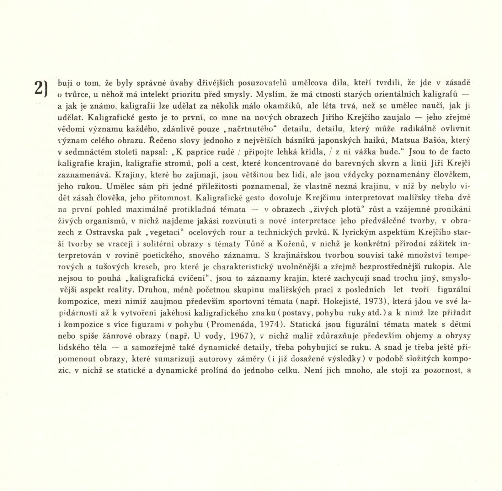 Jiří Krejčí. Obrazy a kresby z posledních dvou desetiletí: Dům umění / Dům pánů z Kunštátu, 15. 2. – 14. 3. 1976 / Text: Jiří Valoch. – Brno: DUmB, 1976. – 20 s., obr., resumé a katalog 4 s., DPK 623. – MZK; MG; MMB
