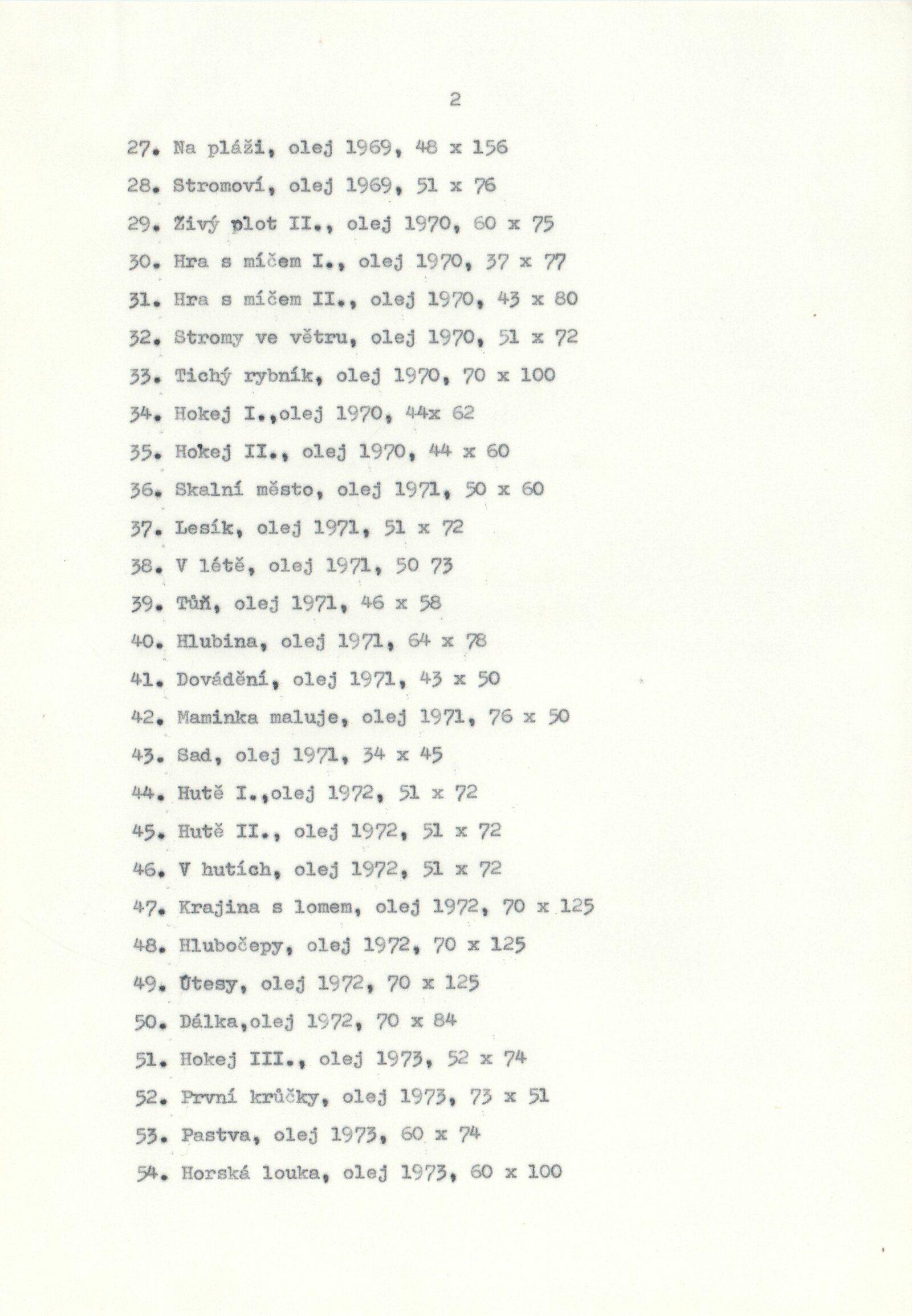 pozvánka, katalog, leták, fotografie výstavy, seznam vystavených děl, strojopis textu pro katalog + překlad (AJ, RJ), provozní korespondence (termín výstavy), vyjádření SČVU, žádost o výstavu – autor, žádost o povolení výstavy, recenze v tisku, katalog (Galerie D 1974, Galerie bratří Čapků 1972, Topičův salón 1948)