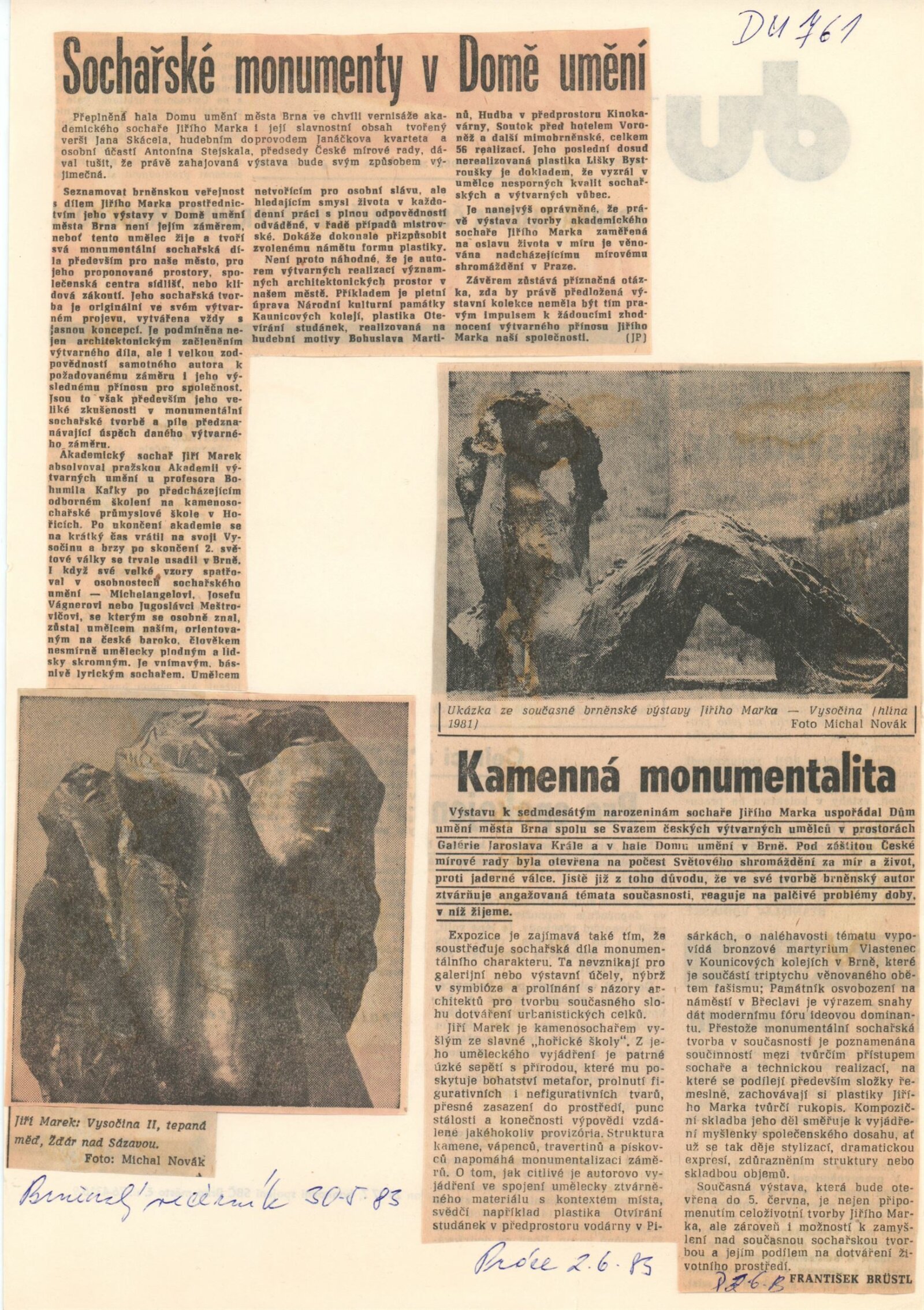 Jiří Marek. Monumentální sochařská tvorba: Dům umění města Brna, Galerie Jaroslava Krále, hala, 10. 5. – 5. 6. 1983 / Texty: Zdeněk Čubrda a autor. – Brno: DUmB, 1983. – 28 s., obr., portrét, životopis, přehled realizací v architektonickém začlenění, DU 761. – MZK; MG; MMB