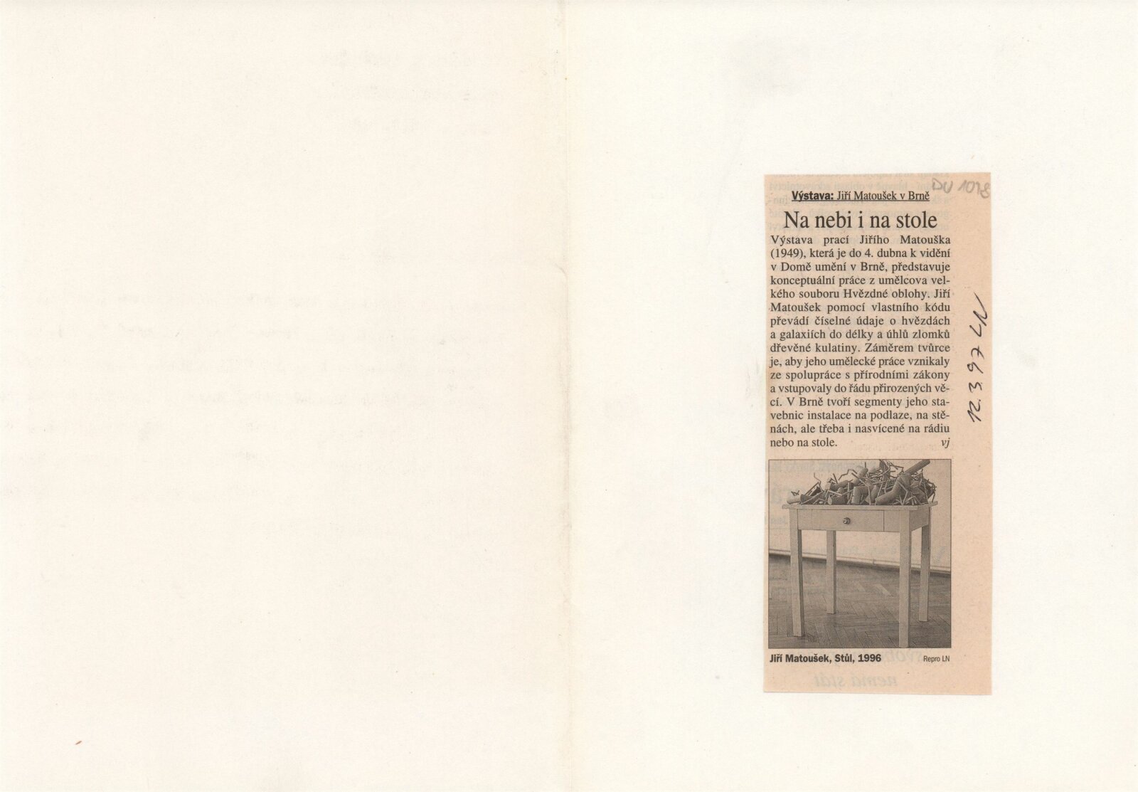 Jiří Matoušek: Dům umění města Brna, Procházkova síň, 7. 3. – 30. 3. 1997 / Text: Jiří Valoch. – DU 1048