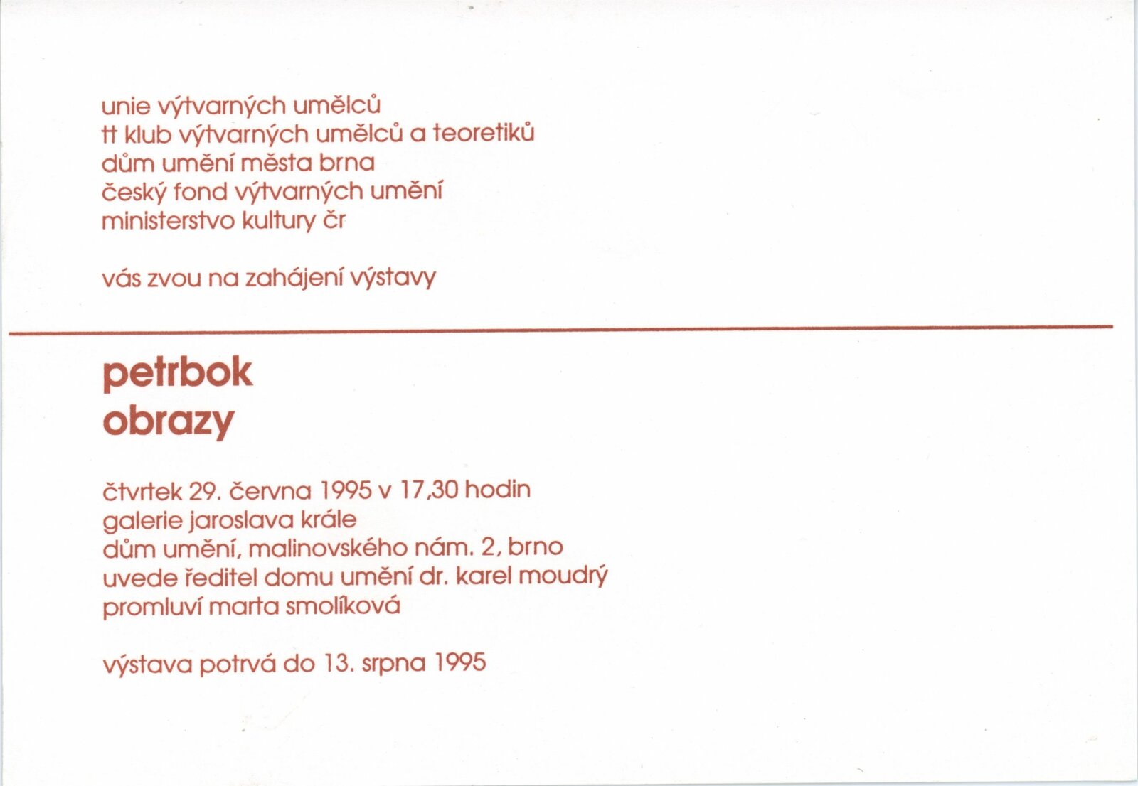 Jiří Petrbok. Obrazy: Galerie Jaroslava Krále, 194. výstava 29. 6. – 13. 8. 1995. - Brno: UVU, - 1 skládačka (6 s., obr.) Životní data, výstavy DU 1001