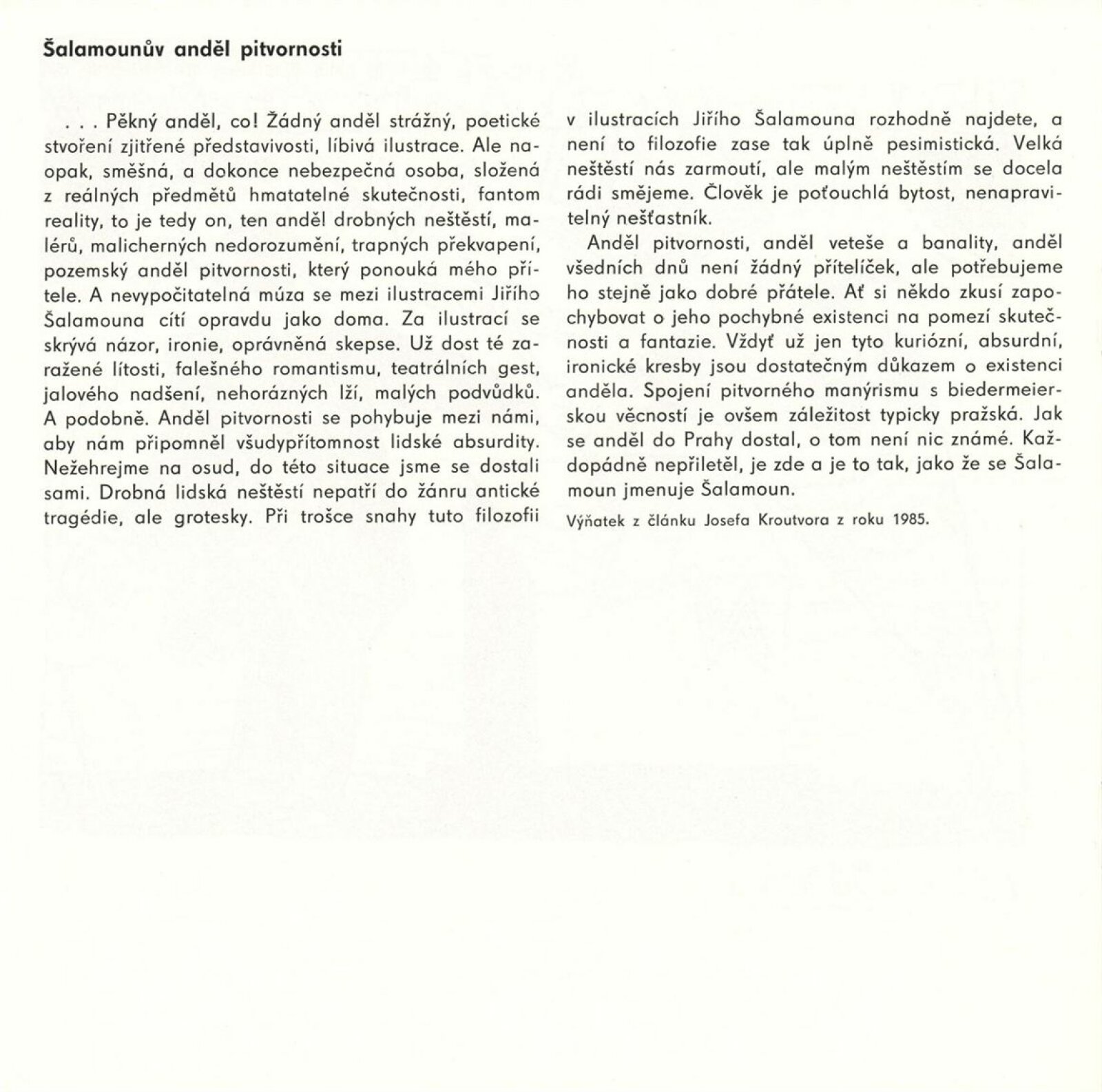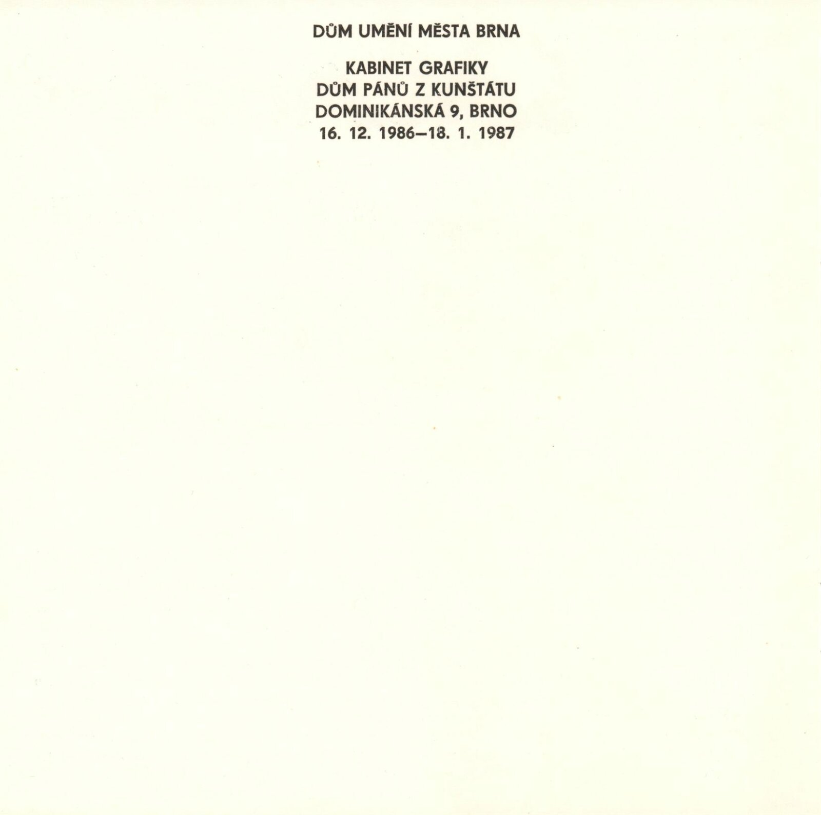 Jiří Šalamoun. Kresby atd.: Dům umění / Dům pánů z Kunštátu, Kabinet grafiky, 16. 12. 1986 – 18. 1. 1978 / Text: Jaromír Zemina. – Brno: DUmB, 1986. – [21] s., obr., životní data, DPK 878. – MZK; MG; MMB
