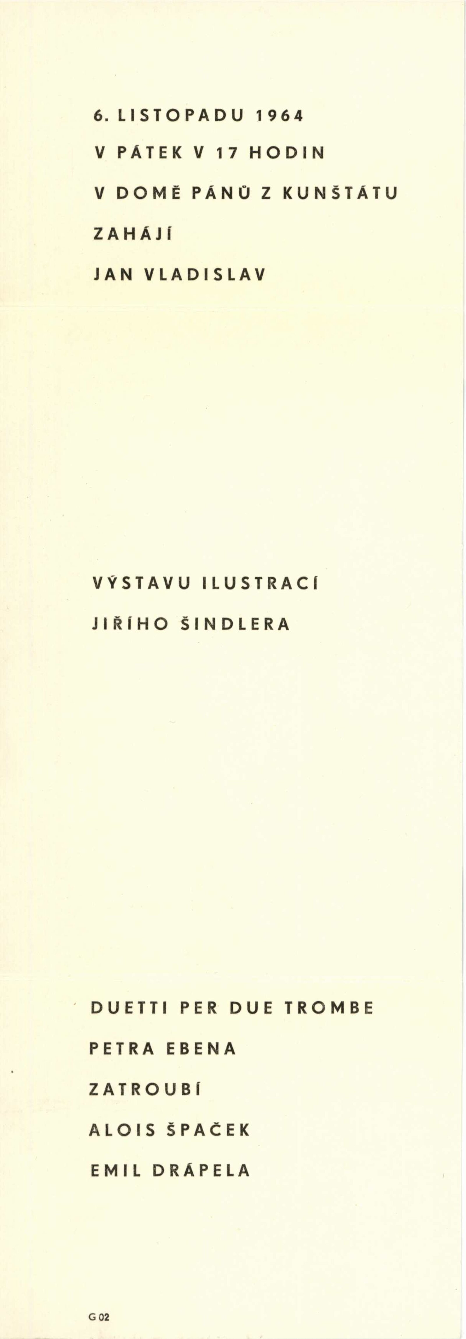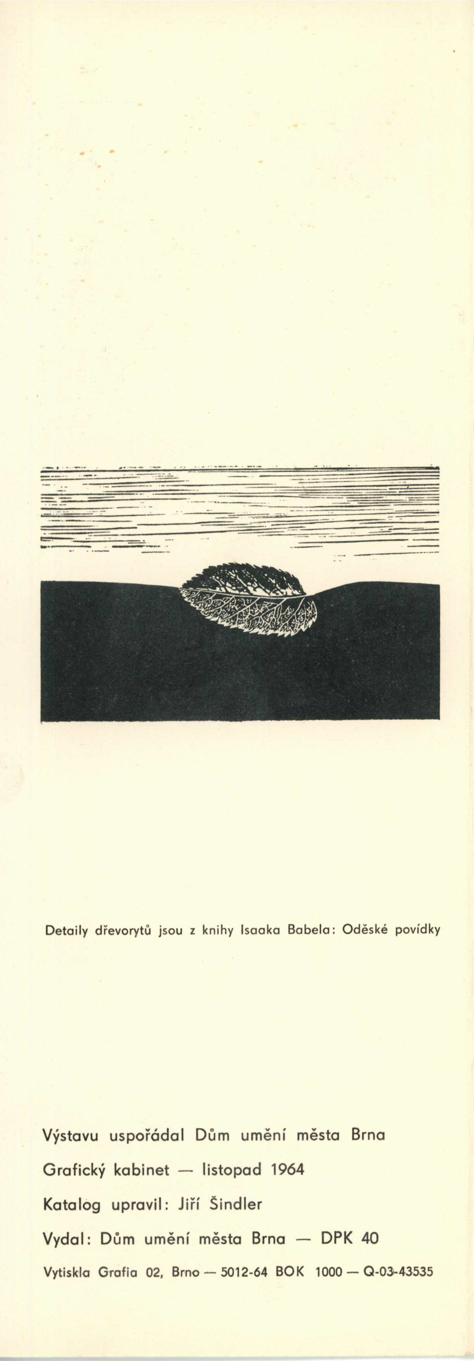 Jiří Šindler. Ilustrace: Dům umění města Brna / Dům pánů z Kunštátu, 59. výstava Kabinetu grafiky, 6. 11. – 29. 11. 1964 / Text: Jan Vladislav. – Brno: DUmB, 1964. – skládačka, 6 s., obr., životní data, seznam ilustrací, DPK 243. – MZK; MG; MMB