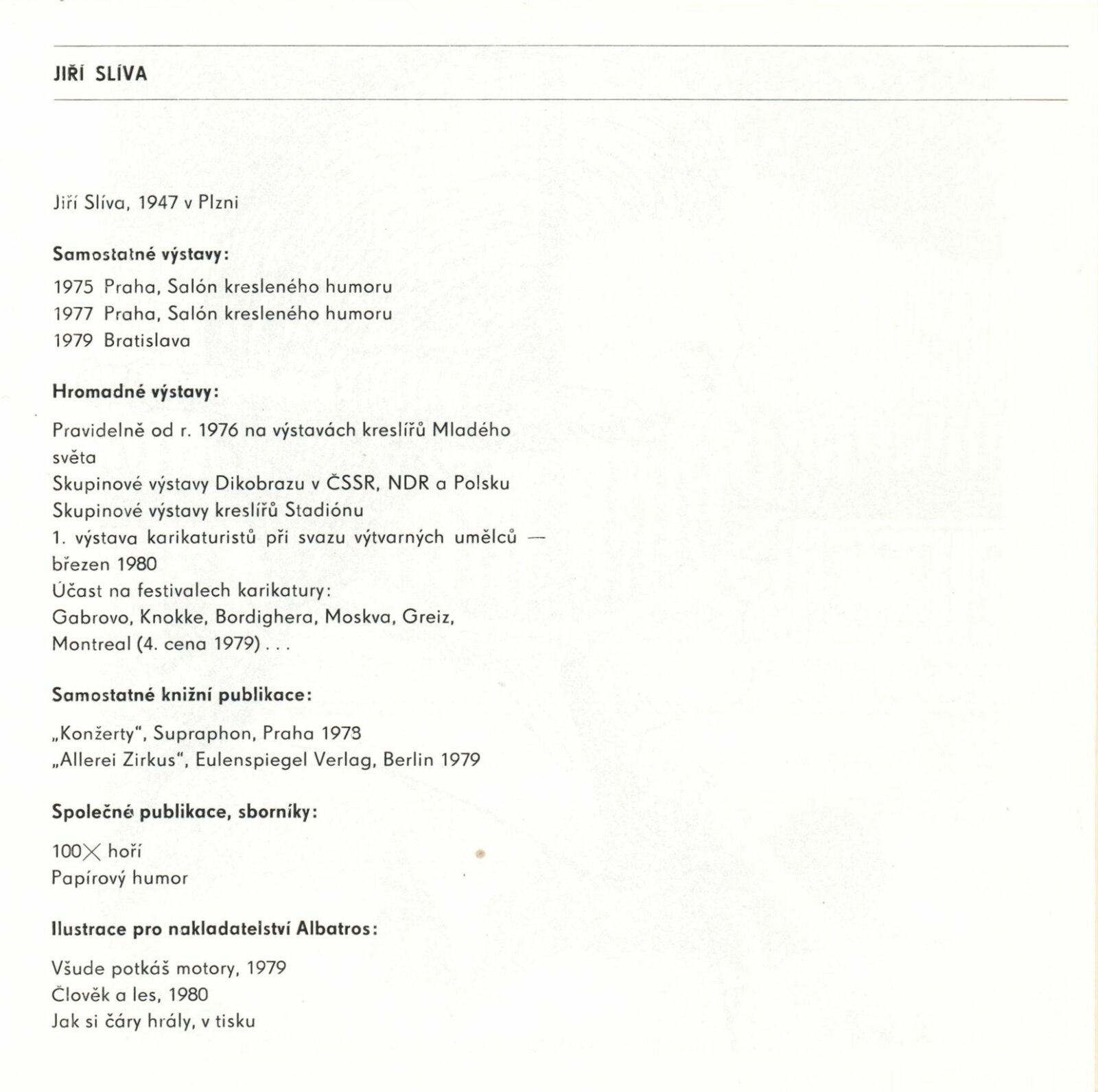 Jiří Slíva. Kreslený humor: Dům umění / Dům pánů z Kunštátu, 190. výstava Kabinetu grafiky, 12. 12. 1980 – 11. 1. 1981 / Text: Josef Kobra Kučera. – Brno: DUmB, 1980. – 12 s., obr., životní data, výstavy, knižní publikace, ilustrace, DPK 747. – MZK; MG; MMB