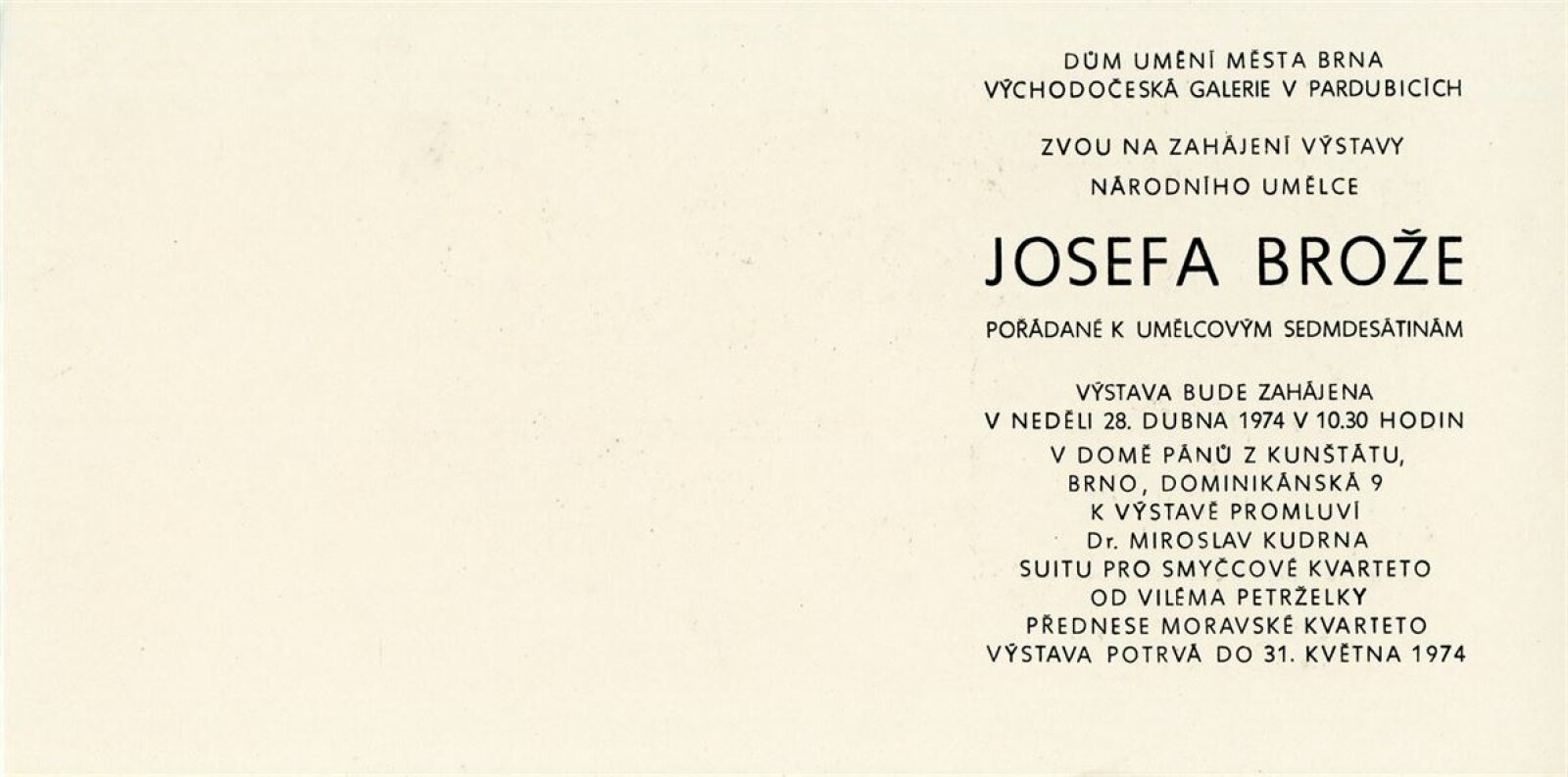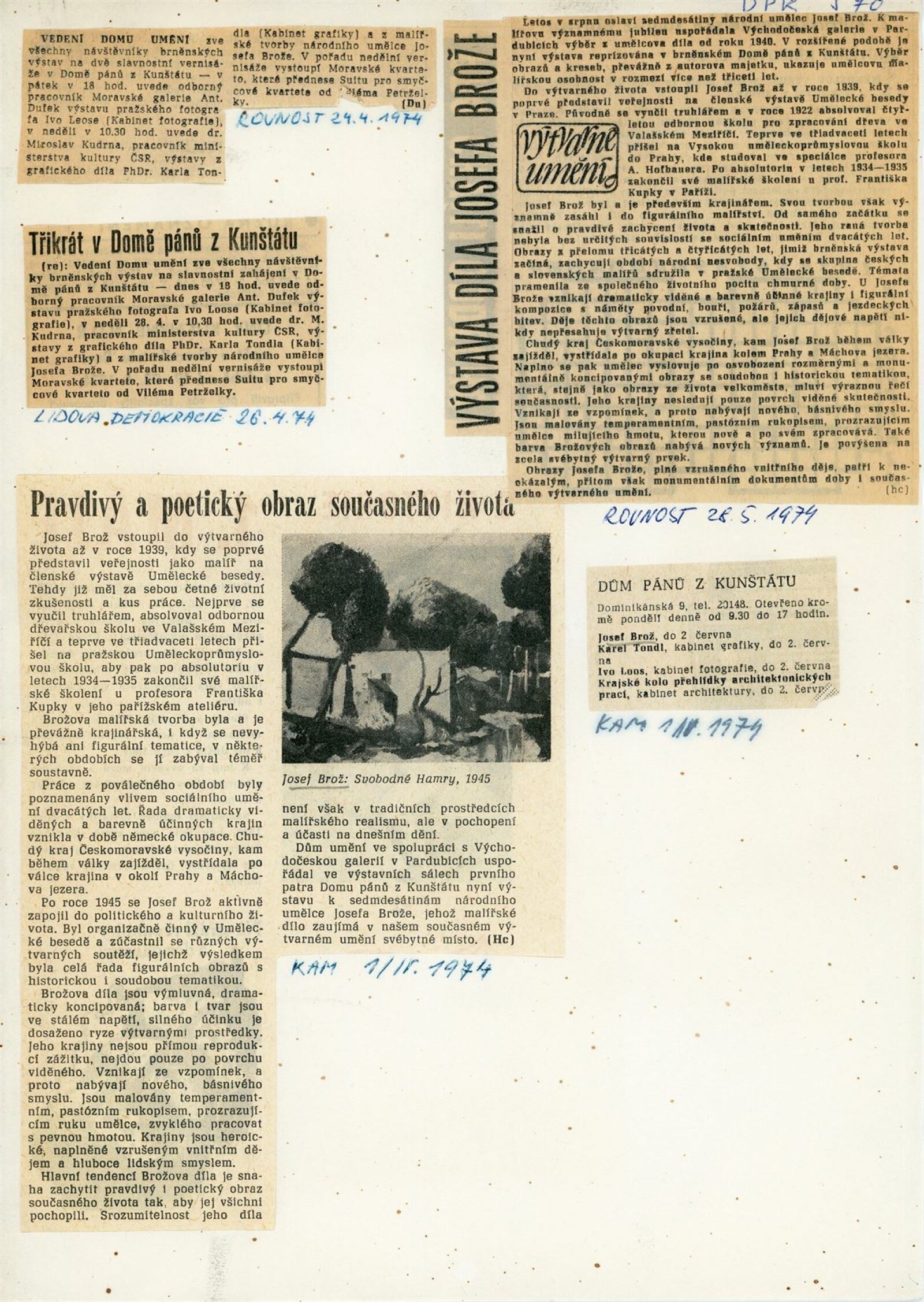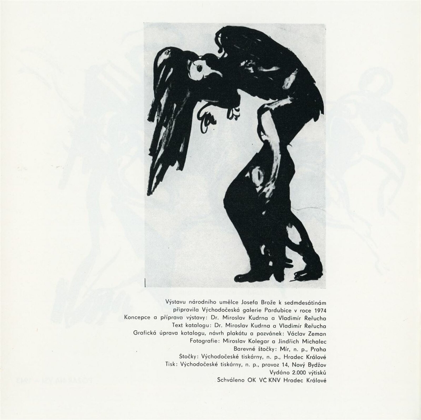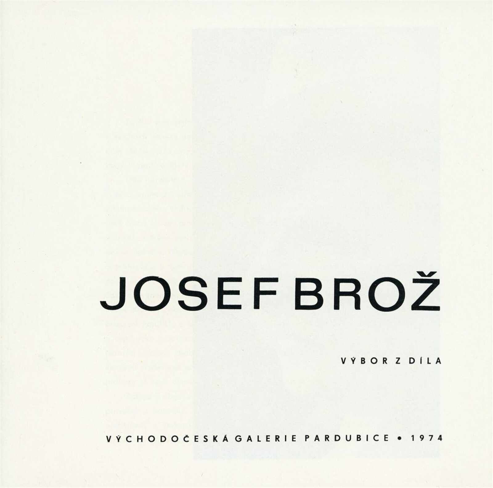 Josef Brož: Dům umění / Dům pánů z Kunštátu, 28. 4. – 31. 5. 1974 / Převzatý katalog. Josef Brož. Výbor z díla: Východočeská galerie, Pardubice, 1974 / Text: Vladimír Řeřucha, Miroslav Kudrna, báseň František Halas. – Pardubice: Východočeská galerie, 1974. – 32 s., obr., životopis, DPK 570. – MZK; MG