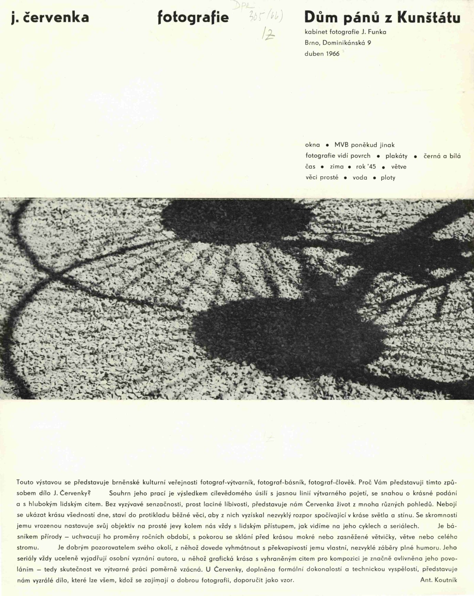 Josef Červenka. Fotografie: Dům umění města Brna / Dům pánů z Kunštátu, 73. výstava Kabinetu fotografie Jaromíra Funka, 1. 4. – 1. 5. 1966 / Text: Antonín Koutník. – Brno: DUmB, 1966. – skládačka, 6 s., obr., DPK 305. – MZK; MG; MMB