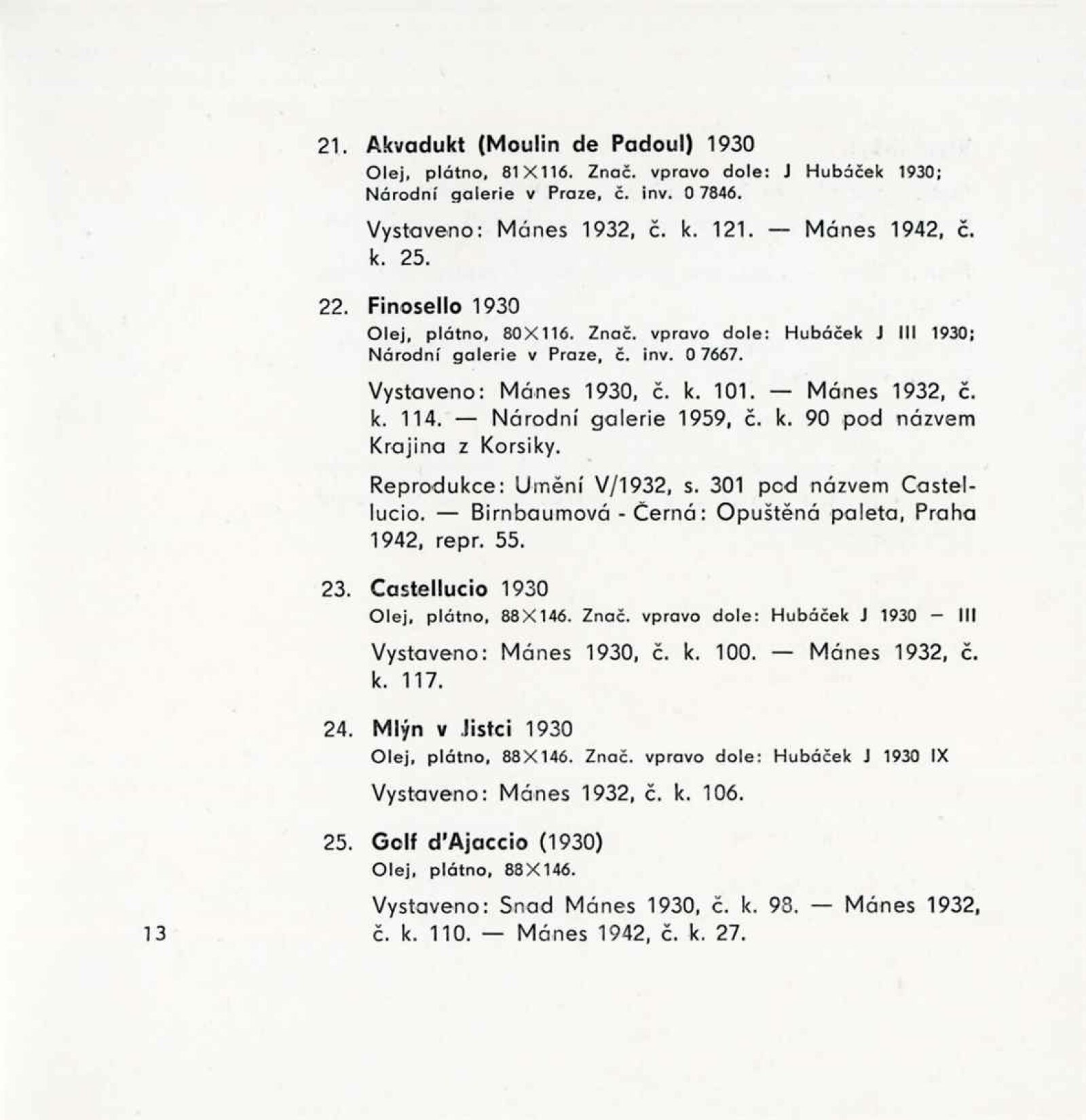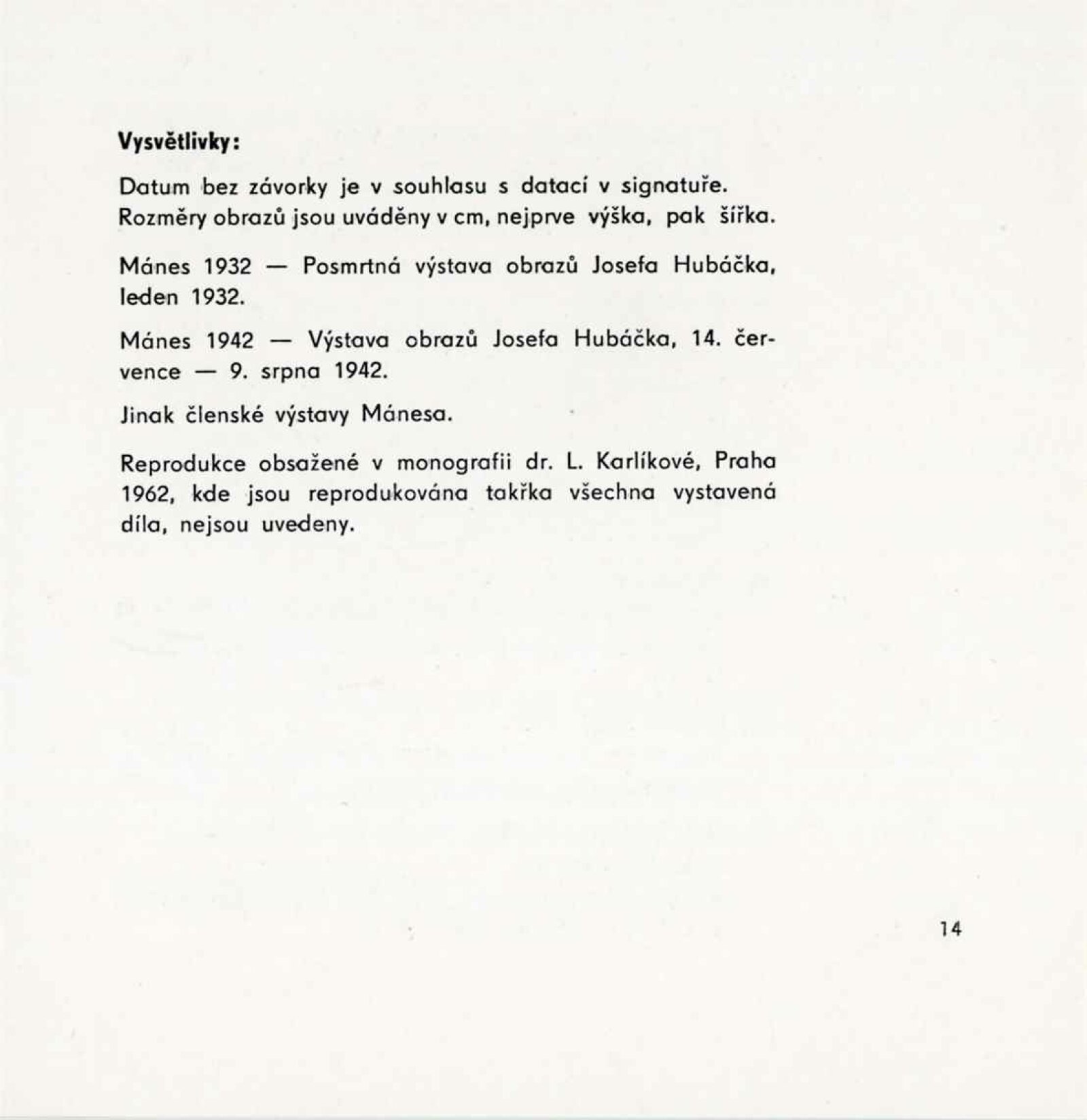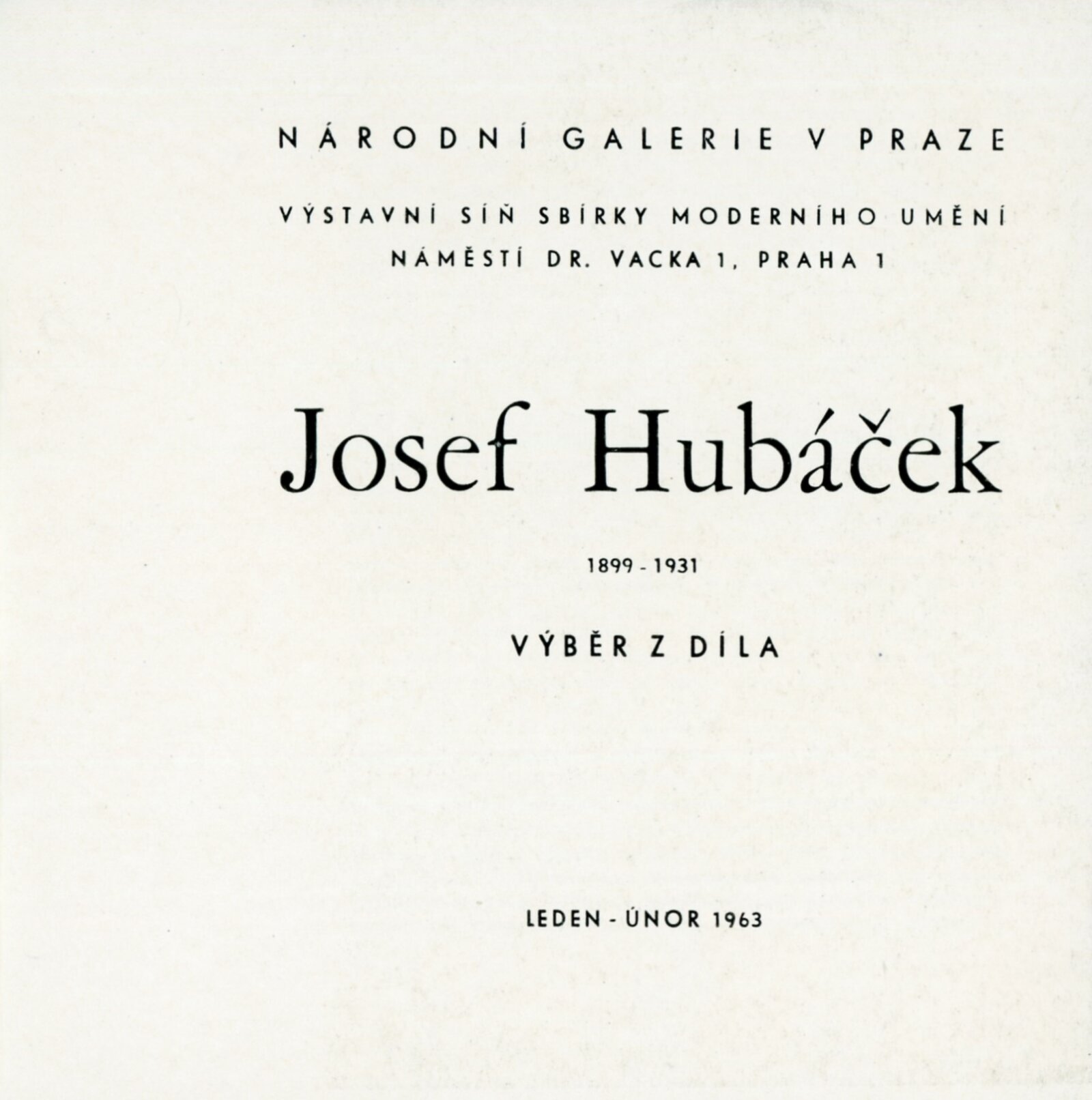 Josef Hubáček. 1899–1931. Výběr z díla: Dům umění, 1. patro, 23. 5. – 30. 6. 1963 / Převzatý katalog. Josef Hubáček. Výběr z díla: Praha, výstavní síň sbírky moderního umění Národní galerie, leden – únor 1963 / Text: Ludmila Karlíková. – Praha: Národní galerie, 1963. – 14 s., obr., DU 425