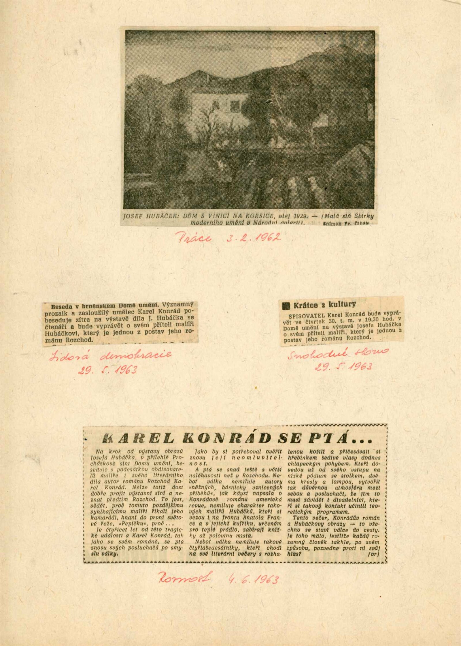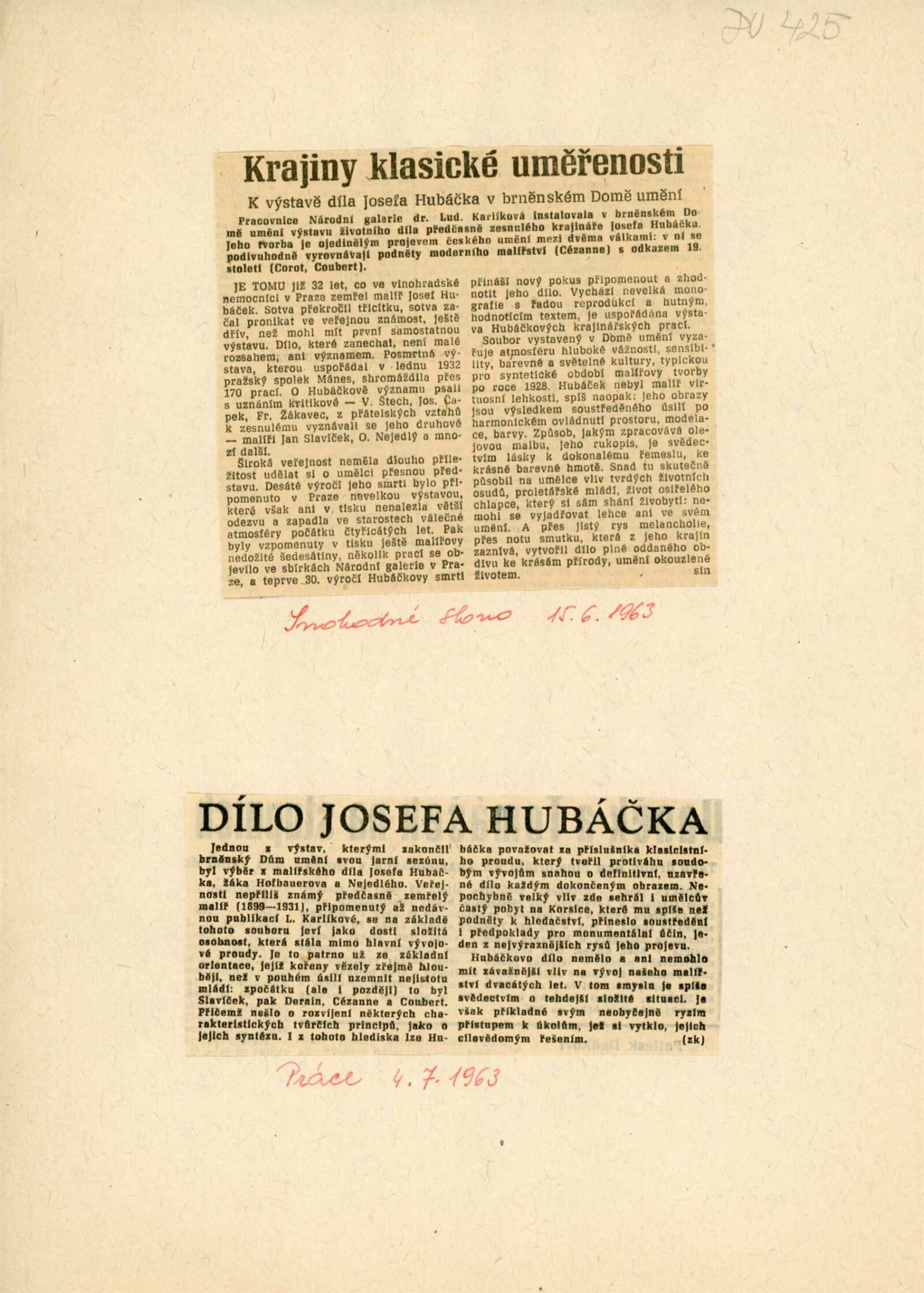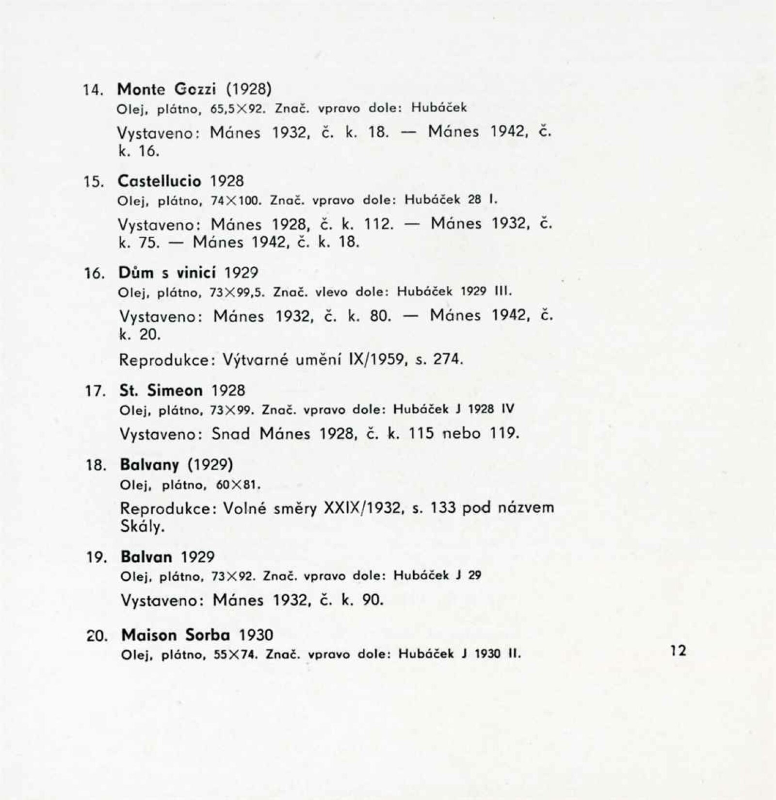 Josef Hubáček. 1899–1931. Výběr z díla: Dům umění, 1. patro, 23. 5. – 30. 6. 1963 / Převzatý katalog. Josef Hubáček. Výběr z díla: Praha, výstavní síň sbírky moderního umění Národní galerie, leden – únor 1963 / Text: Ludmila Karlíková. – Praha: Národní galerie, 1963. – 14 s., obr., DU 425