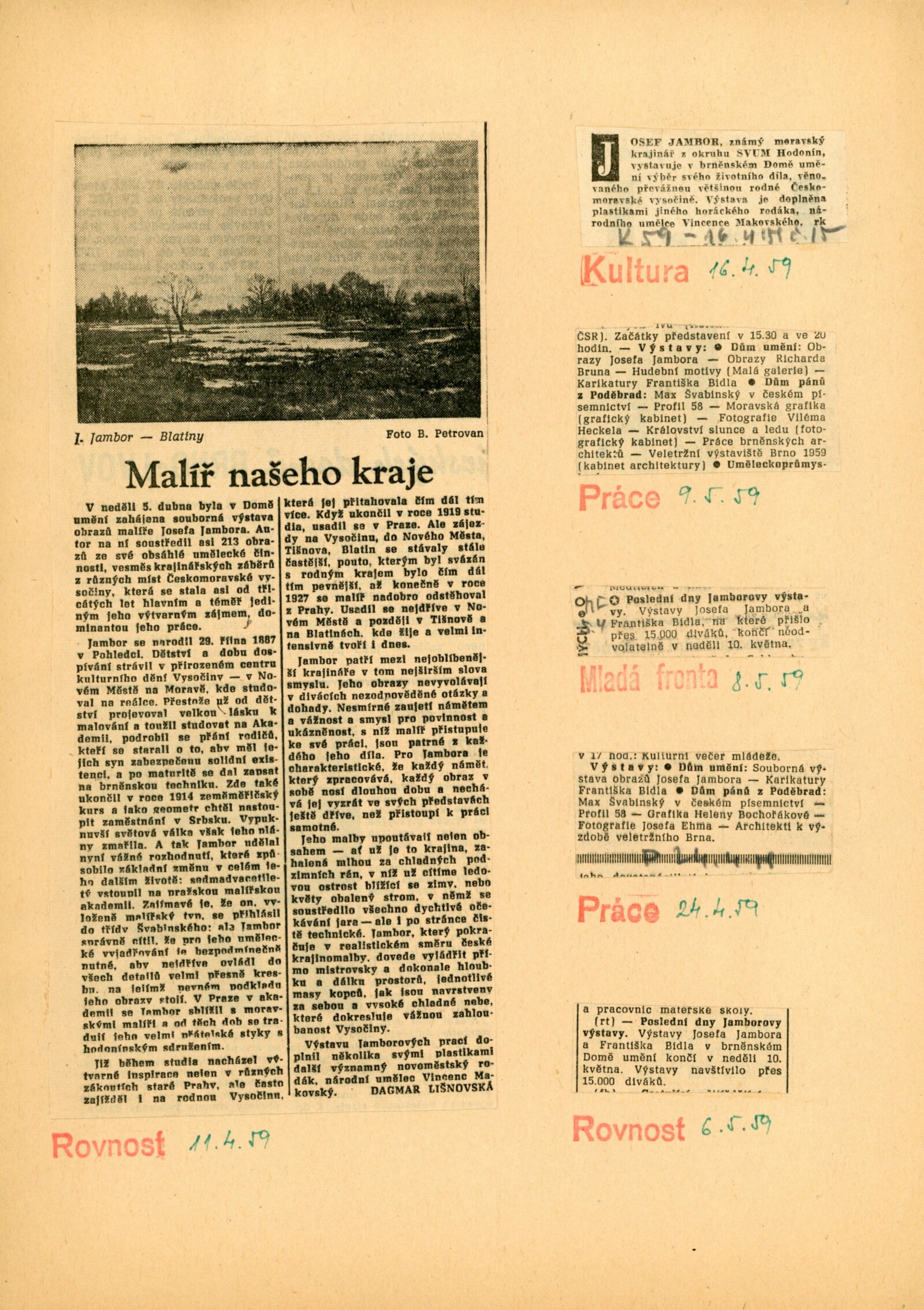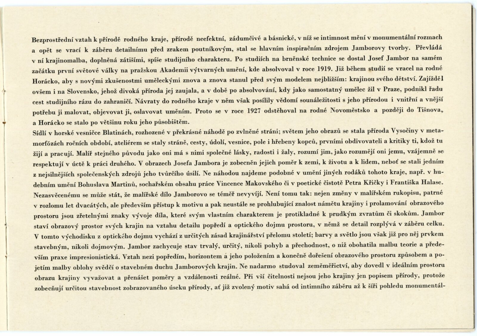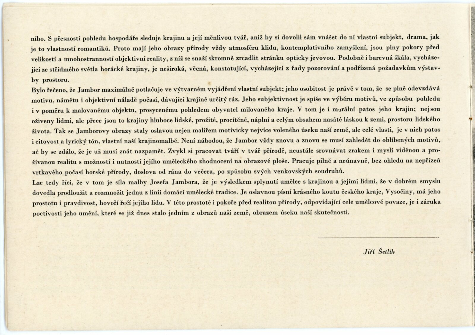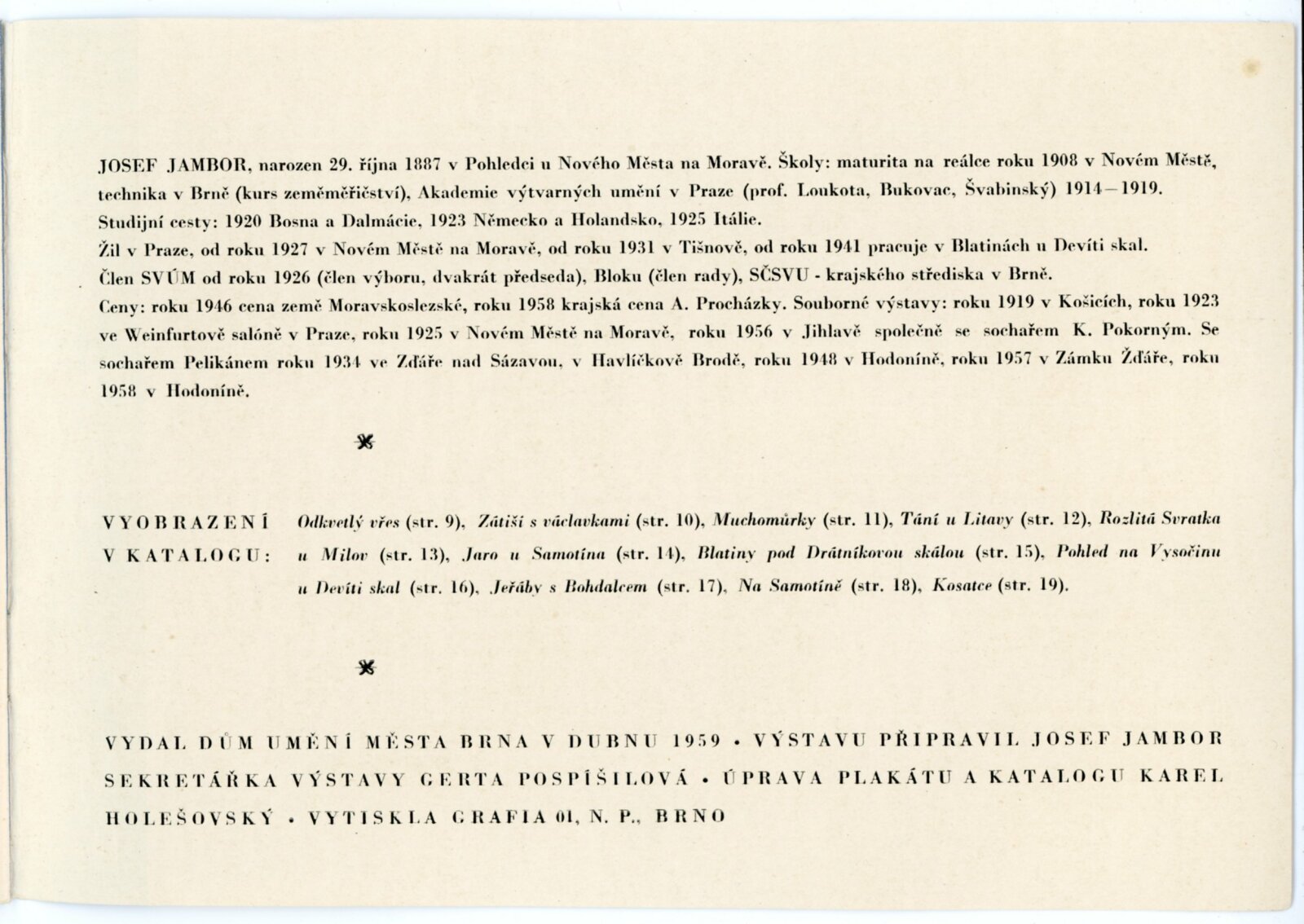 Josef Jambor: Dům umění města Brna, 5. 4. – 10. 5. 1959 / Text: Jiří Šetlík. – Brno: DUmB, 1959. – 20 s., obr., DU 329. – MZK; MG; AMB; MMB