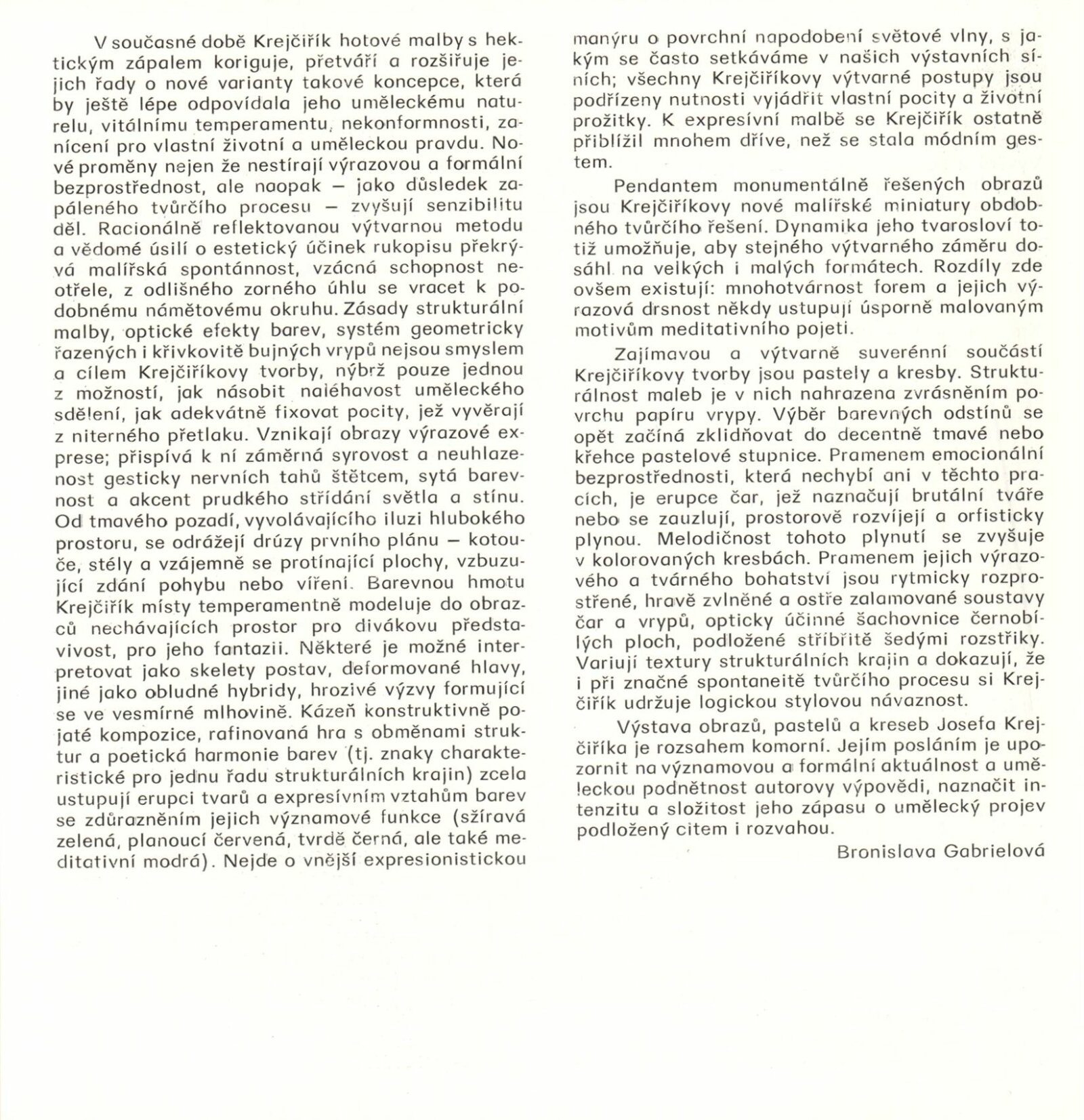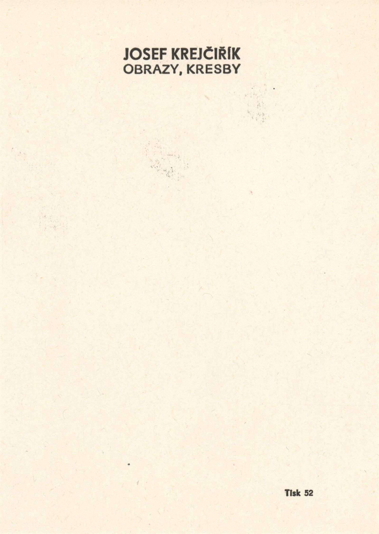 Josef Krejčiřík: Galerie Stará radnice, 28. 4. – 29. 5. 1988 / Text: Bronislava Gabrielová. – Brno: DUmB, 1988. – [12] s., obr., životní data, výstavy, GSR 25. – MZK; MG; MMB