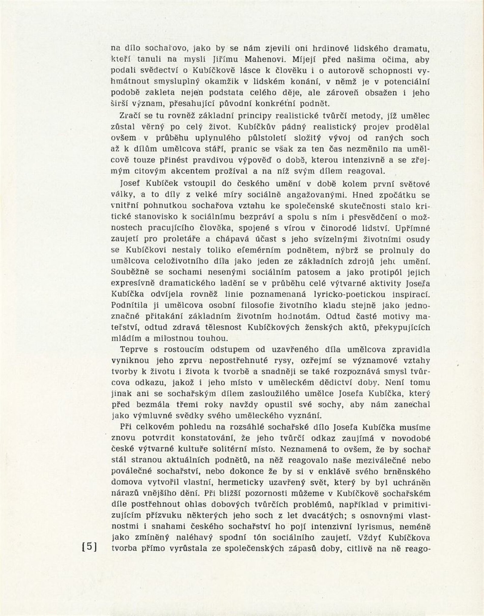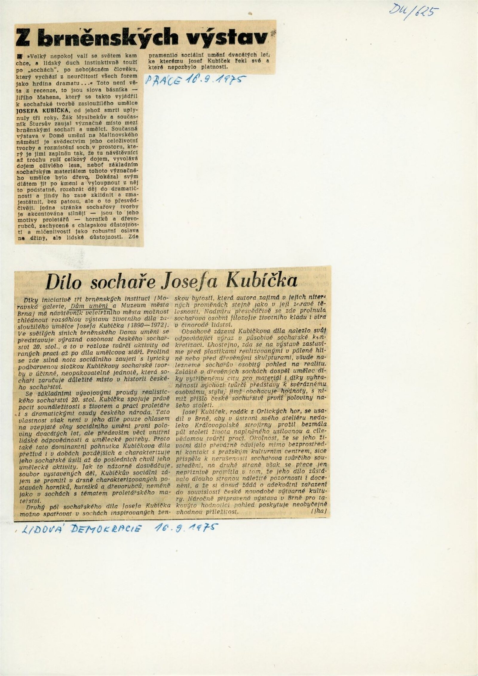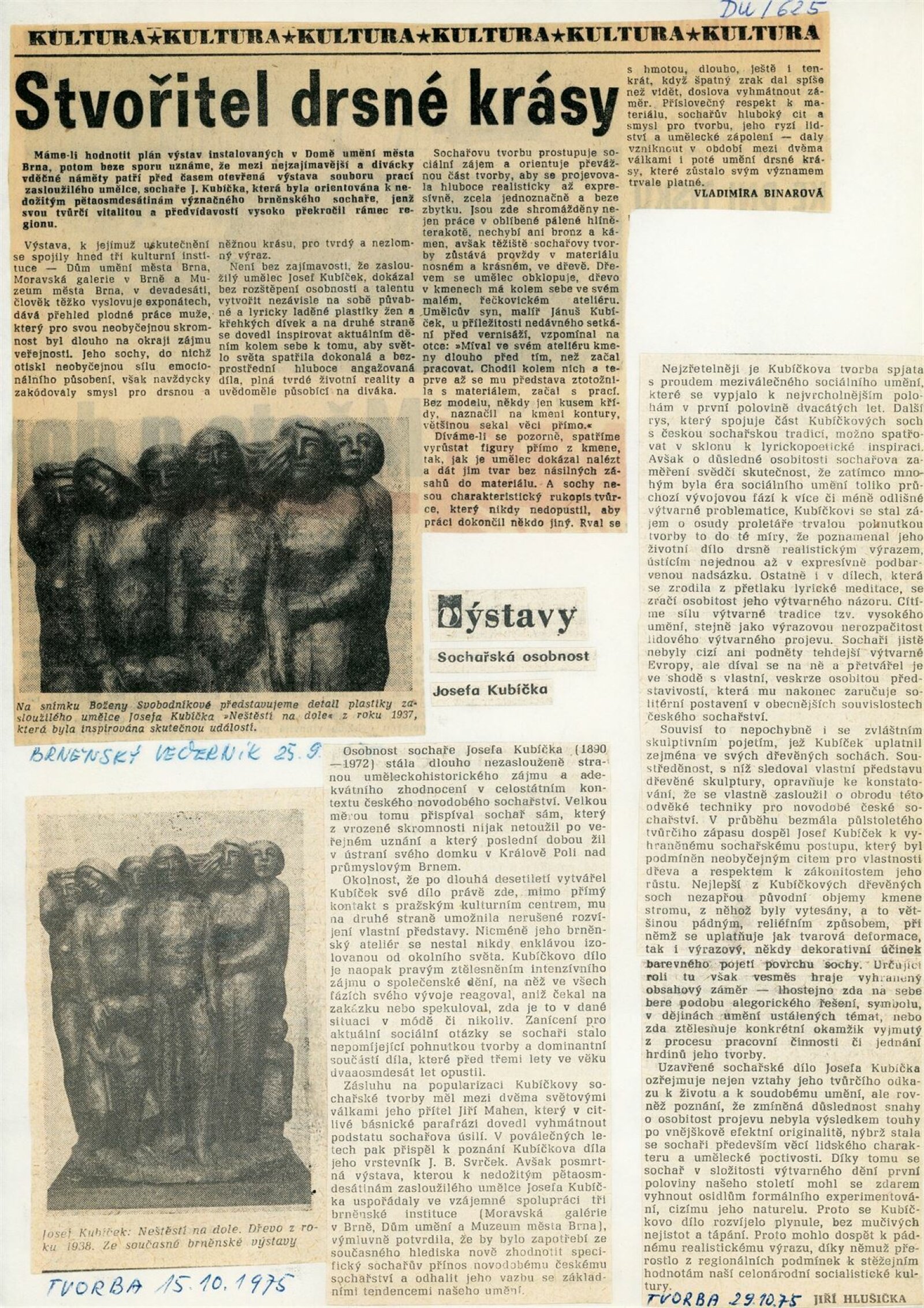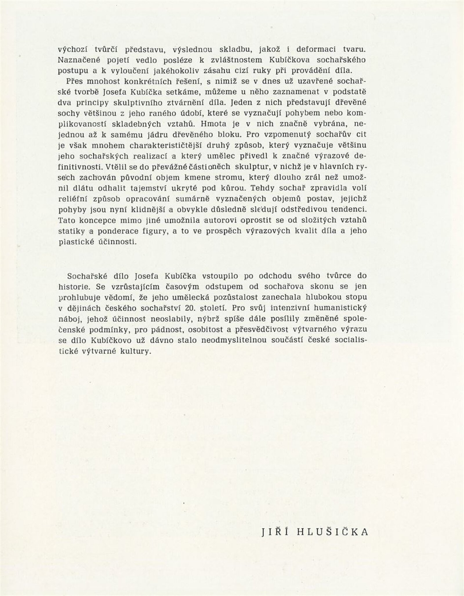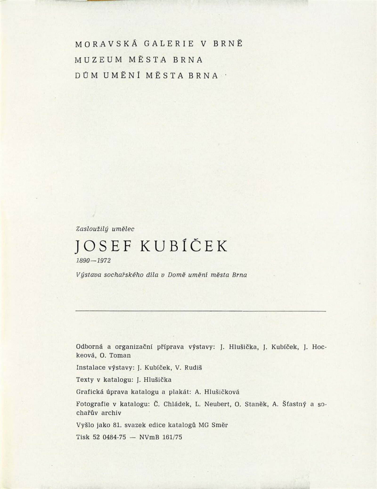 Josef Kubíček. 1890–1972. Výstava sochařského díla: Dům umění města Brna, 28. 8. – 1. 10. 1975 / Text: Jiří Hlušička. – Brno: Moravská galerie, 1975. – 17 s., obr., 21 s. obr, příl., DU 625. – Kubíček 7856; MZK; MG; MMB