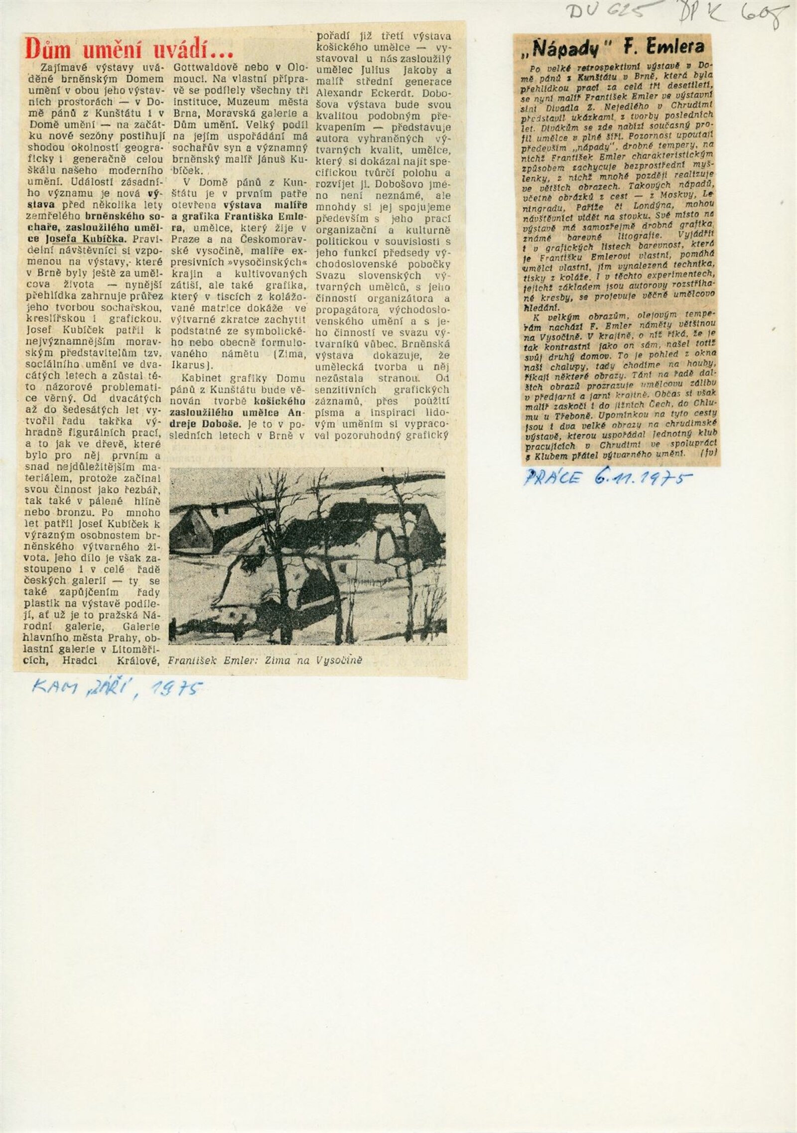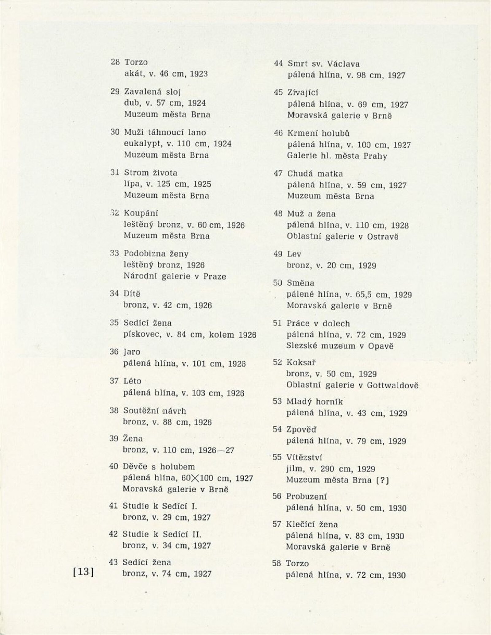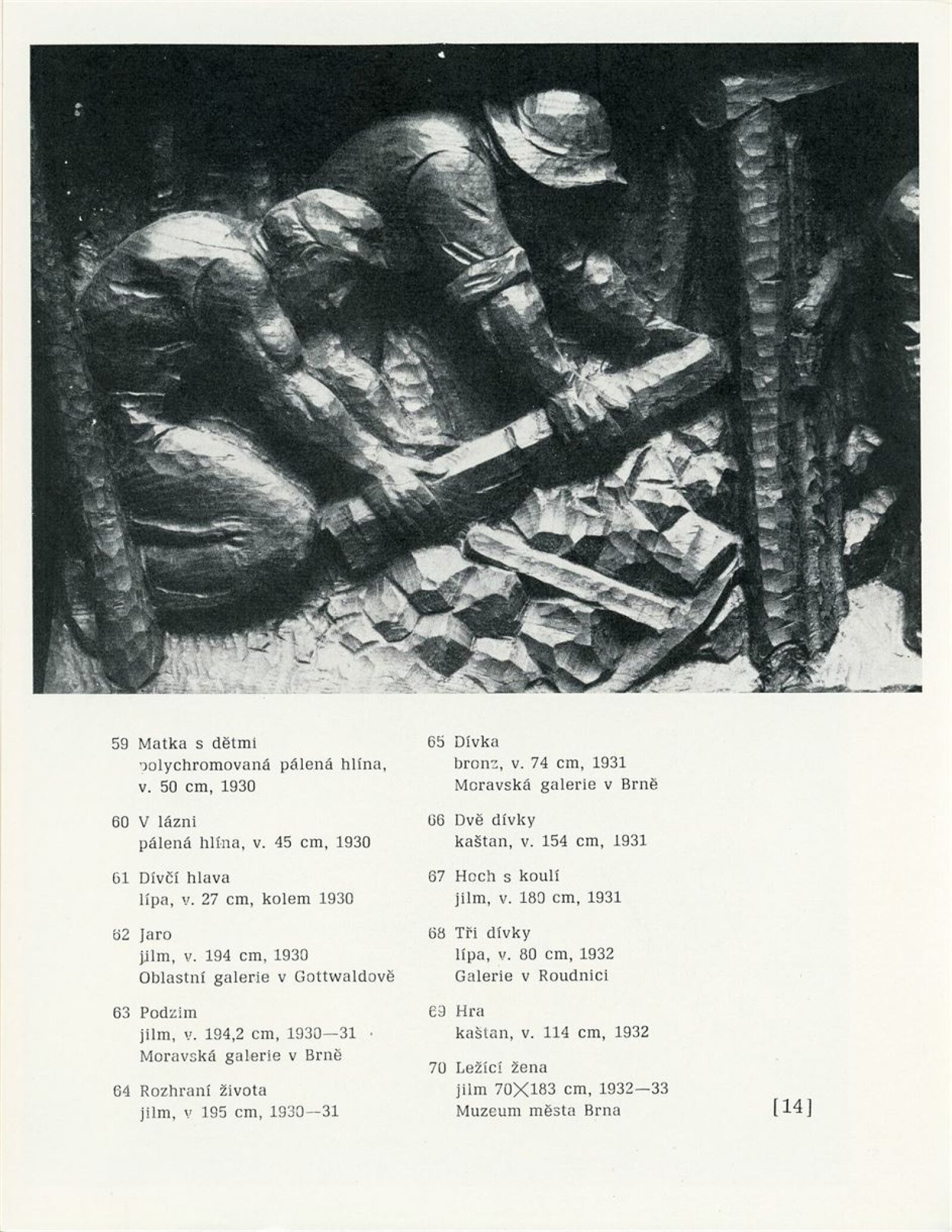 pozvánka, katalog, leaflet, originální dřevoryt, seznam vystavených prací, fotografie z vernisáže, provozní korespondence s institucemi (žádost o zapůjčení děl, potvrzení o převzetí), reverzy, smlouva výstavy, zápisy z pracovních schůzí, žádost o povolení výstavy, recenze v tisku, polský katalog pomníkových soch v Brně (Poznaň)