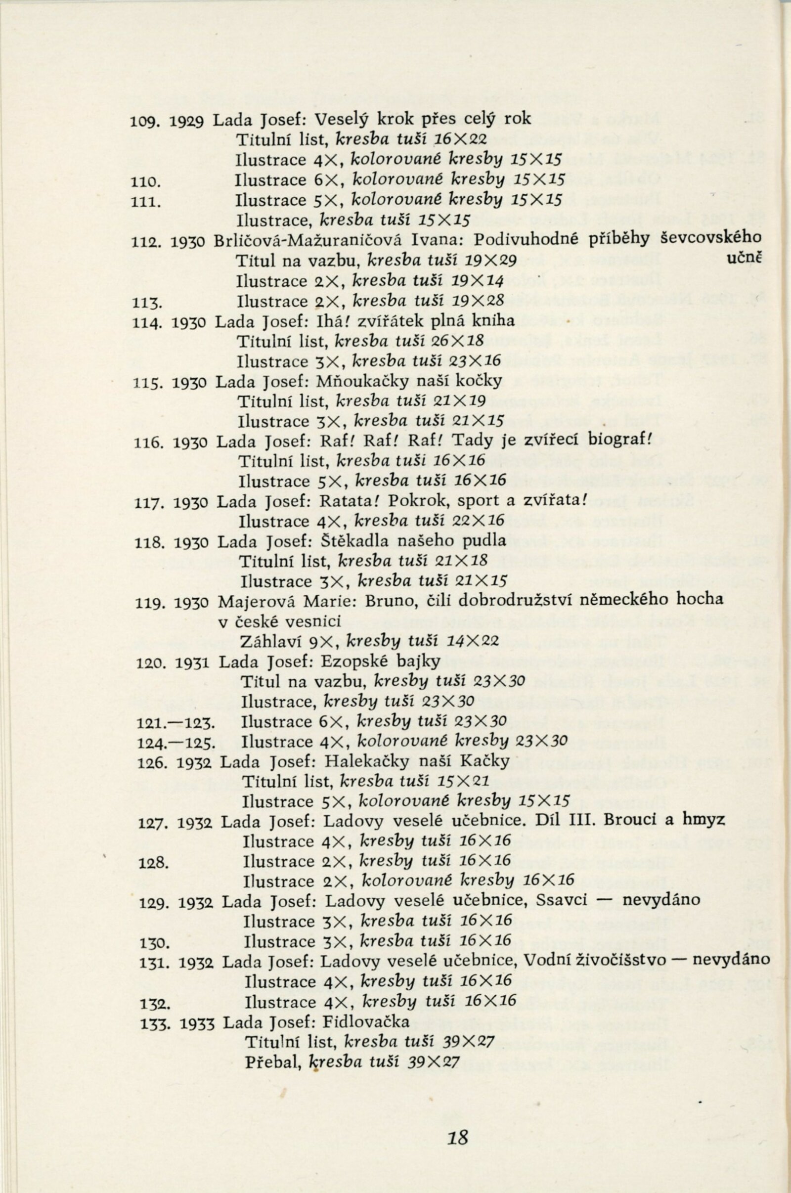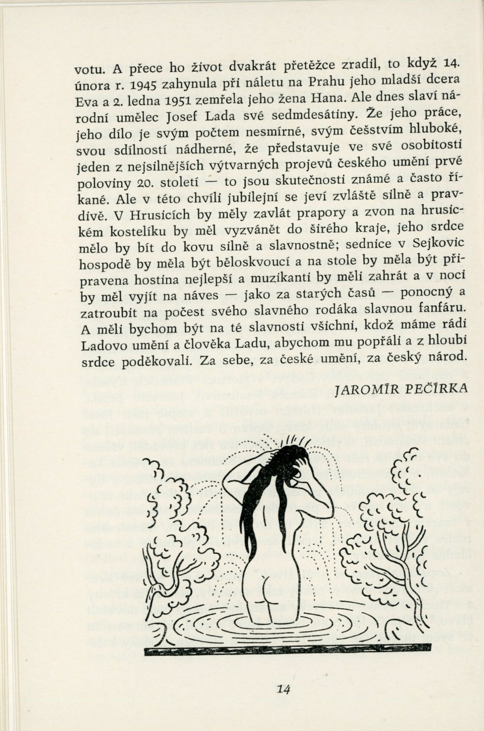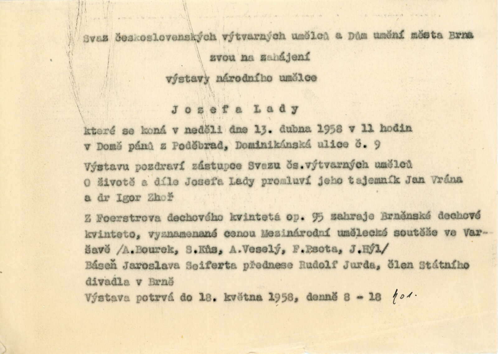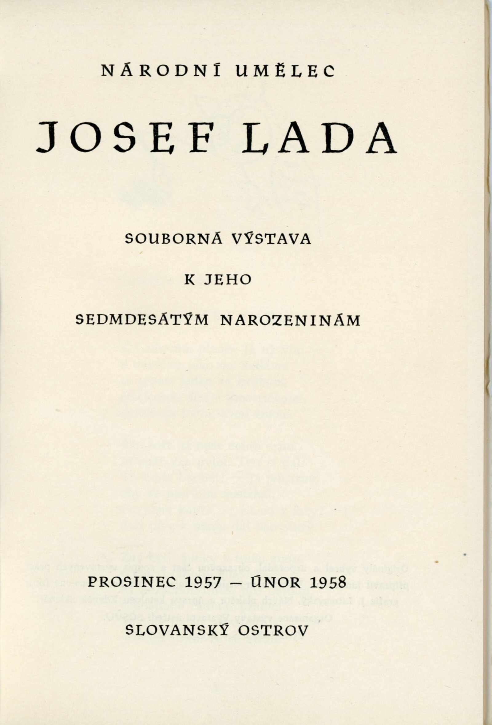 Josef Lada: Dům umění v Brně / Dům pánů z Poděbrad, 13. 4. – 18. 5. 1958 / Převzatý katalog. Národní umělec Josef Lada. Souborná výstava k jeho sedmdesátým narozeninám: Slovanský ostrov, Praha, prosinec 1957 – únor 1958 / Text: Jaromír Pečírka. – Praha: SČSVU, 1958. – 40 s., 32 s. obr. přil. 2 s. jednobar. obr. přil., báseň Ladislav Stehlík, DPK 3. – MG