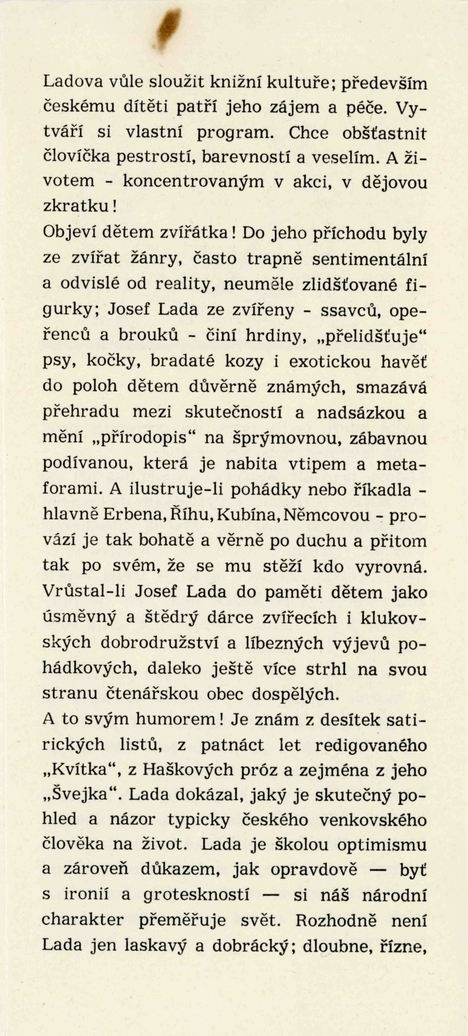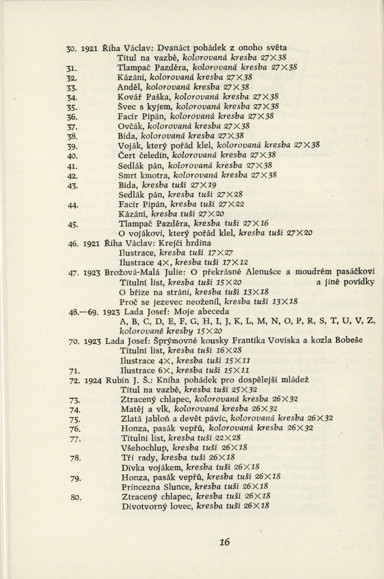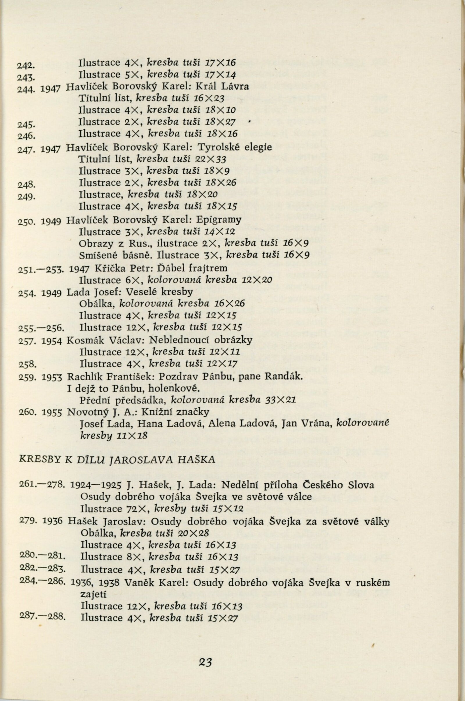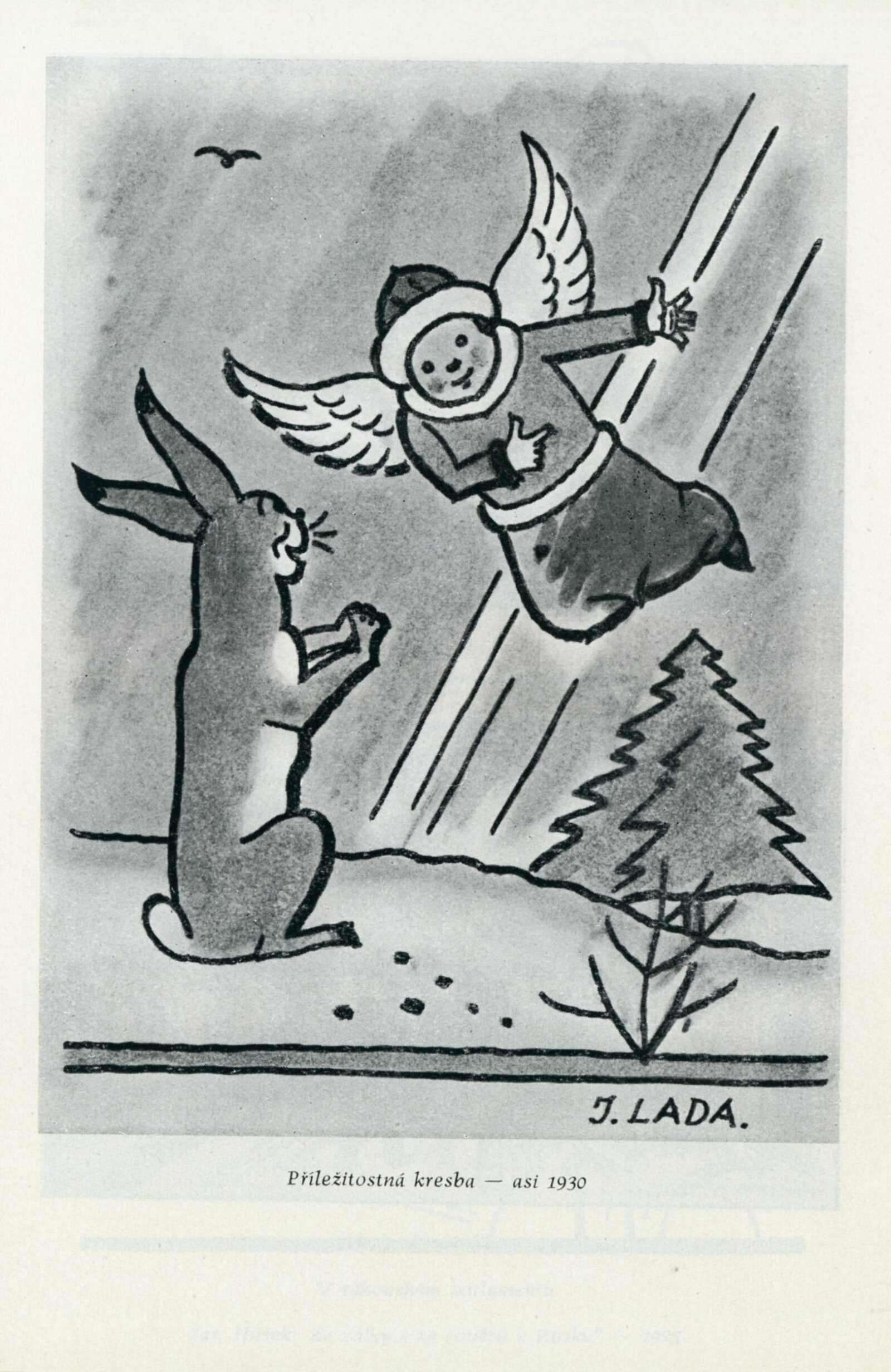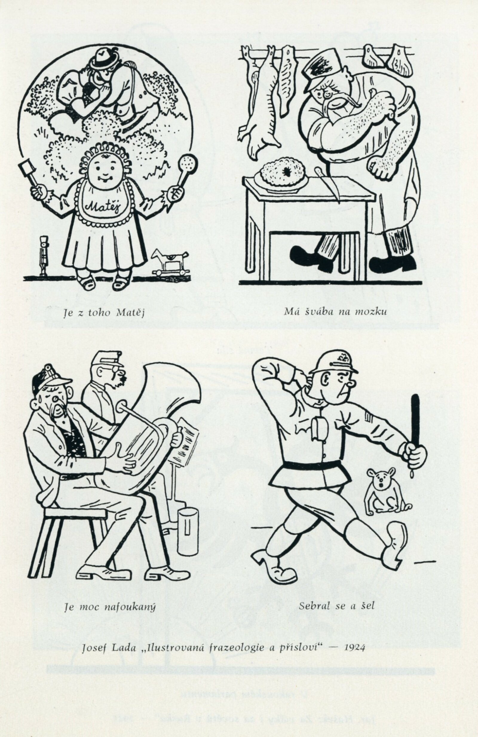 Josef Lada: Dům umění v Brně / Dům pánů z Poděbrad, 13. 4. – 18. 5. 1958 / Převzatý katalog. Národní umělec Josef Lada. Souborná výstava k jeho sedmdesátým narozeninám: Slovanský ostrov, Praha, prosinec 1957 – únor 1958 / Text: Jaromír Pečírka. – Praha: SČSVU, 1958. – 40 s., 32 s. obr. přil. 2 s. jednobar. obr. přil., báseň Ladislav Stehlík, DPK 3. – MG