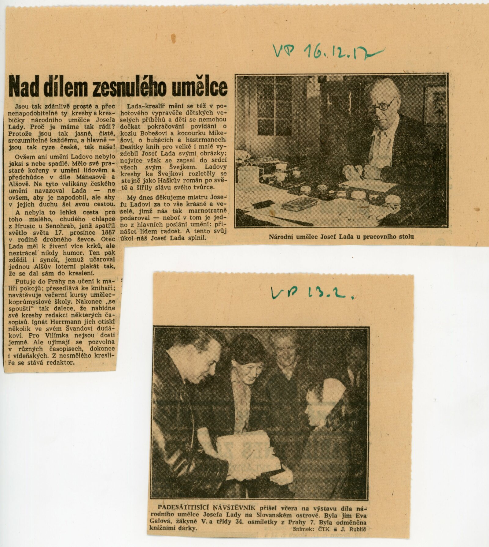 pozvánka, katalog, seznam děl s cenami, strojopis pořadu vernisáže, text pro média, přehled organizace výstavy, seznam vybraných děl z grafické sbírky NG, fotografie z výstavy, provozní korespondence (s tajemníkem umělce, SFVU, SSVU, NG), reversy, recenze v tisku, leták s pozváním na výstavu Josefa Lady a kniha v Antikvariátu, n. p. kniha v Domě pánů z Poděbrad (19. 10. – 7. 11. 1957)
