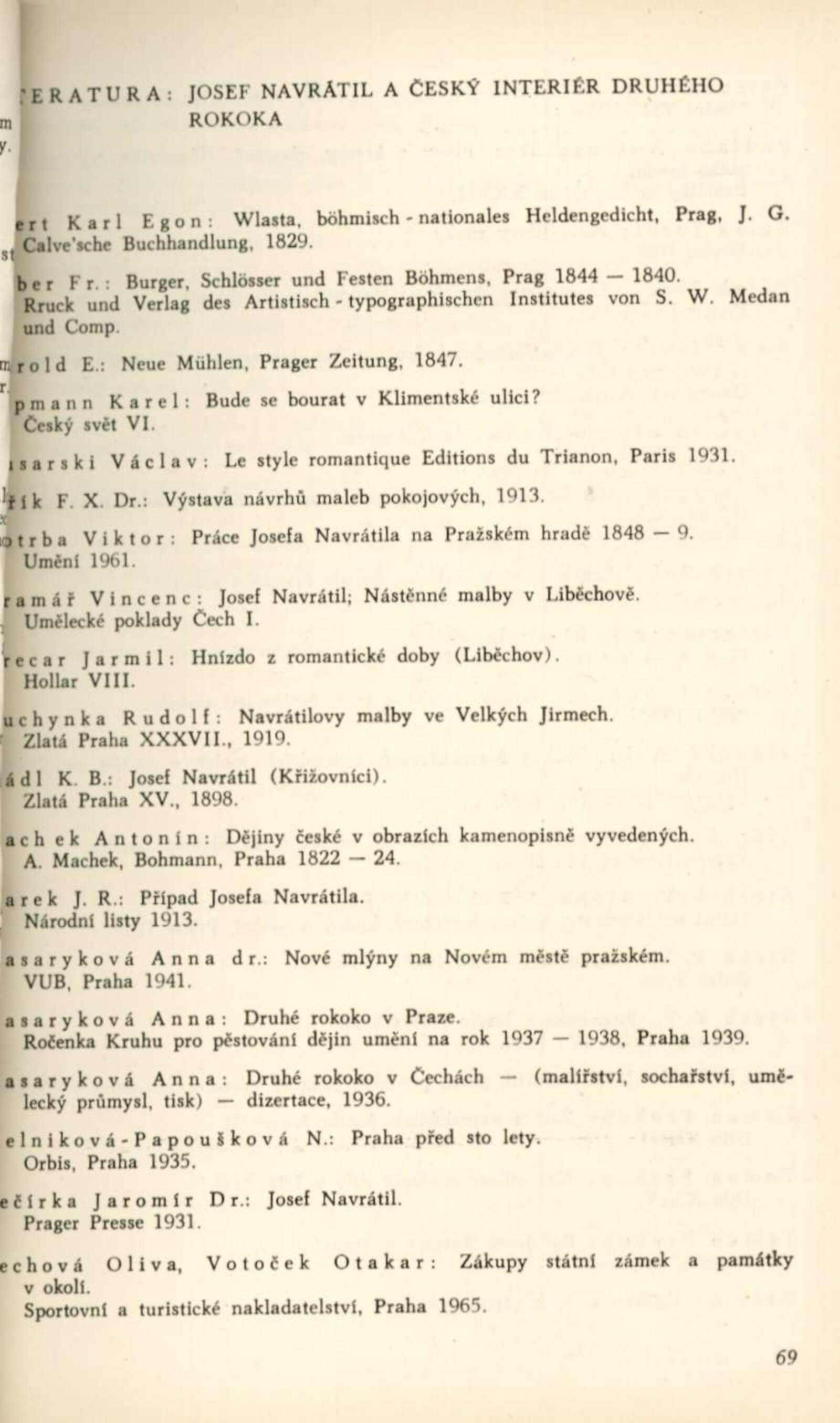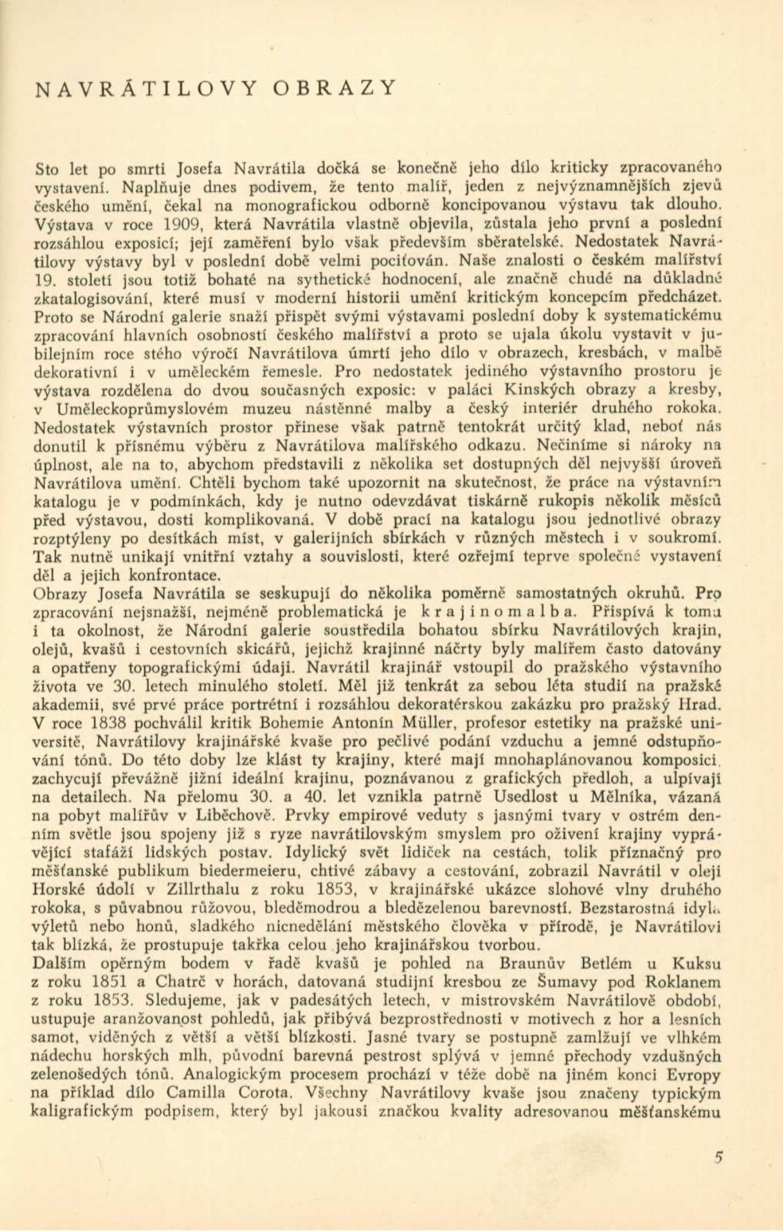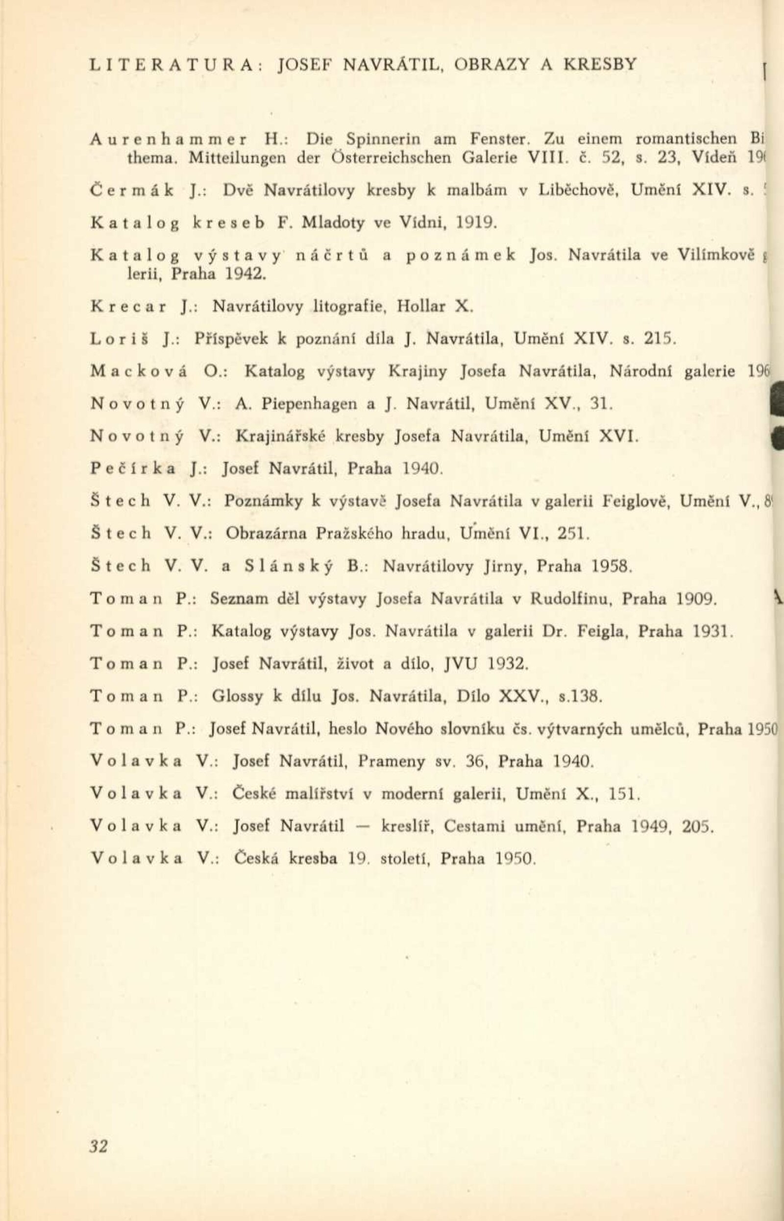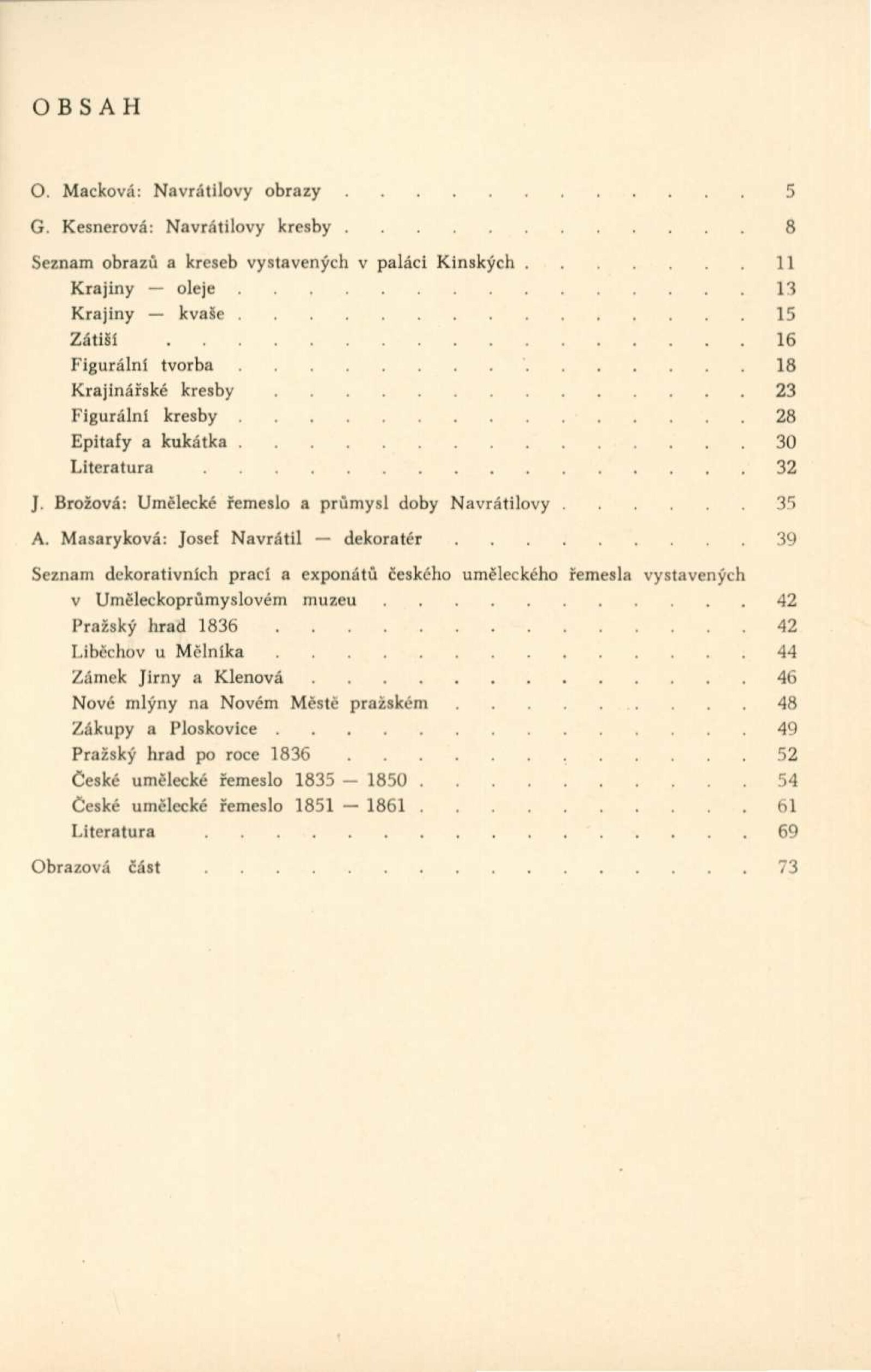 Josef Navrátil. 1798–1865. Obrazy, kresby a český interiér druhého rokoka: Dům umění města Brna / Dům pánů z Kunštátu, 30. 1. – 6. 3. 1966 / Převzatý katalog. Josef Navrátil. Obrazy a kresby: Palác Kinských, Praha říjen–prosinec 1965 / Texty: Olga Macková, Gabriela Kesnerová, Jarmila Brožová, Anna Masaryková. – Praha: Národní galerie, 1965. – 71 s., 34 s. obr. příl., DPK 294. – MG