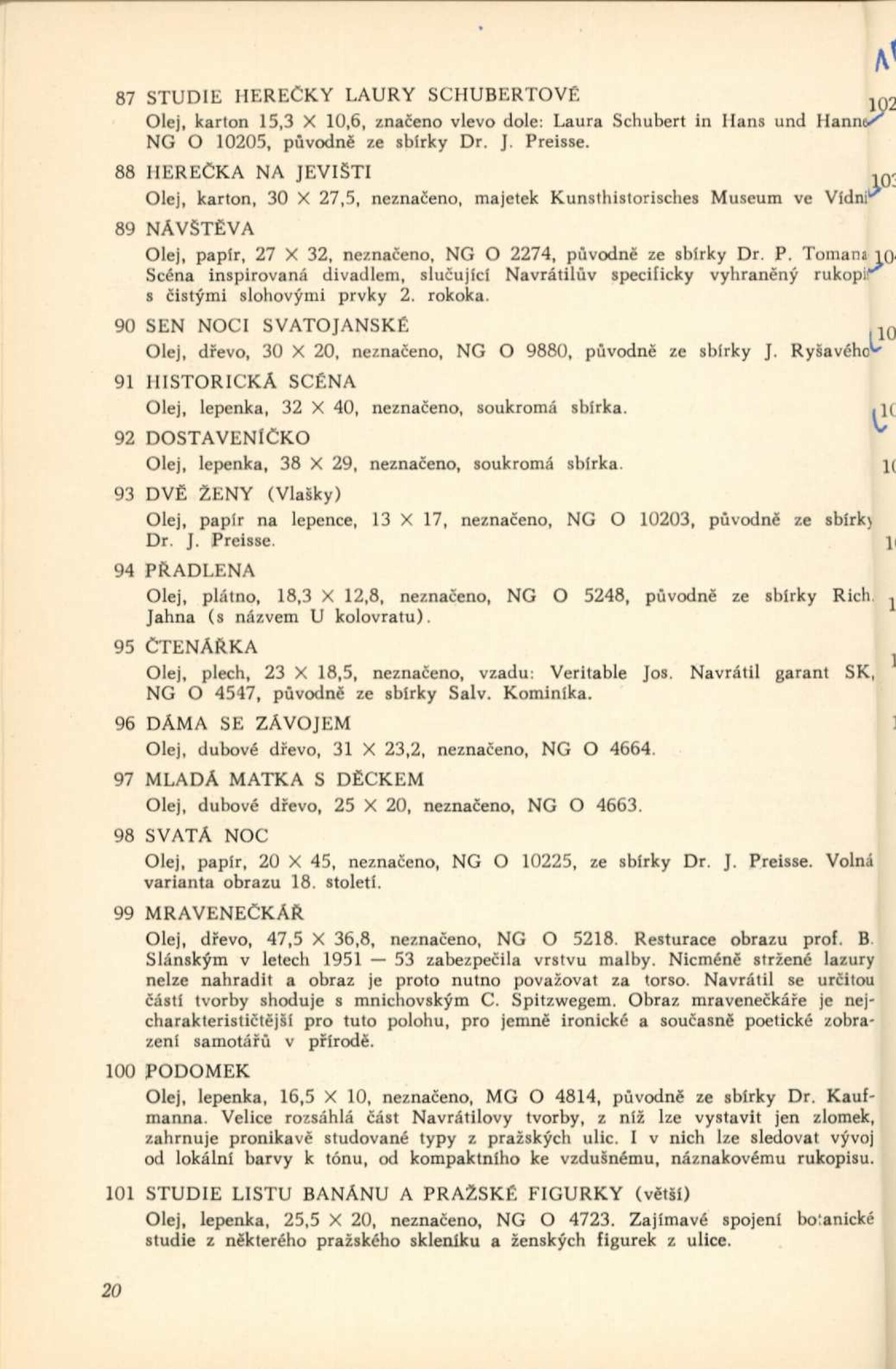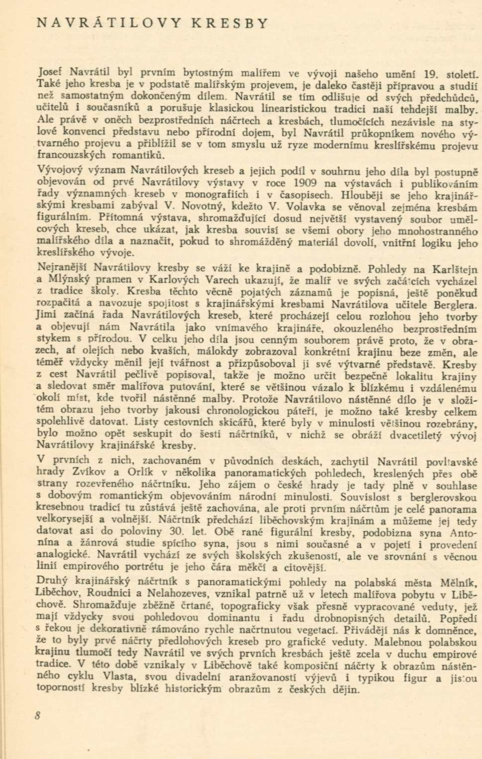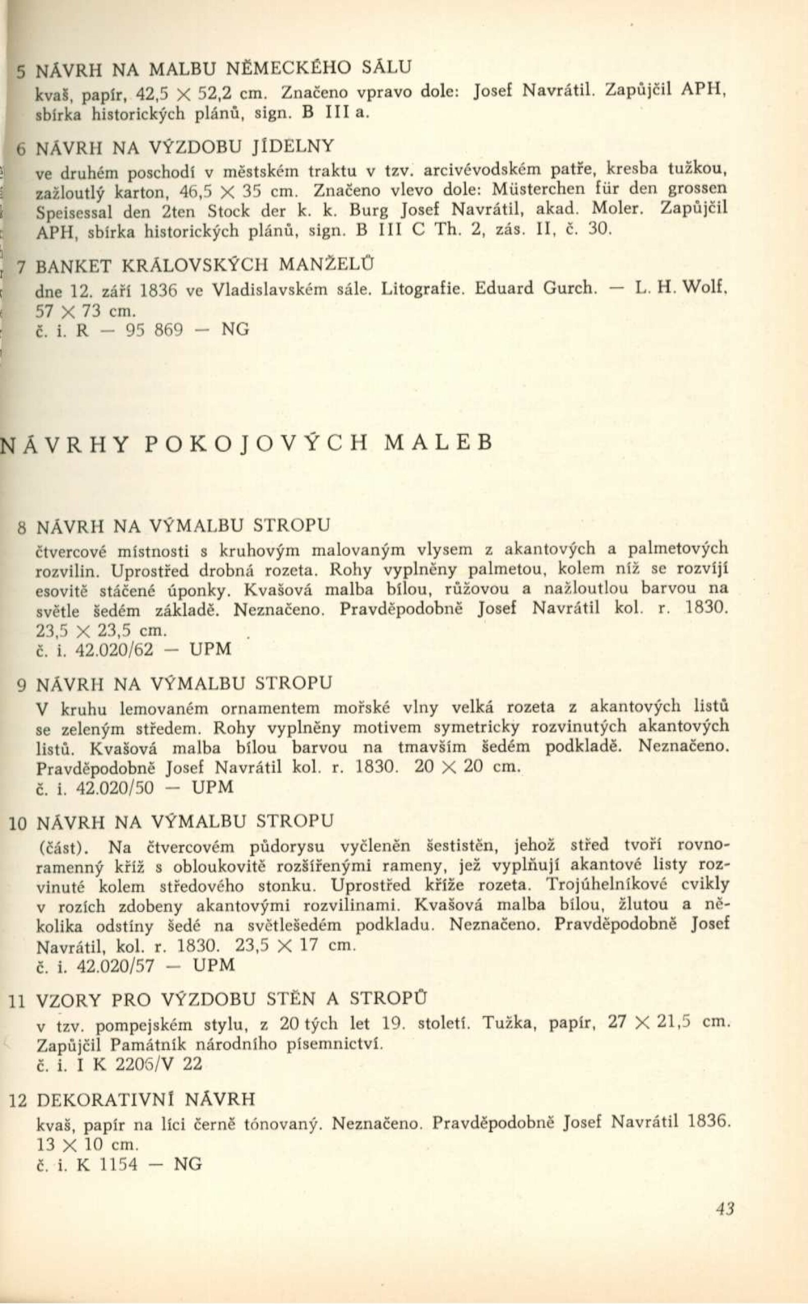 Josef Navrátil. 1798–1865. Obrazy, kresby a český interiér druhého rokoka: Dům umění města Brna / Dům pánů z Kunštátu, 30. 1. – 6. 3. 1966 / Převzatý katalog. Josef Navrátil. Obrazy a kresby: Palác Kinských, Praha říjen–prosinec 1965 / Texty: Olga Macková, Gabriela Kesnerová, Jarmila Brožová, Anna Masaryková. – Praha: Národní galerie, 1965. – 71 s., 34 s. obr. příl., DPK 294. – MG