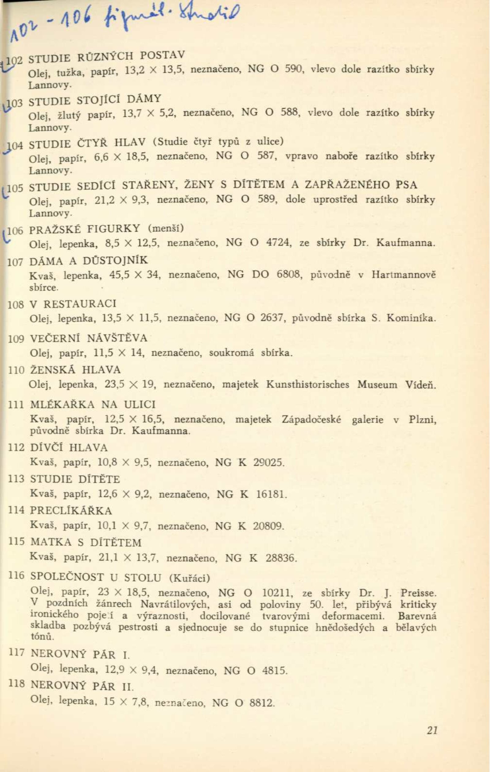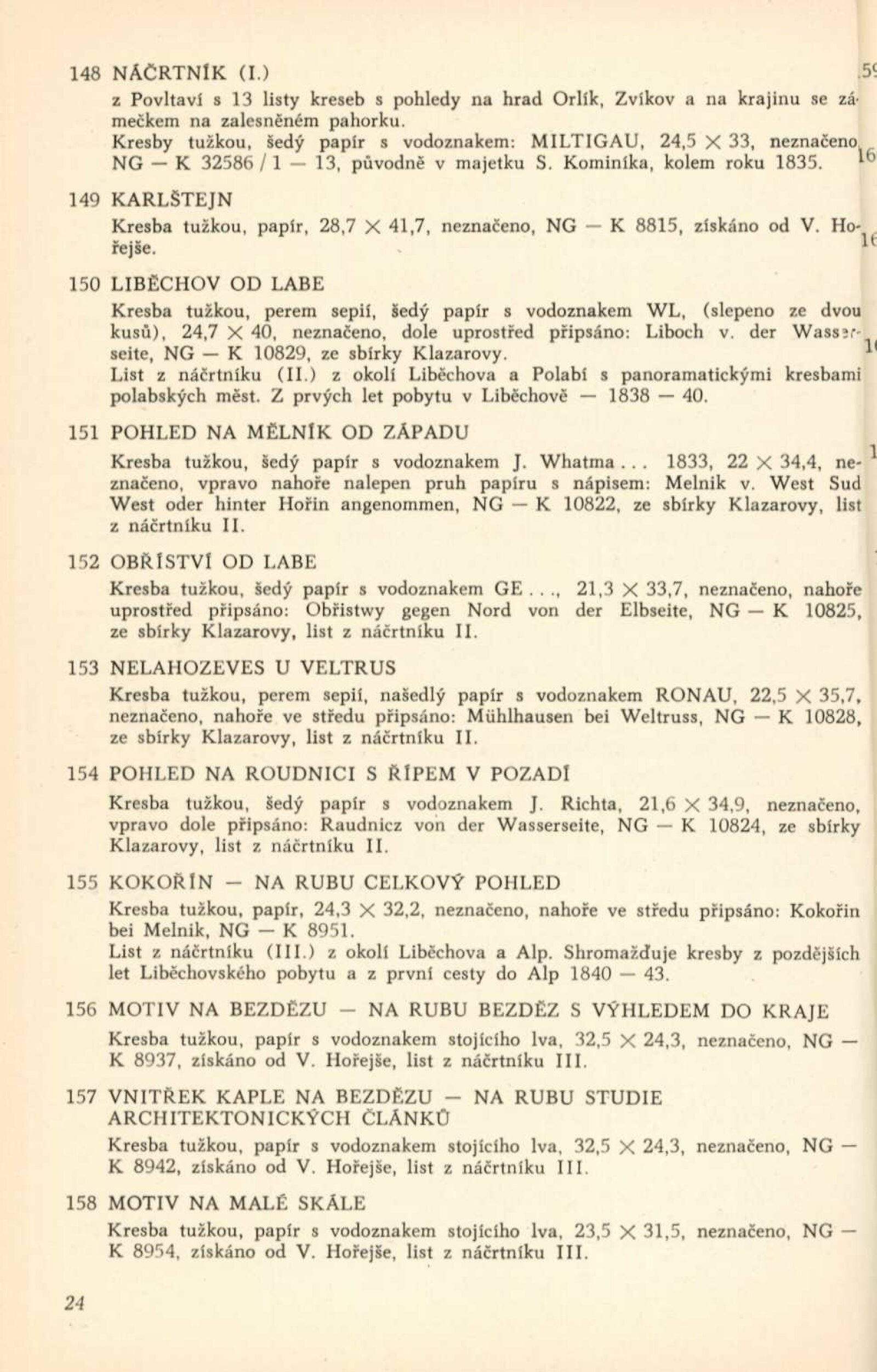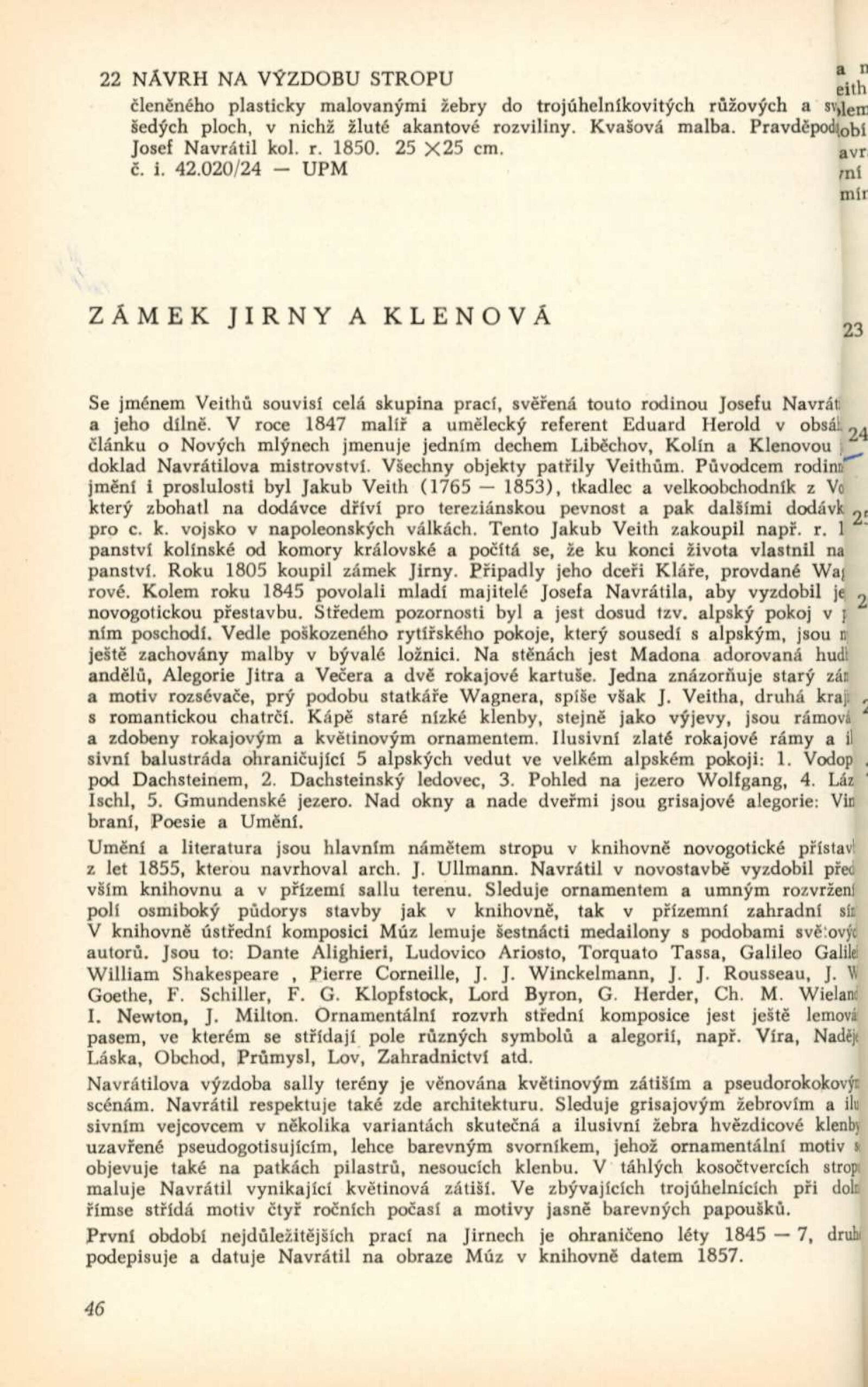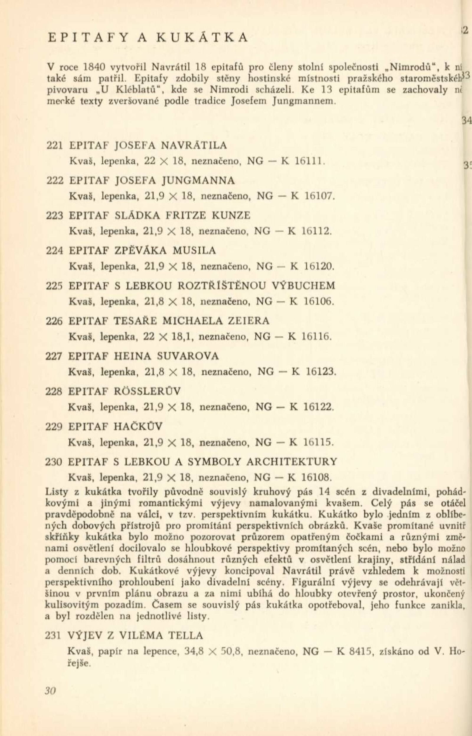 Josef Navrátil. 1798–1865. Obrazy, kresby a český interiér druhého rokoka: Dům umění města Brna / Dům pánů z Kunštátu, 30. 1. – 6. 3. 1966 / Převzatý katalog. Josef Navrátil. Obrazy a kresby: Palác Kinských, Praha říjen–prosinec 1965 / Texty: Olga Macková, Gabriela Kesnerová, Jarmila Brožová, Anna Masaryková. – Praha: Národní galerie, 1965. – 71 s., 34 s. obr. příl., DPK 294. – MG