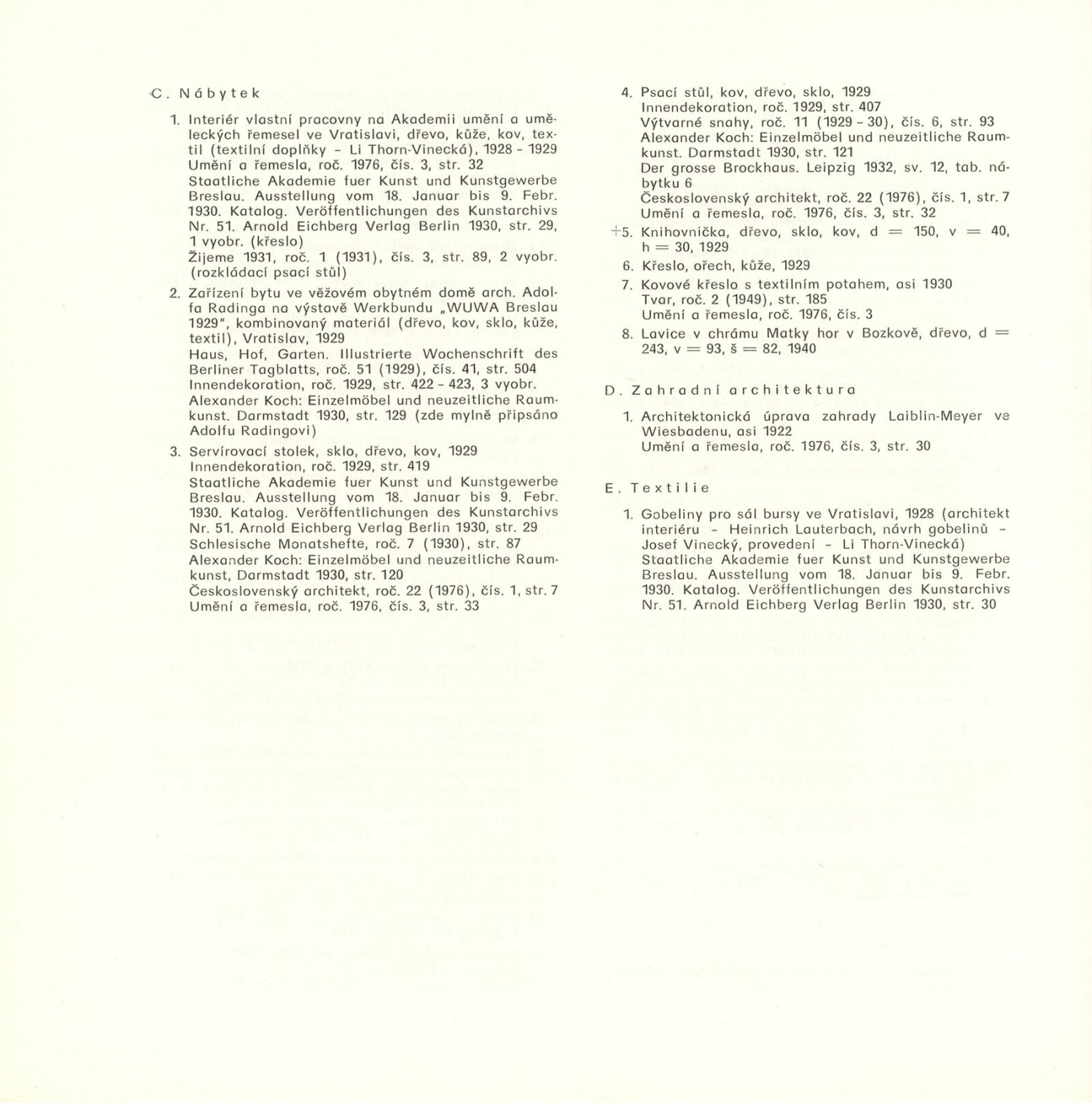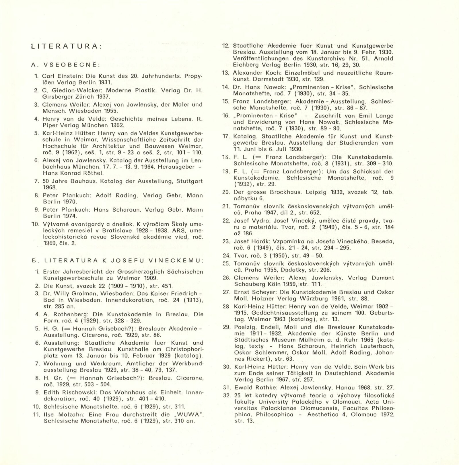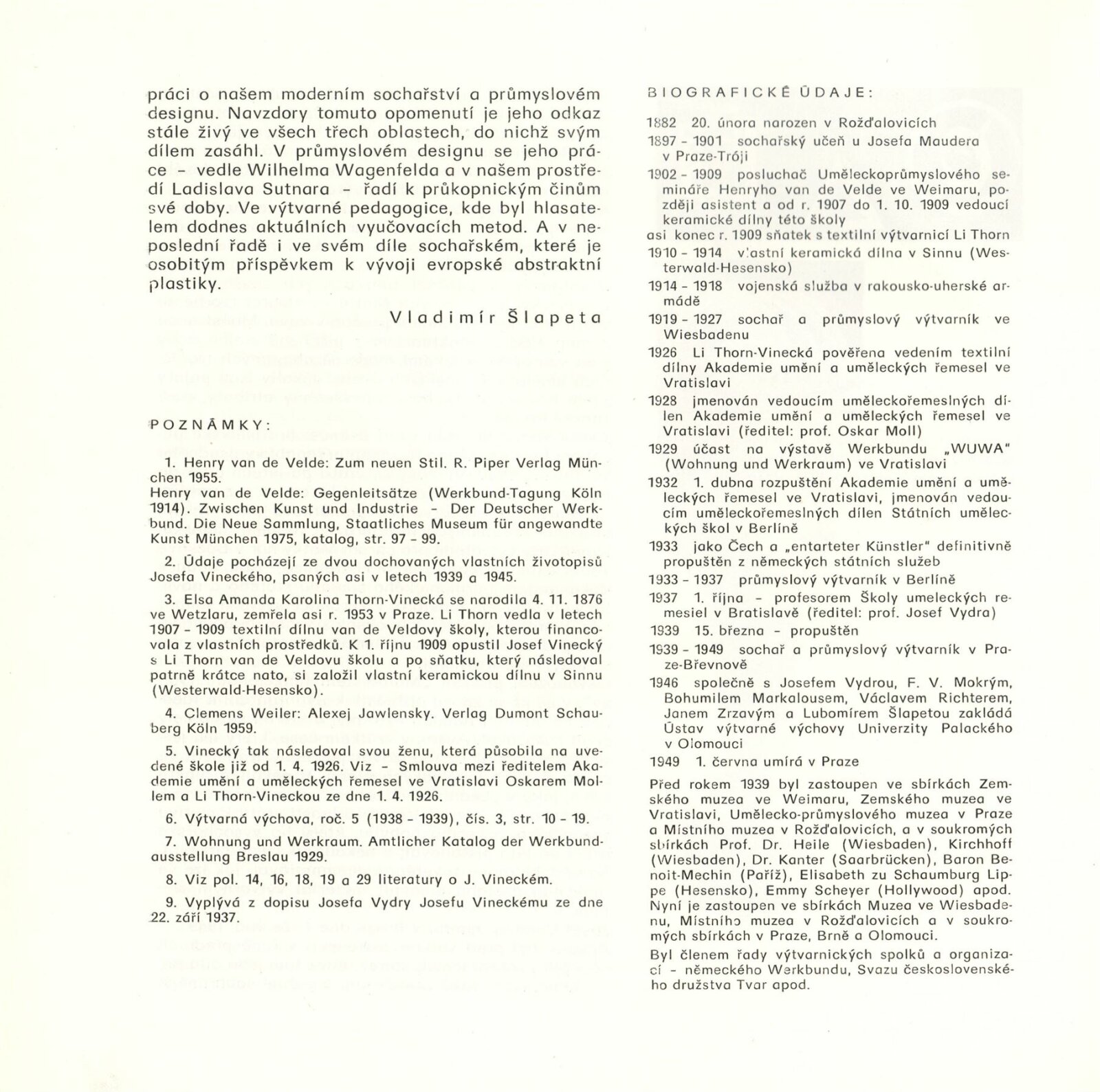 Josef Vinecký 1882–1949. Výtvarné dílo: Dům umění města Brna, hala, listopad 1977 (spr. 1. 12.) – 9. 1. 1978 / Text: Vladimír Šlapeta a autor. – Olomouc: Vlastivědný ústav, 1977. – 38 s., obr., portrét, životní data, bibliografie, soupis výtvarného díla, DU 665. – MZK; MG; MMB