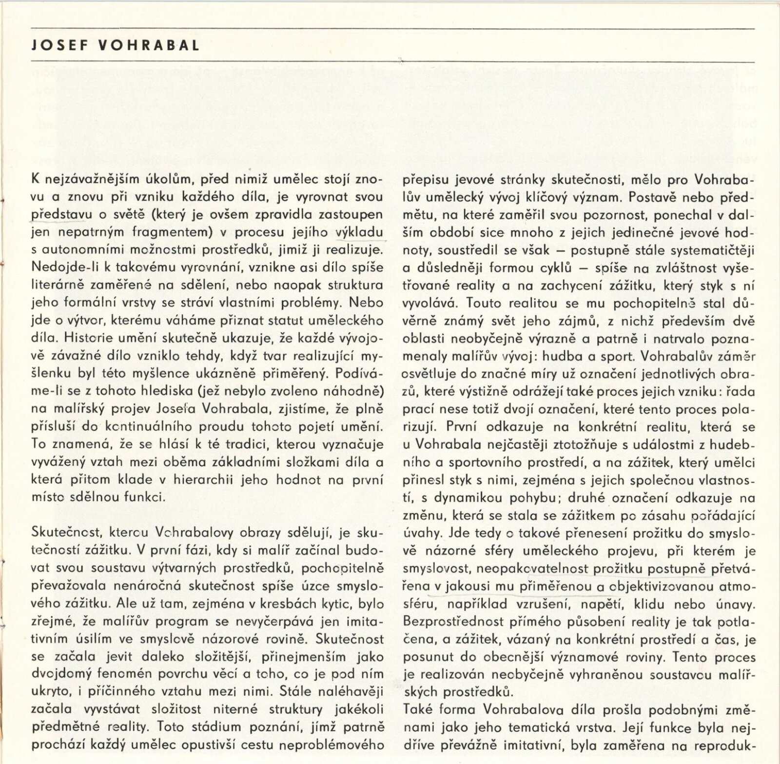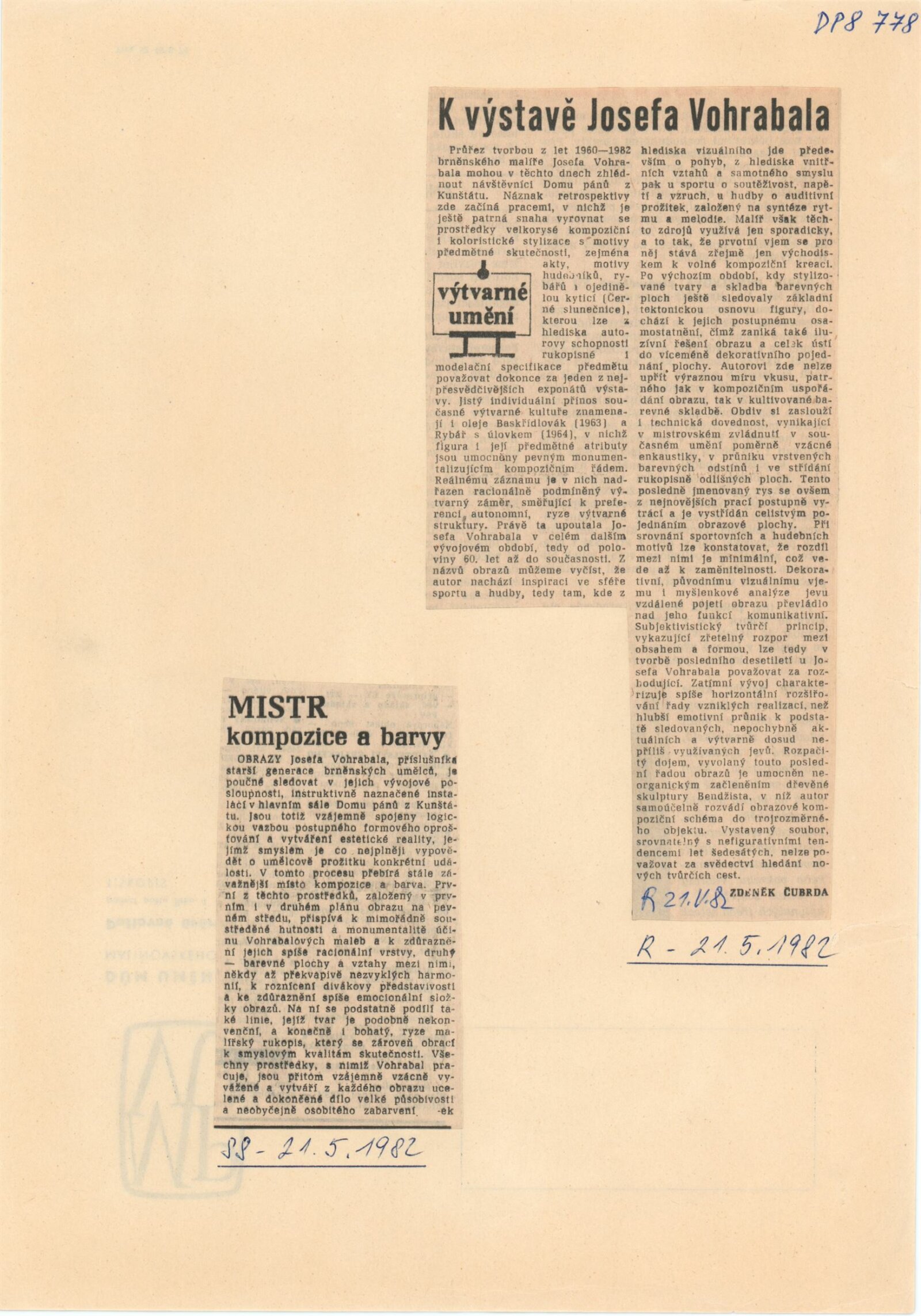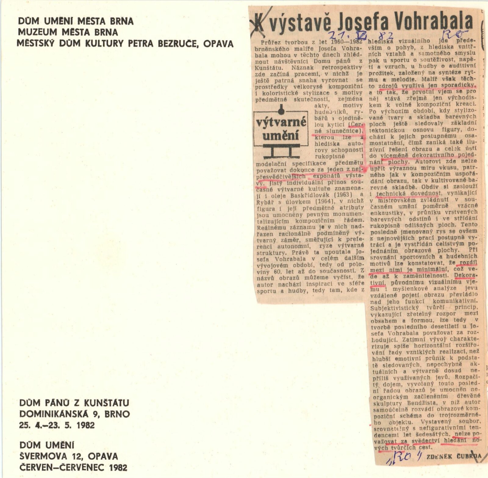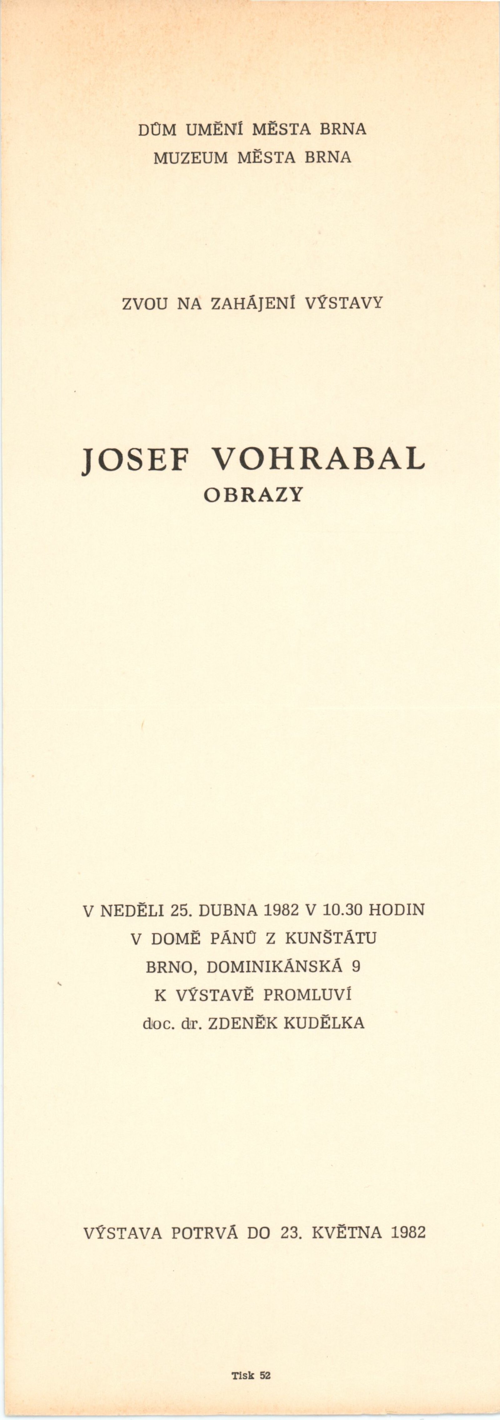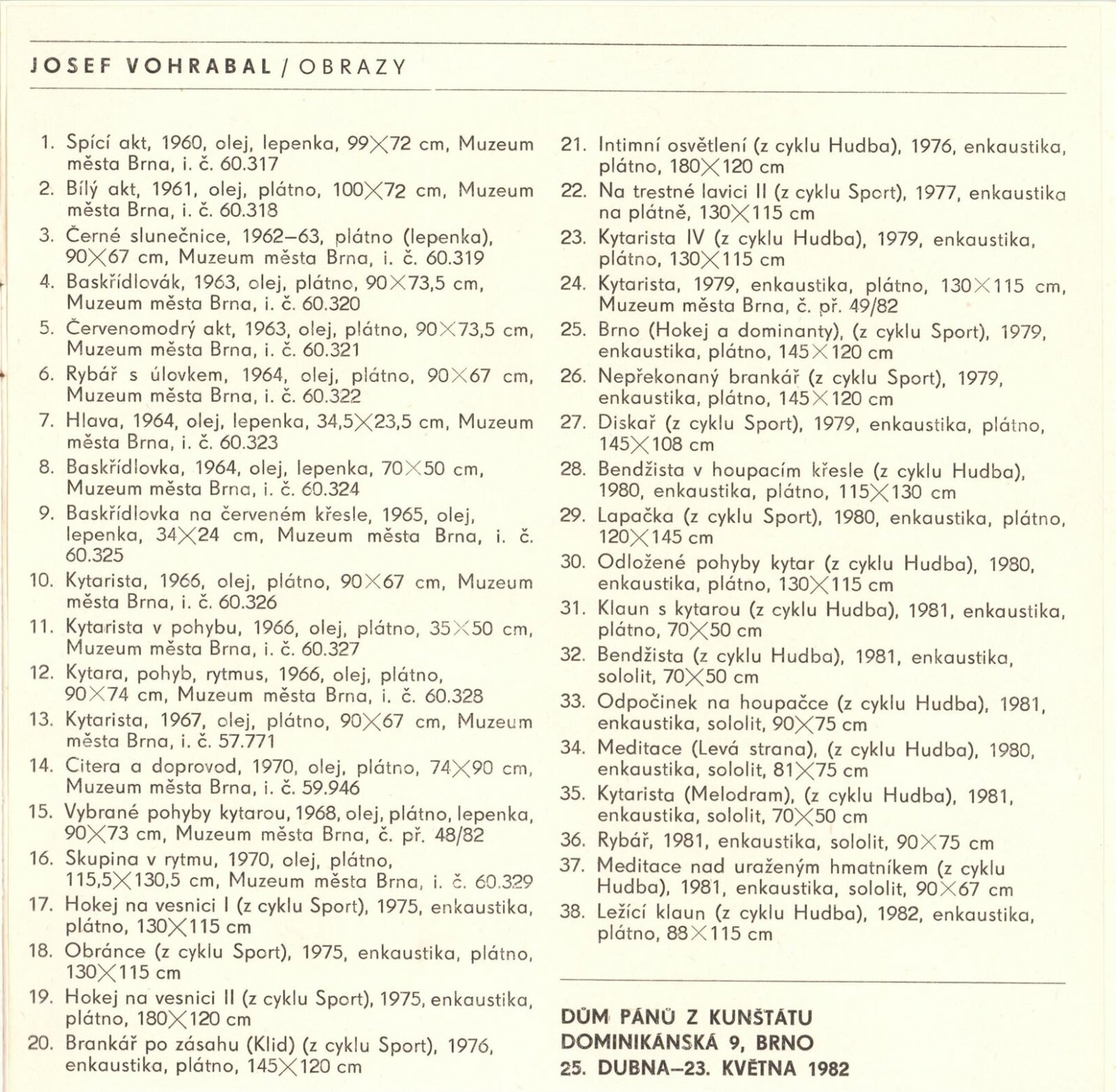 Josef Vohrabal. Obrazy: Dům umění / Dům pánů z Kunštátu, 25. 4. – 23. 5. 1982 / Text: Zdeněk Kudělka. – Brno: DUmB, 1982. – 12 s., obr., seznam vystavených prací 1 s., DPK 778. – MZK; MG