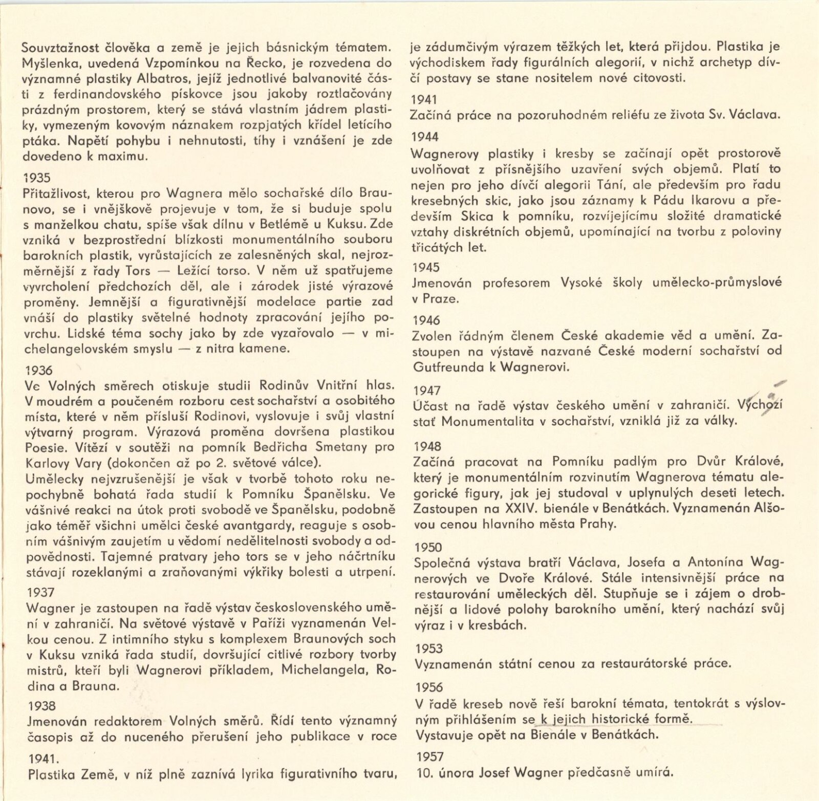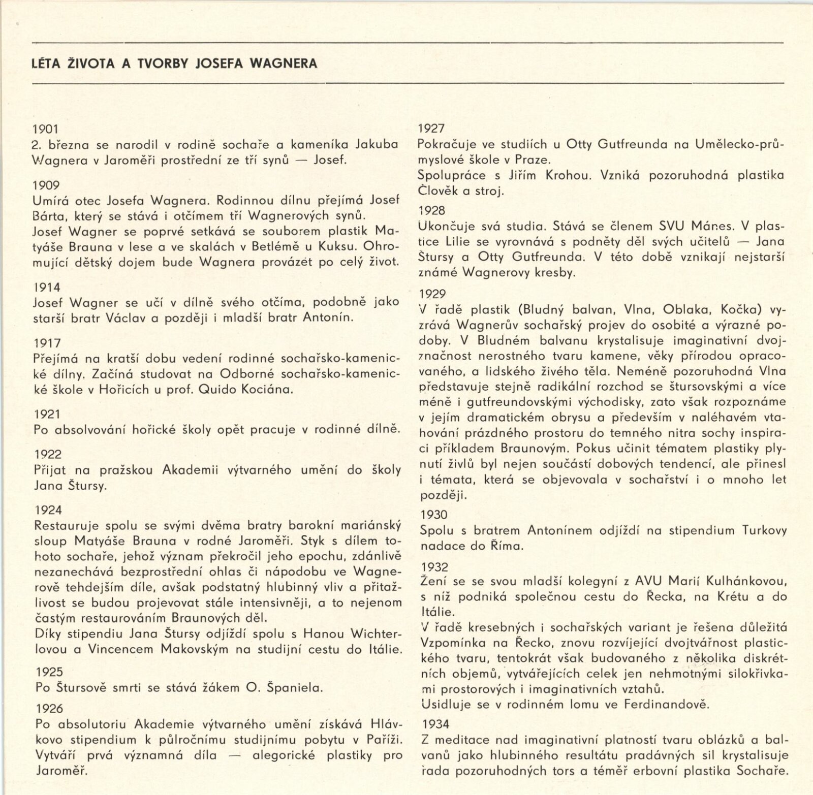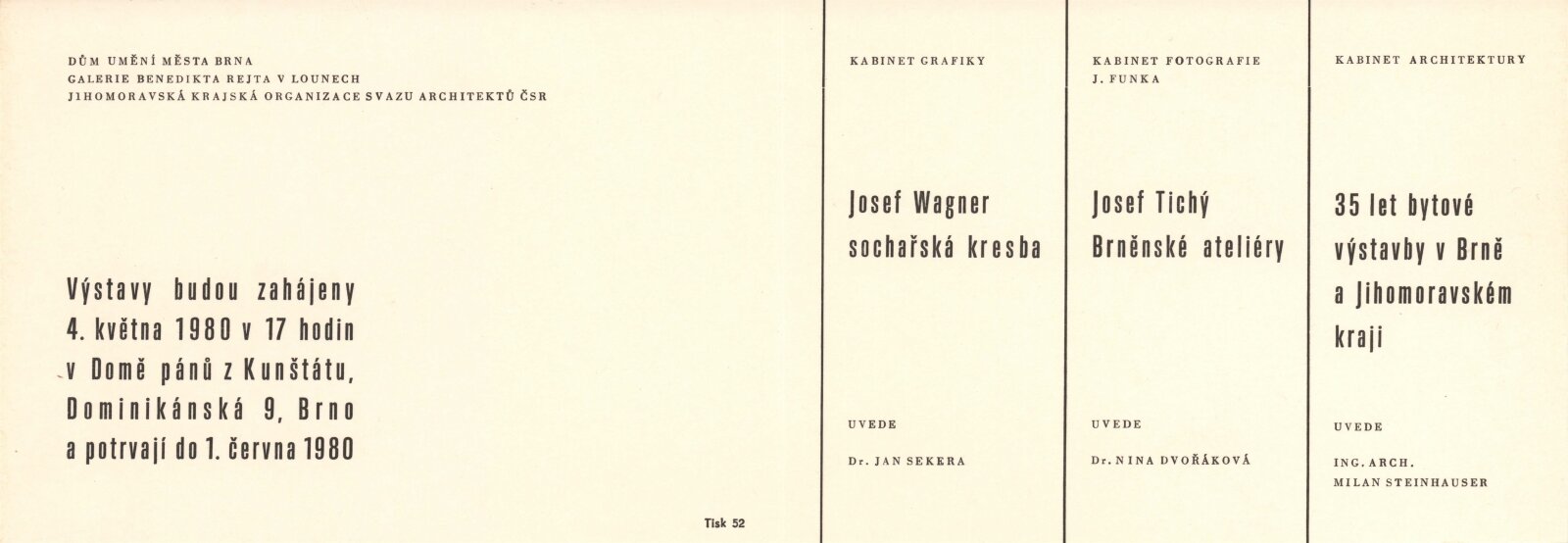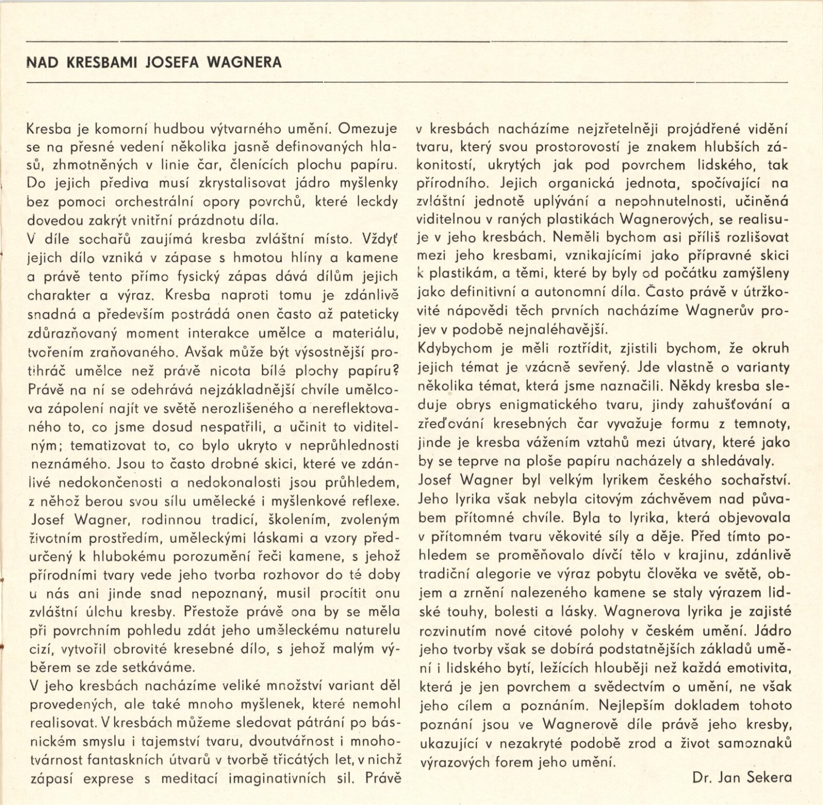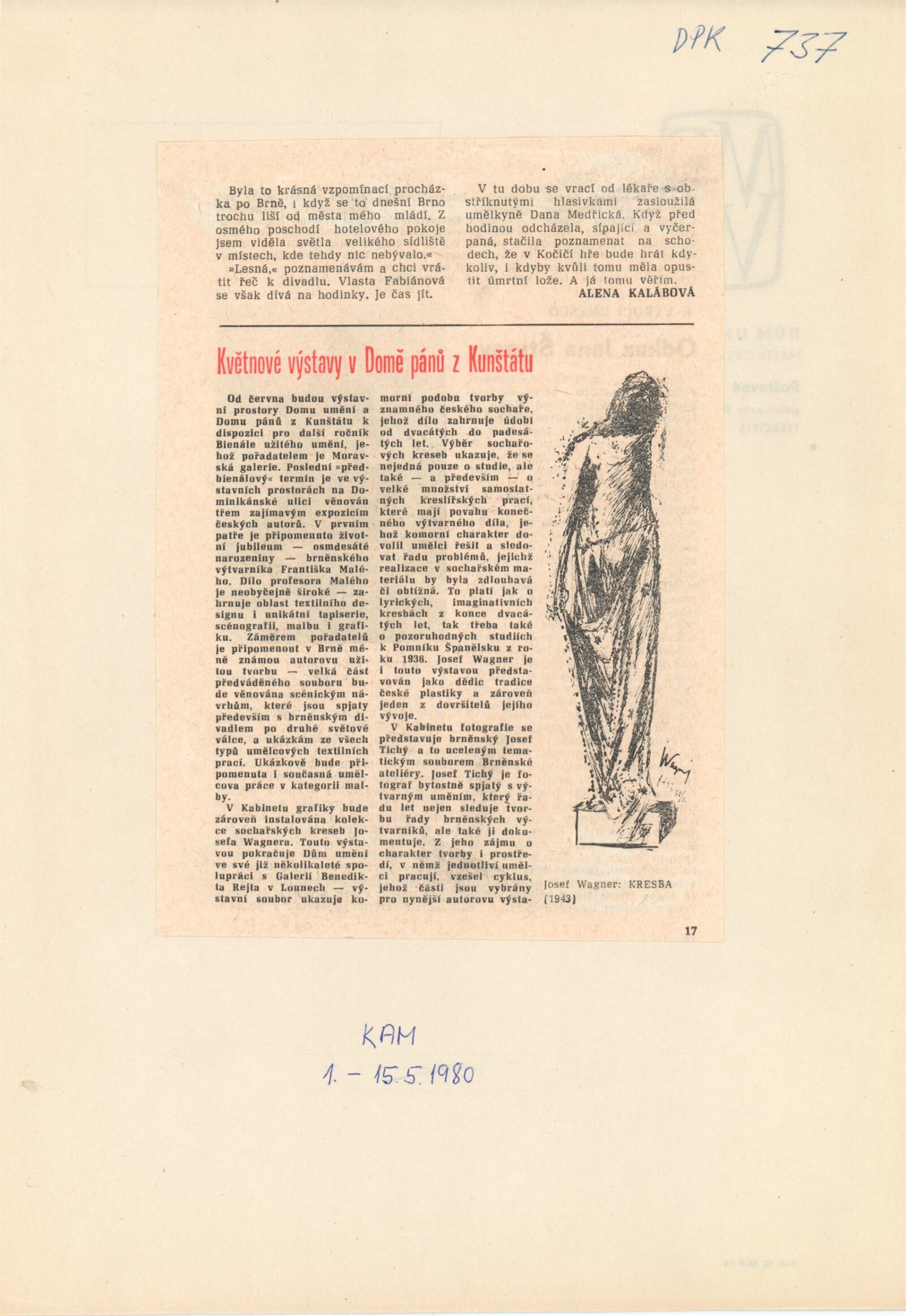 Josef Wagner. Sochařské kresby: Dům umění / Dům pánů z Kunštátu, Kabinet grafiky, 4. 5. – 1. 6. 1980 / Text: Jan Sekera. – Brno: DUmB, 1980. – 9 s., obr., seznam vystavených kreseb 1 s., životopis, DPK 737. – MZK; MG; MMB