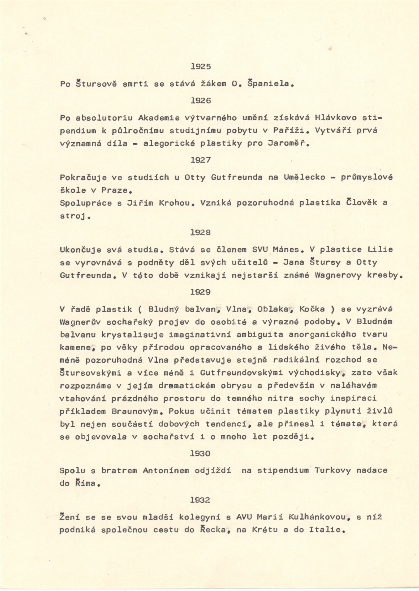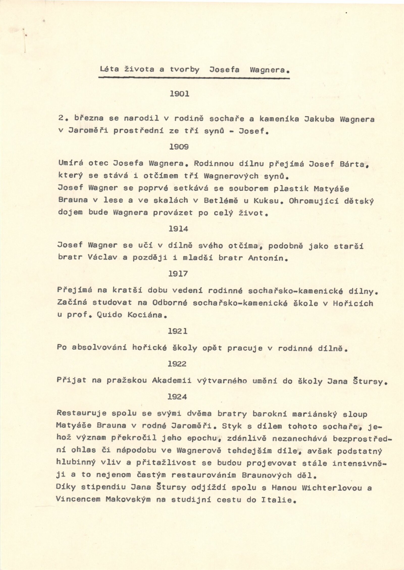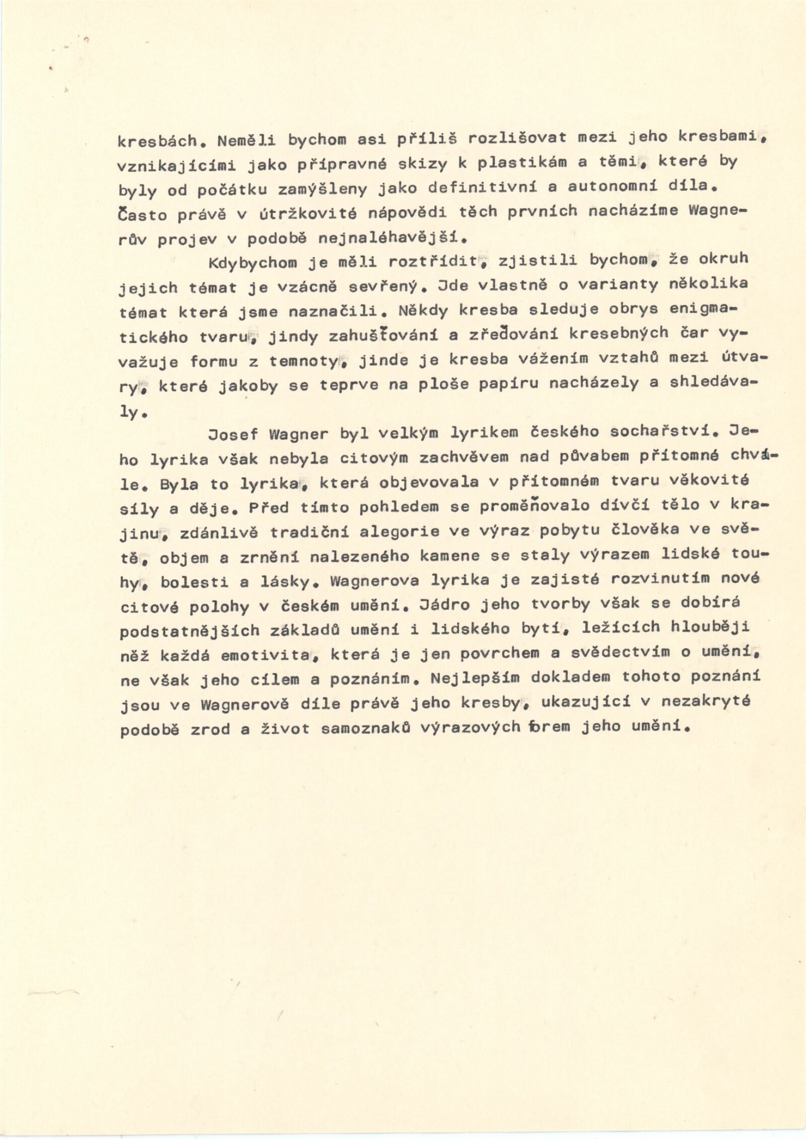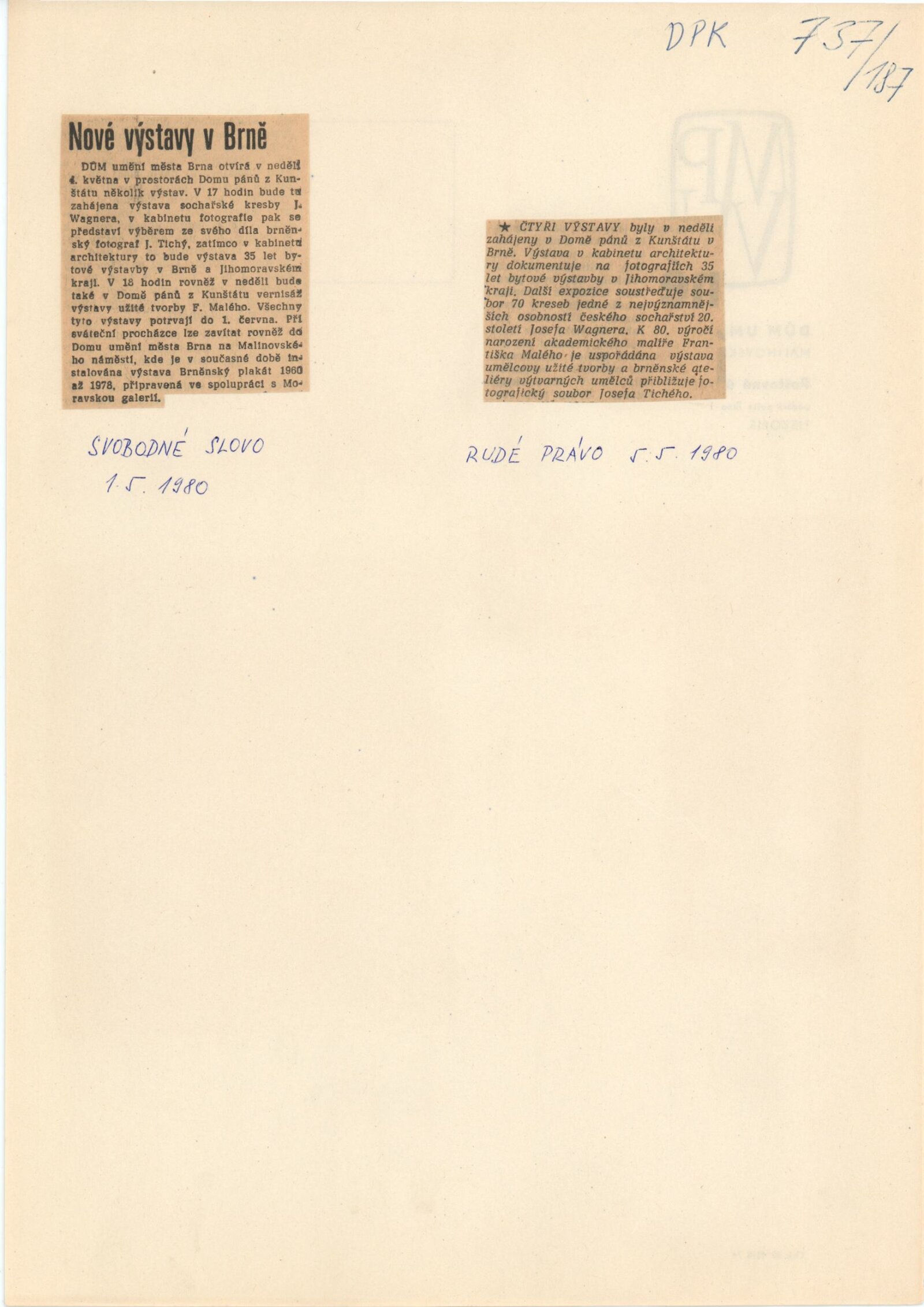 Josef Wagner. Sochařské kresby: Dům umění / Dům pánů z Kunštátu, Kabinet grafiky, 4. 5. – 1. 6. 1980 / Text: Jan Sekera. – Brno: DUmB, 1980. – 9 s., obr., seznam vystavených kreseb 1 s., životopis, DPK 737. – MZK; MG; MMB