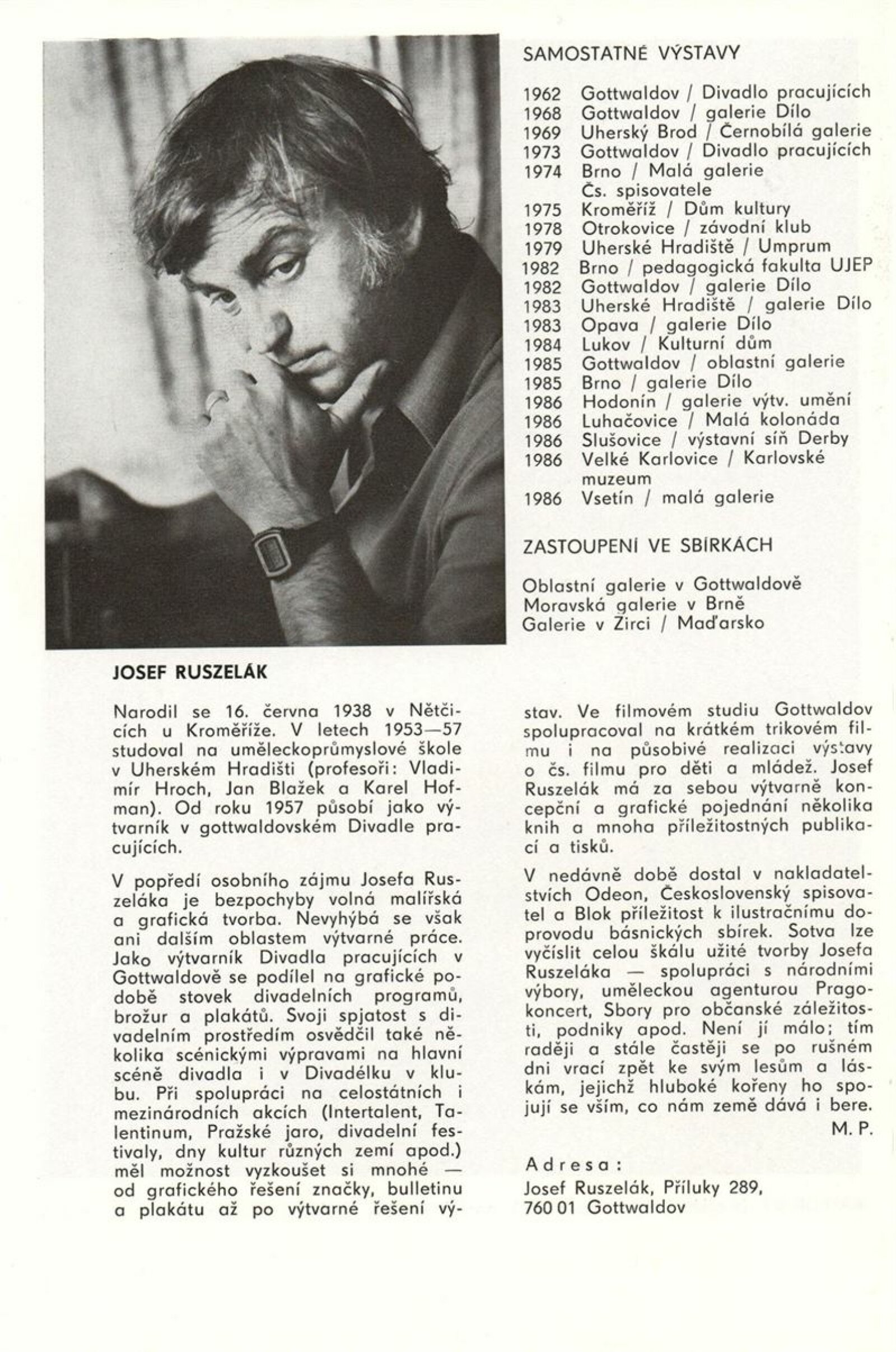 Josef Ruszelák. Obrazy, kresby, grafika: Dům umění, 140. výstava v Galerii Jaroslava Krále, 23. 9. – 11. 10. 1987 / Texty: Ludvik Kundera, Miloslav Plešák. – Brno: SČVU, 1987. – [13] s., obr., portrét, životopis, seznam výstav, DU 840. – MZK; MG; MMB