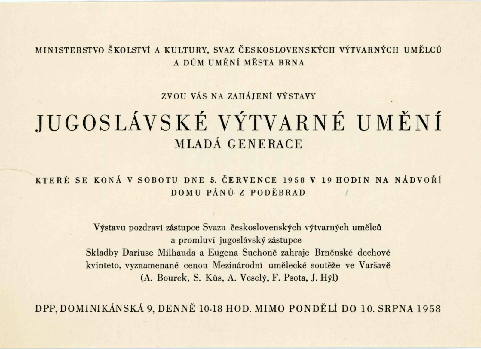 Výstavu zahájili Linka Procházková a Boris Vižintin. Výstavu recenzovali Miroslav Míčko, Karol Vaculík a František Kubišta.