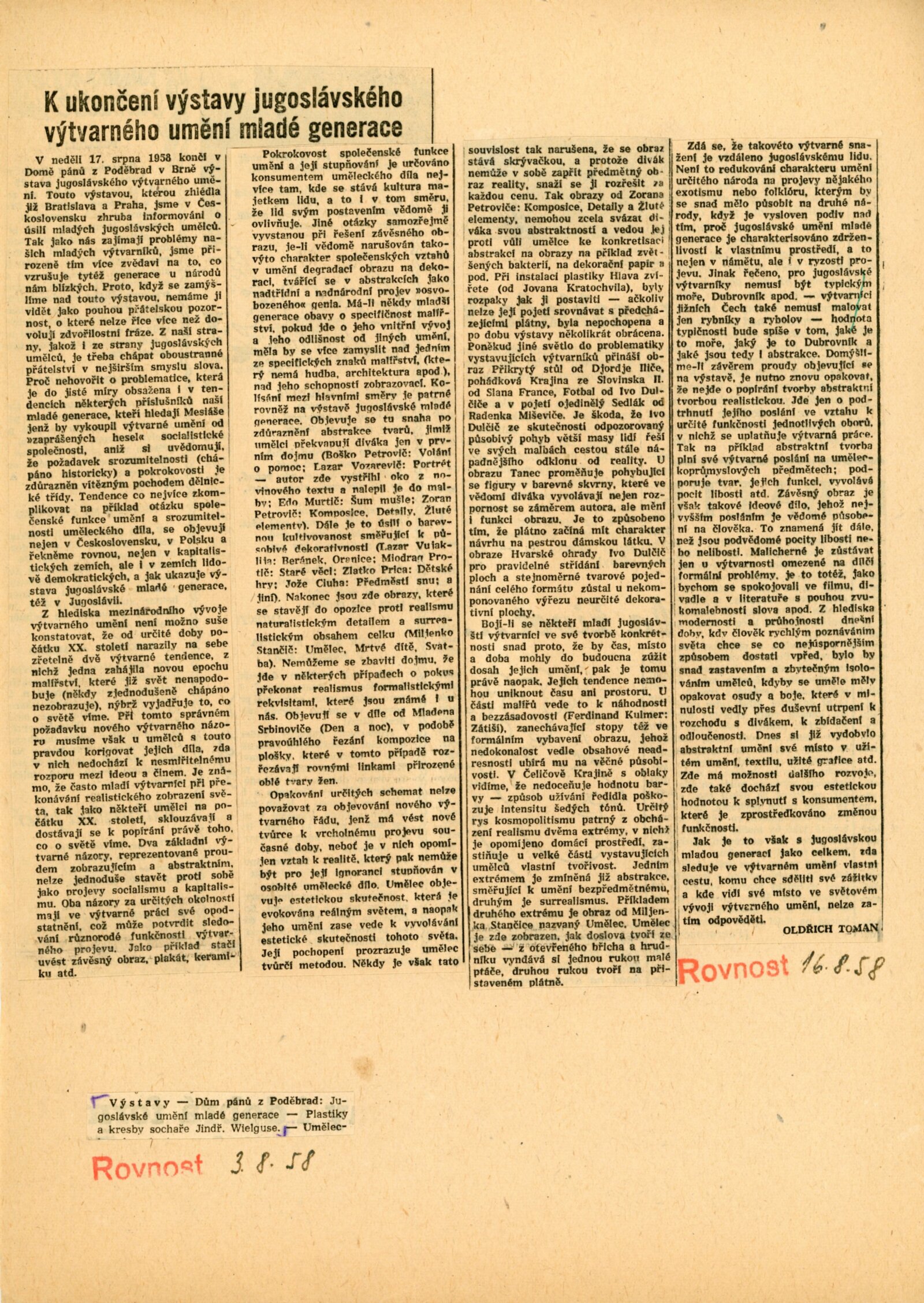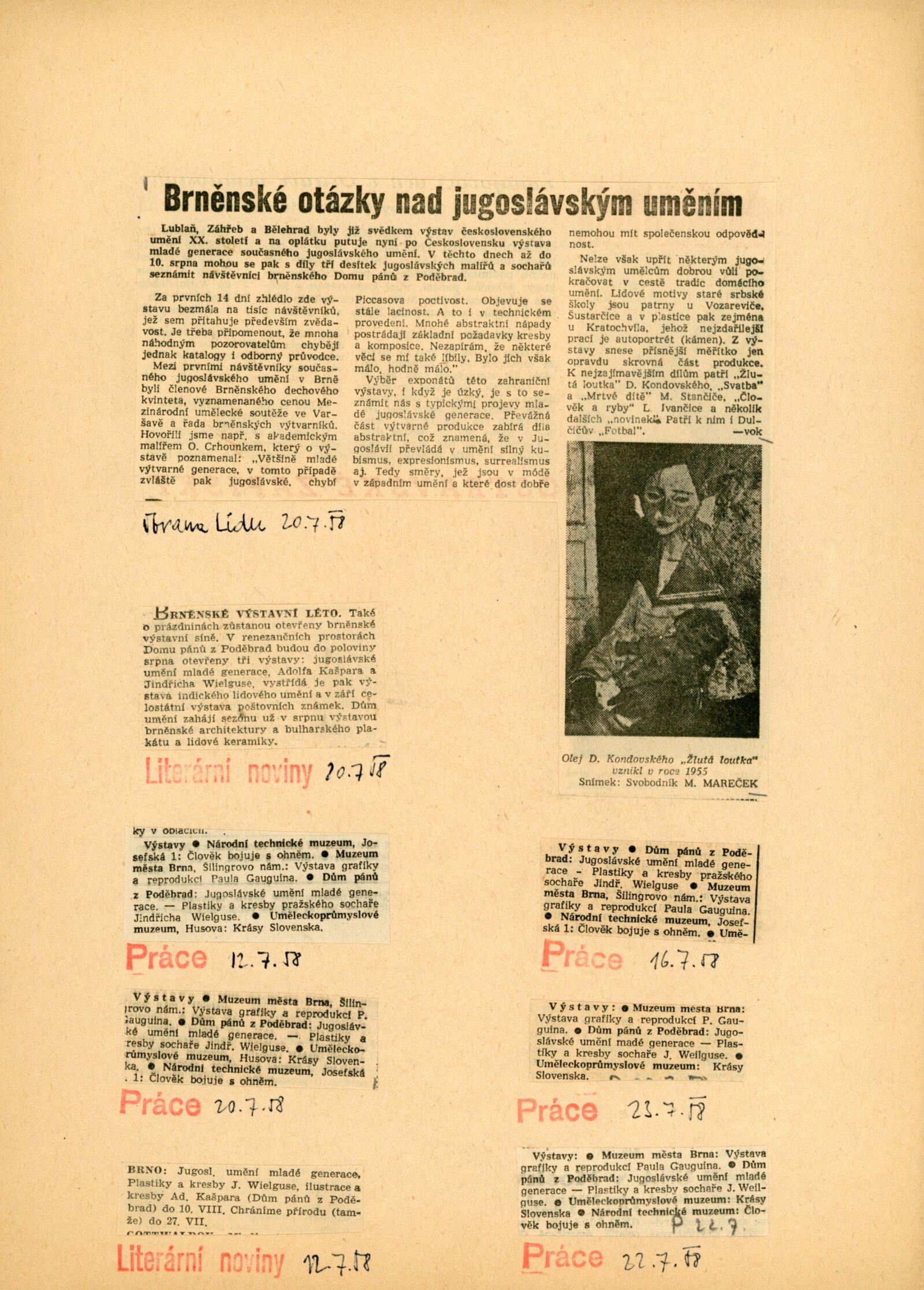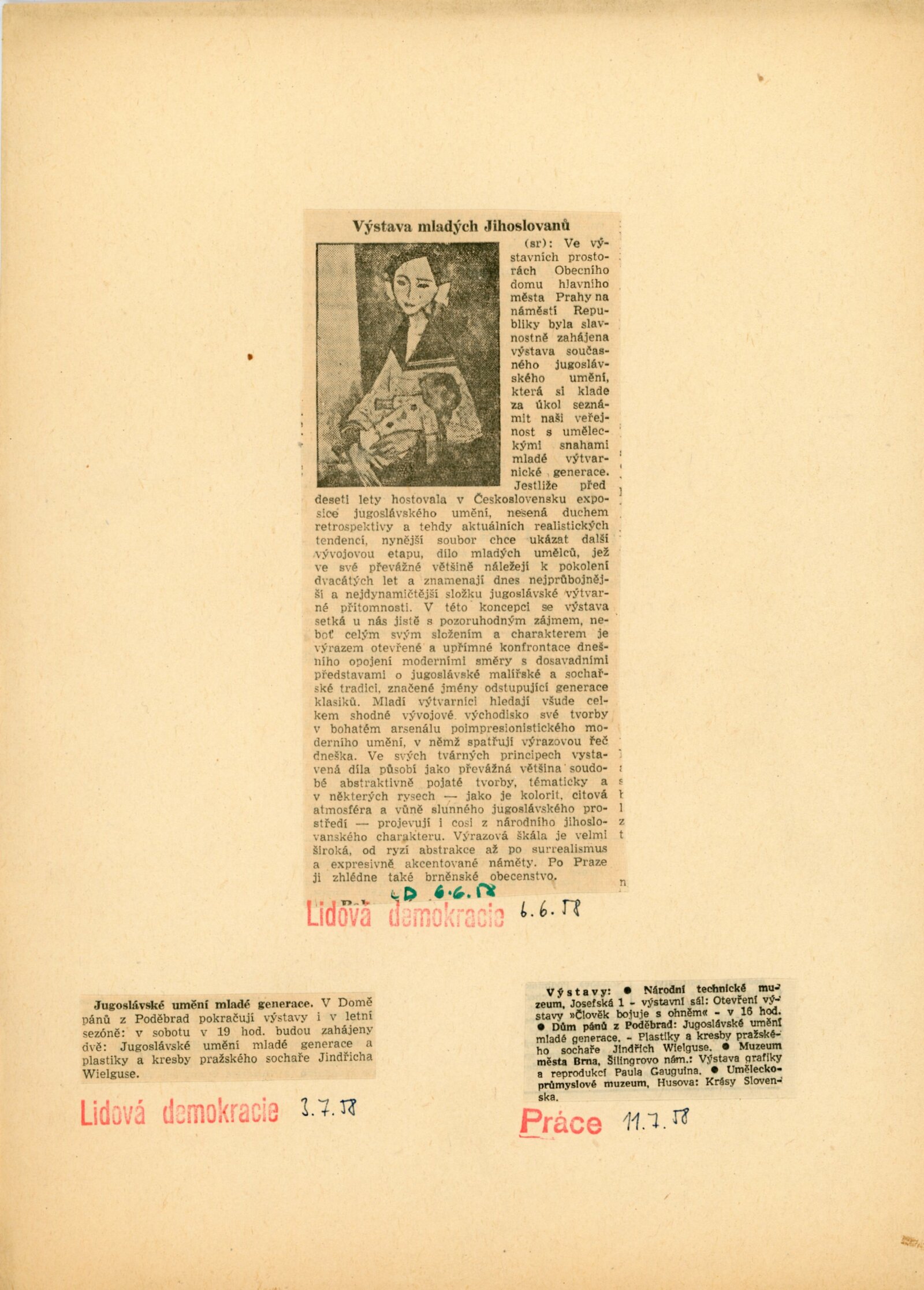 pozvánka (DU i pro předchozí výstavu v Obecním domě v Praze), korespondence (dopis z MŠK o realizaci výstavy, provozní korespondence), účast na tisk. konferenci, recenze v tisku
