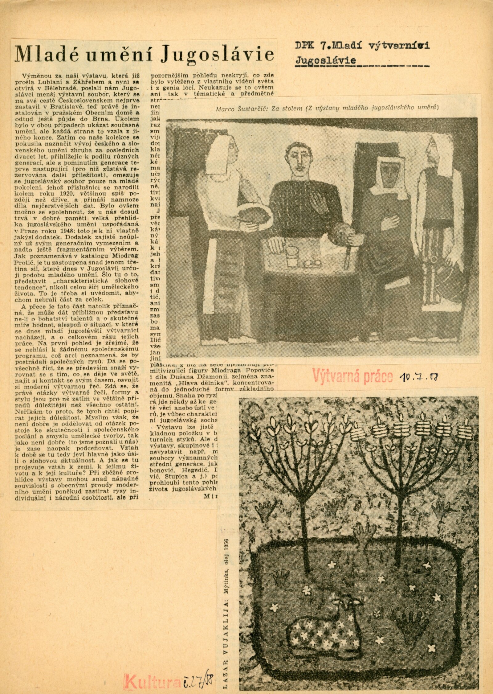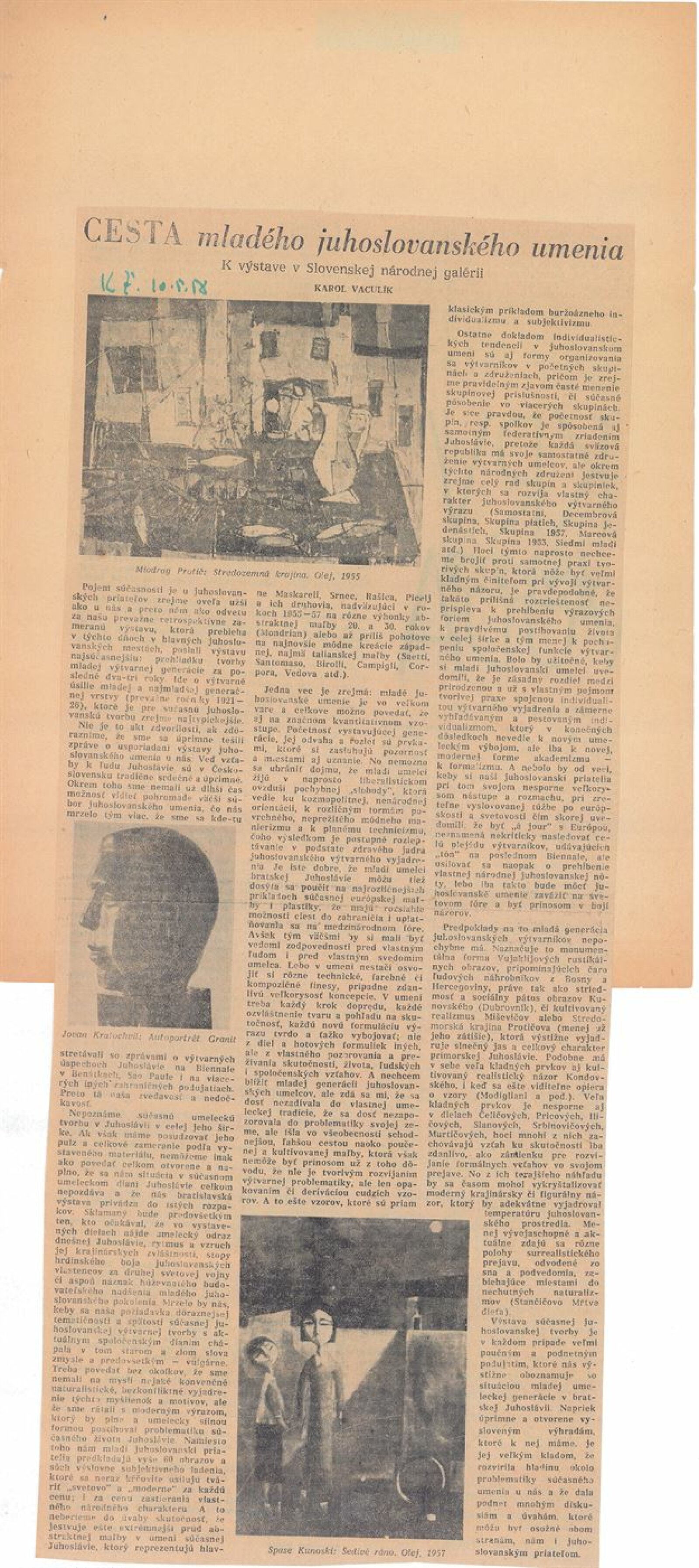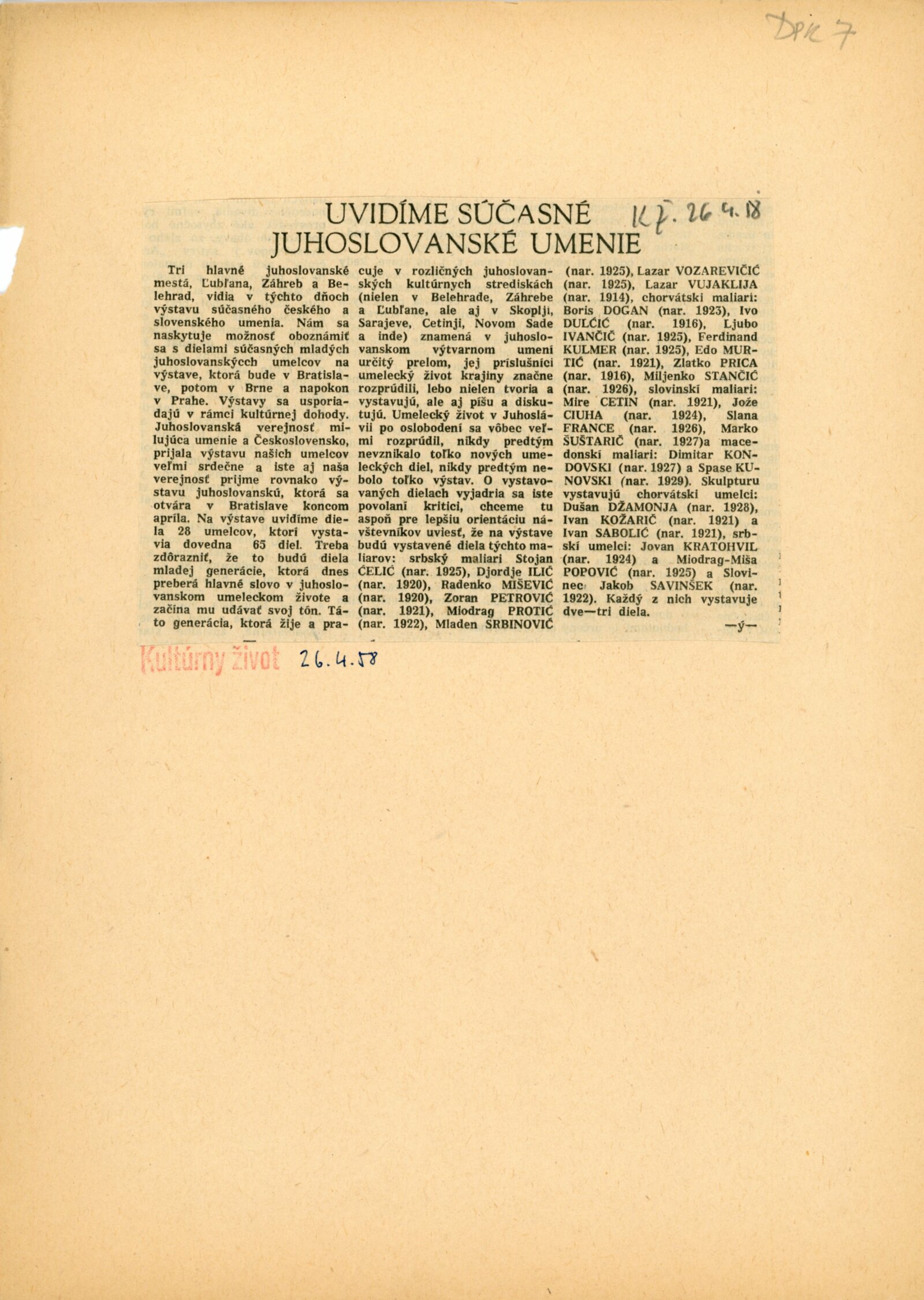 Mire Cetin, Jože Ciuha, Stojan Čelić, Boris Dogan, Ivo Dulčić, Dušan Džamonji, Slana France, Djordje Ilić, Ljubo Ivančić, Dimitar Kondovski, Ivan Kožarič, Jovan Kratohvil, Ferdinand Kulmer, Spase Kunovski, Radenko Mišević, Edo Murtić, Miodrag Popović, Zoran Petrović, Miodrag-Miša Popović, Zlatko Prica, Miodrag Protić, Ivan Sabolić, Jakob Savinšek, Miljenko Stančić, Mladen Srbinović, Marco Šustarčić, Lazar Vozarevičić, Lazar Vujaklija
