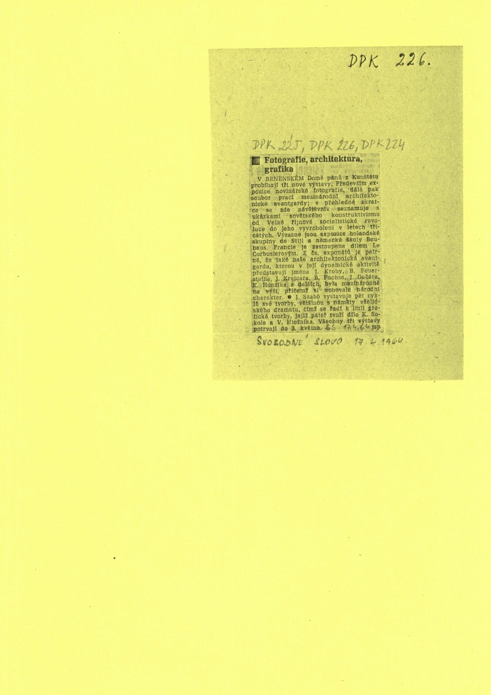 společná pozvánka DPK 224–226, karta k výstavě, katalog, strojopis textu k výstavě, podmínky pro uspořádání výstavy, seznam vystavených děl, fotografie děl, korespondence (příprava výstavy – Julius Szabó s DU), recenze v tisku