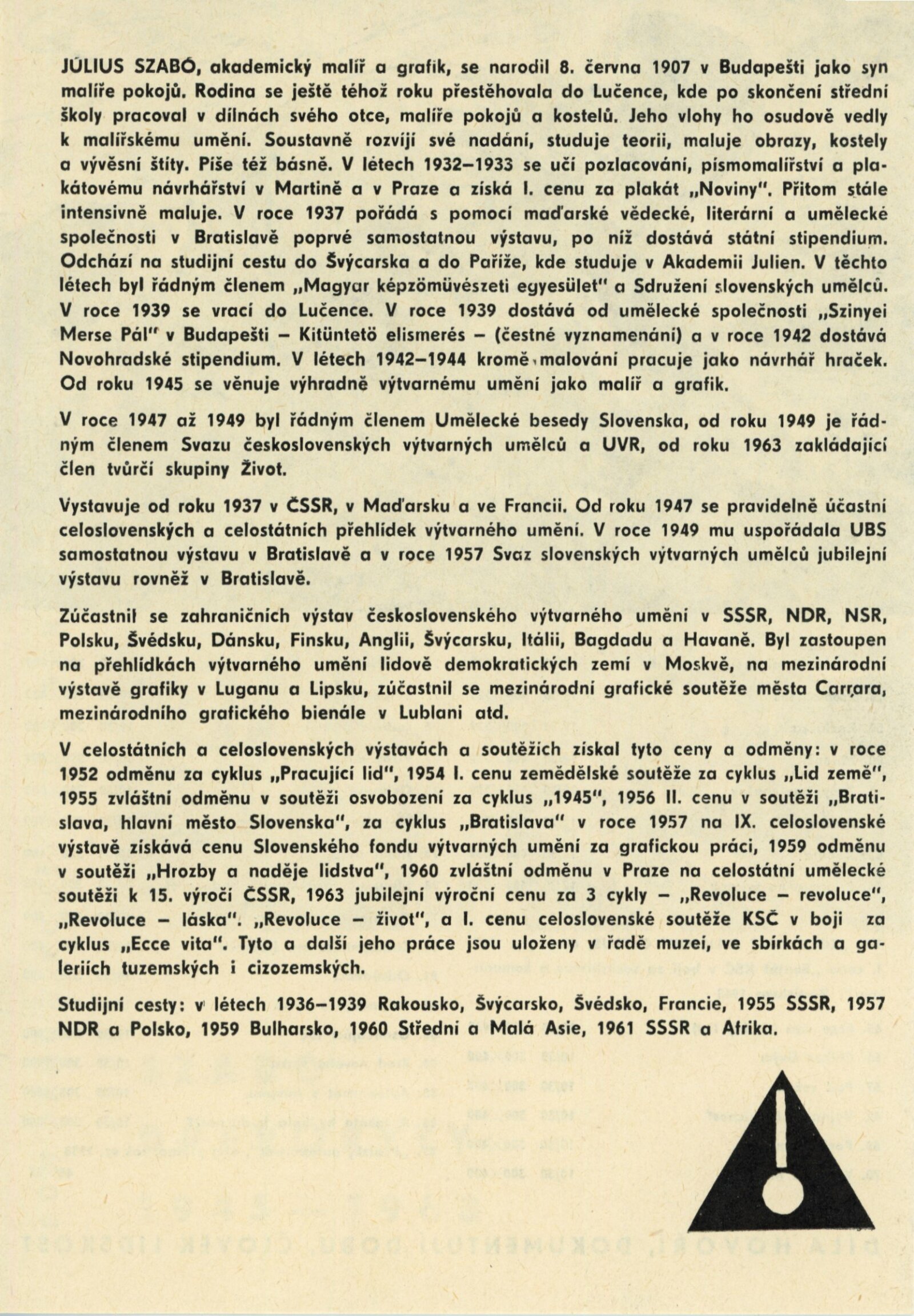 Július (spr. Gyula) Szabó. Dřevoryty 1945–1963: Dům umění města Brna / Dům pánů z Kunštátu, Kabinet grafiky, 10. 4. – 2. 5. 1964 / Text: anonymní. – Brno: DUmB, 1964. – skládačka, 6 s., obr., DPK 224
