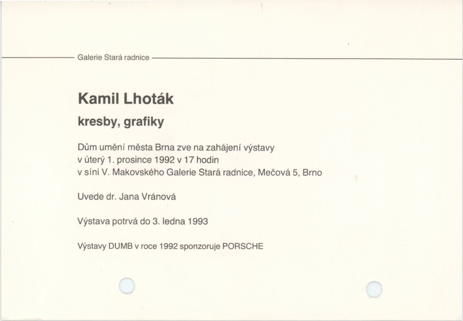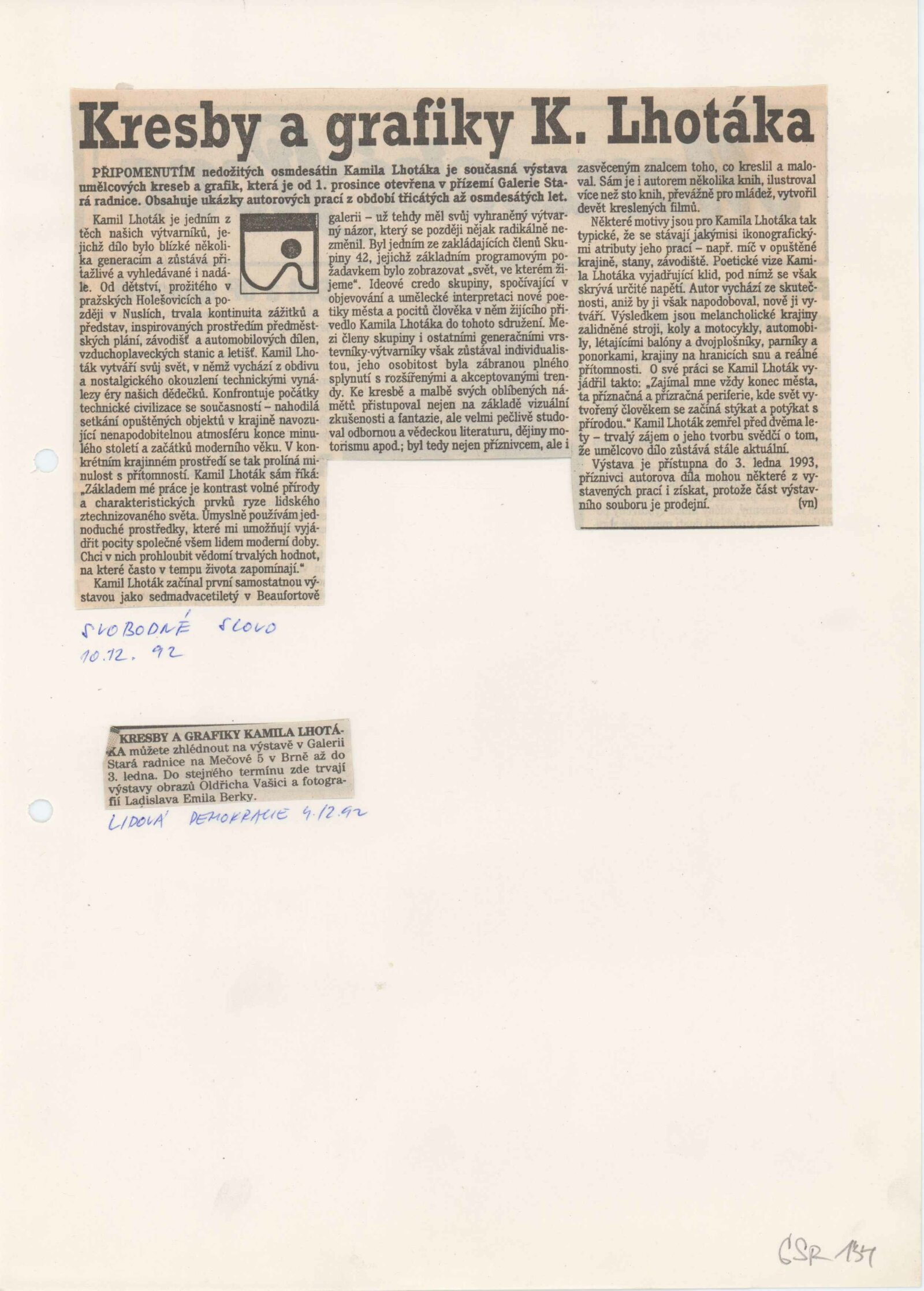 pozvánka, zpráva o výstavě, text k výstavě (J. Vránová), pojistný seznam vystavených děl, seznam prodejních děl, žádost o zapůjčení, smlouvy o výpůjčce, recenze v tisku