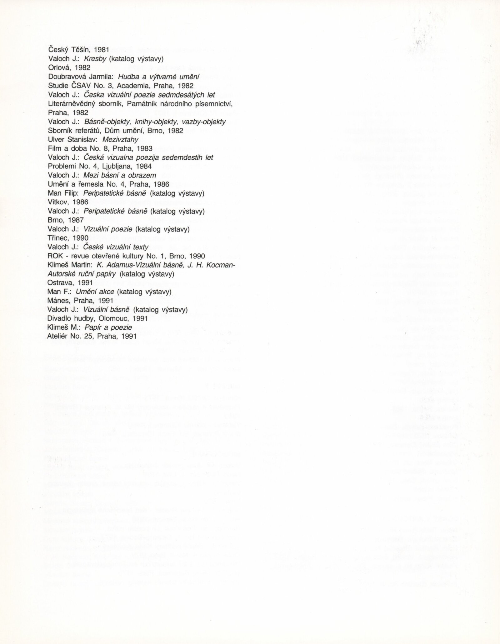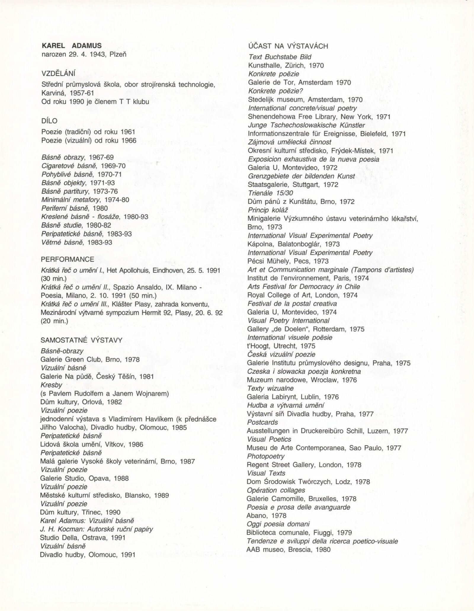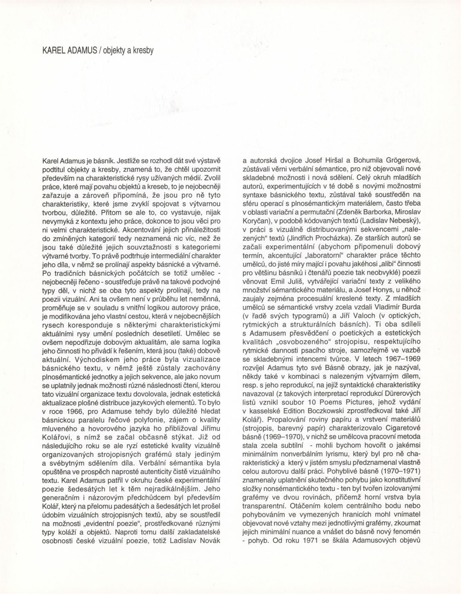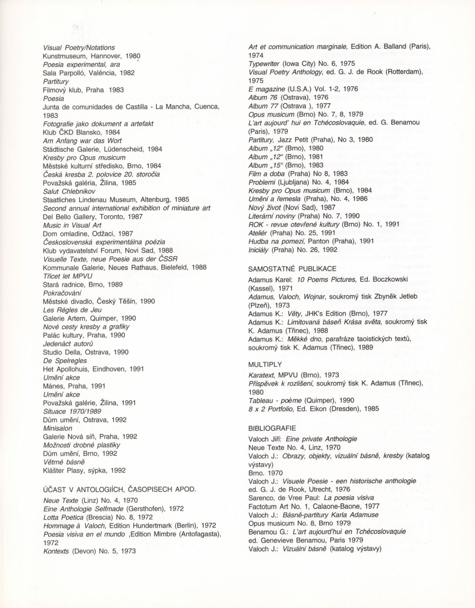 Karel Adamus. Objekty a kresby: Galerie Jaroslava Krále, 182. výstava 18. 1. – 17. 2. 1994 / Text Jiří Valoch. - Brno: UVU, - [16] s., obr. Životní data, dílo, výstavy, bibliografie DU 960; MZK