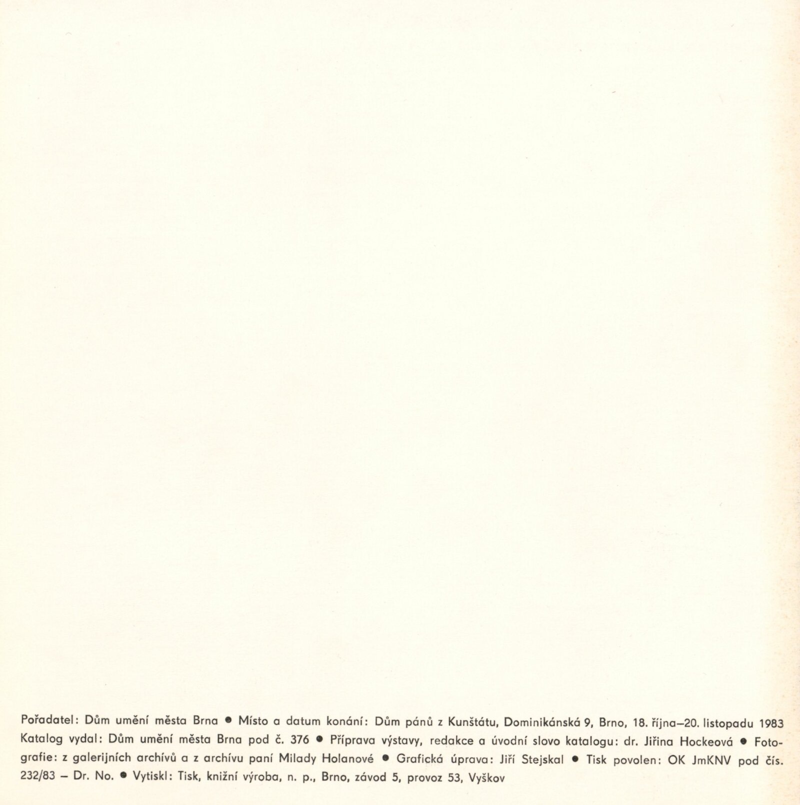 katalog, strojopis, seznam vystavených děl, pojistný seznam děl, provozní korespondence (výpůjčky – Roudnice, Praha, Ostrava, předání výstavy do Horácké galerie v Novém městě na Moravě – repríza výstavy), žádostí o zápůjčku, žádost o povolení výstavy, závěrečná zpráva o průběhu výstavy, recenze v tisku, dokumenty ručně psané