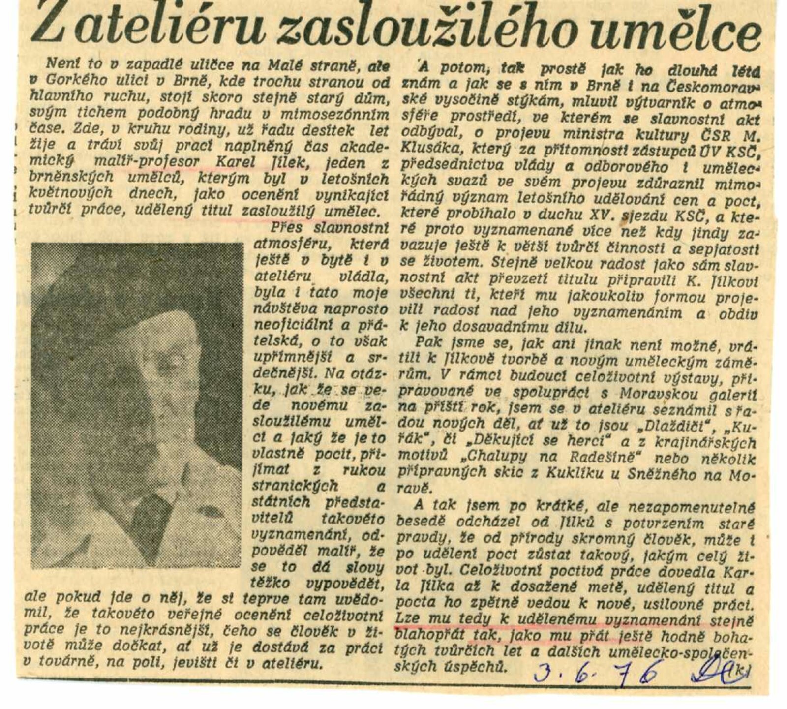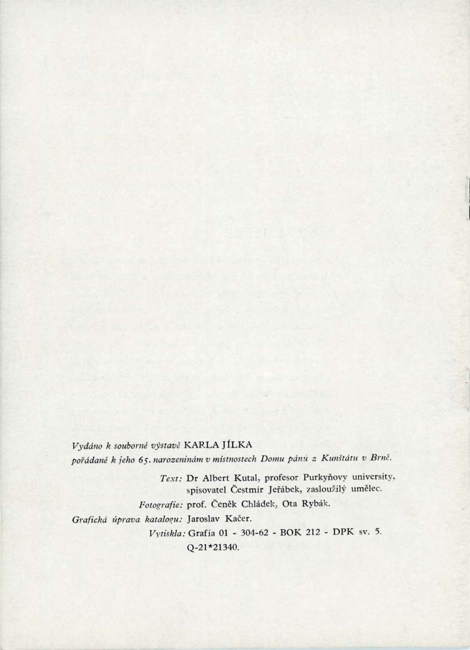Karel Jílek. Soubor díla: Dům umění města Brna / Dům pánů z Kunštátu, 1. patro, 25. 3. – 6. 5. 1962 / Texty: Čestmír Jeřábek, Albert Kutal. – Brno: DUmB, 1962. – 13 s., obr., DPK 144. – MZK; MG; MMB