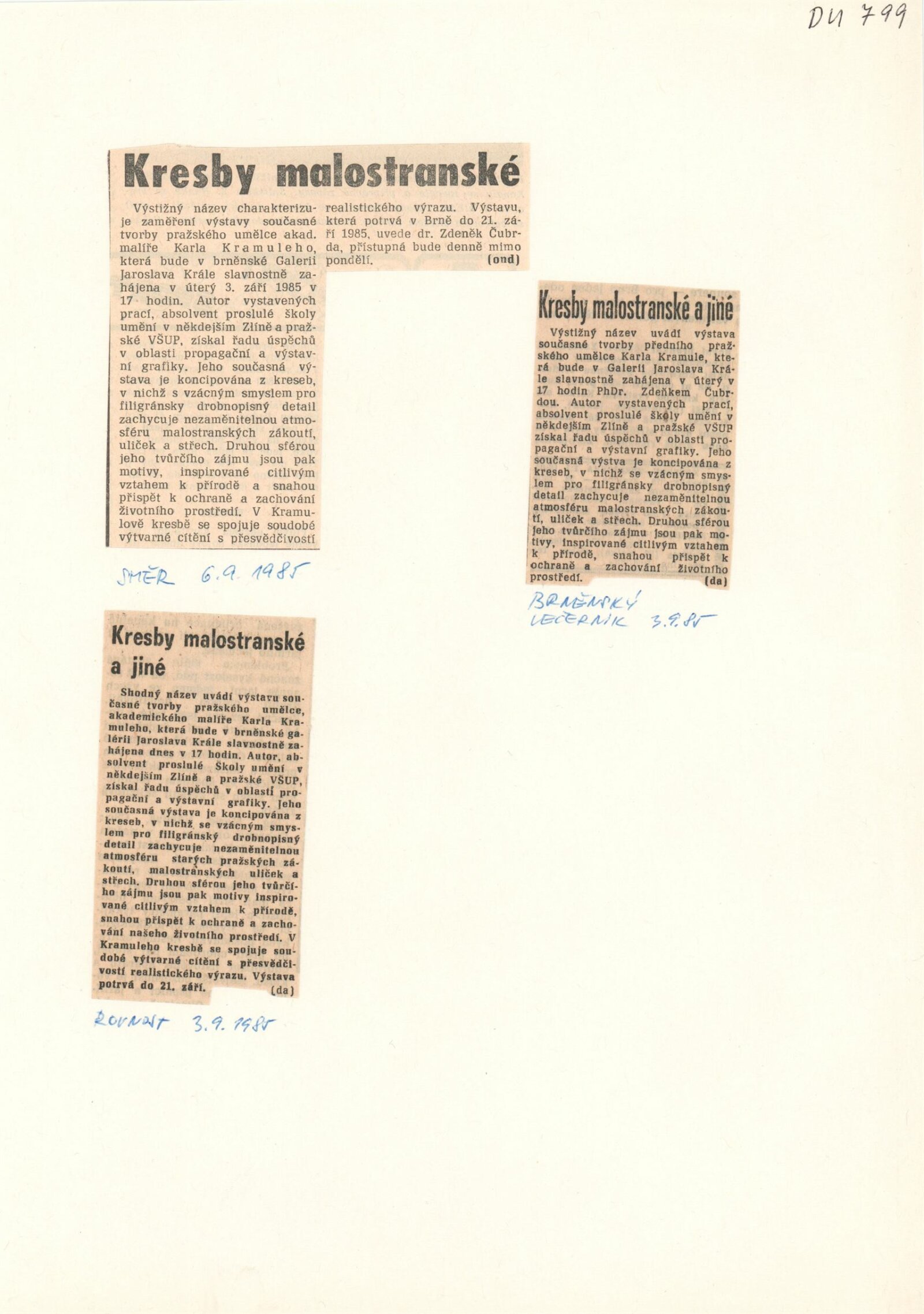 Karel Kramule. Kresby malostranské a jiné: Dům umění, 126. výstava v Galerii Jaroslava Krále, 3. 9. – 22. 9. 1985. / Text: Zdeněk Čubrda. – Brno: SČVU, 1985. – 12 s., obr., portrét, životopis, seznam výstav, DU 799. – MZK; MG