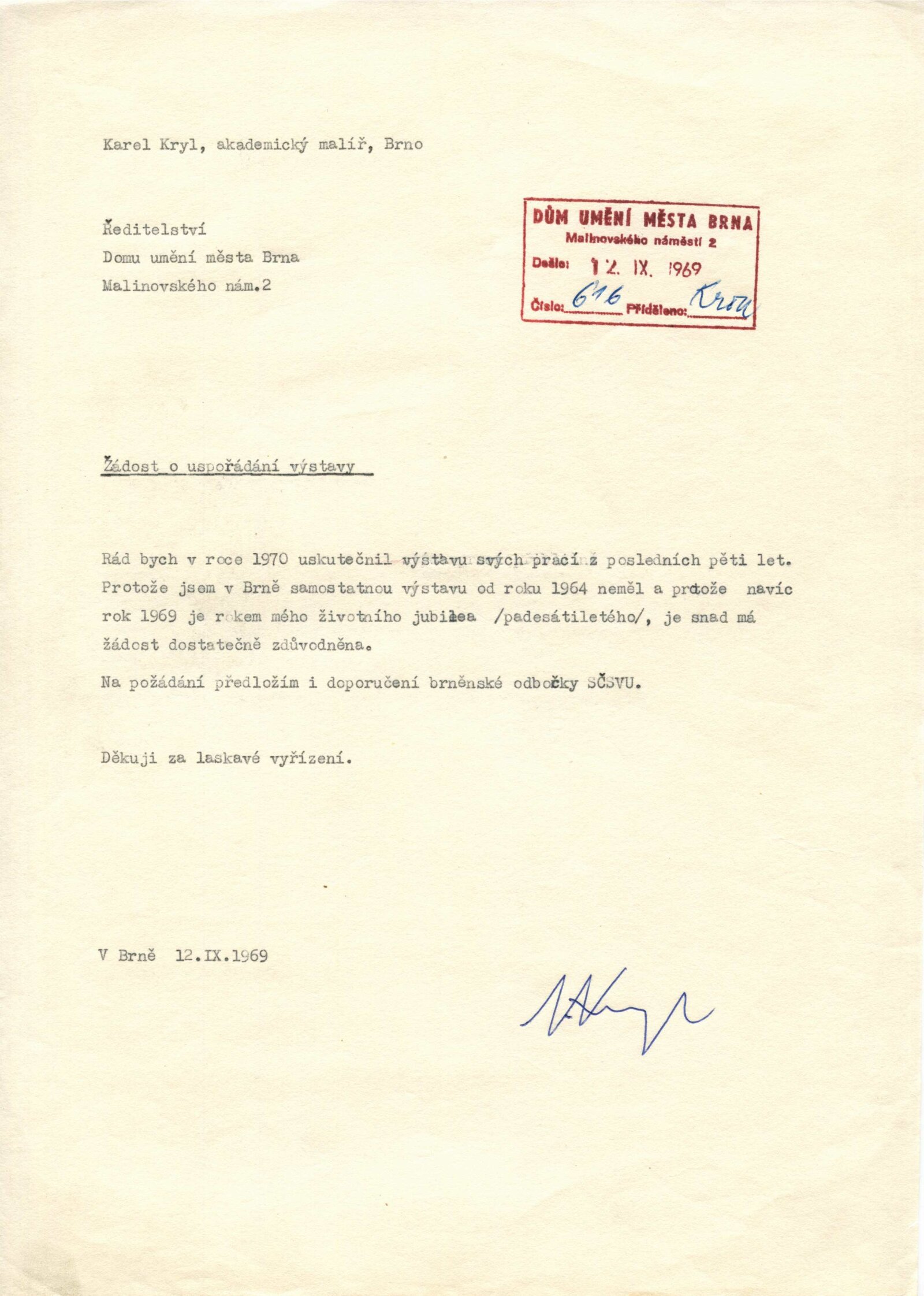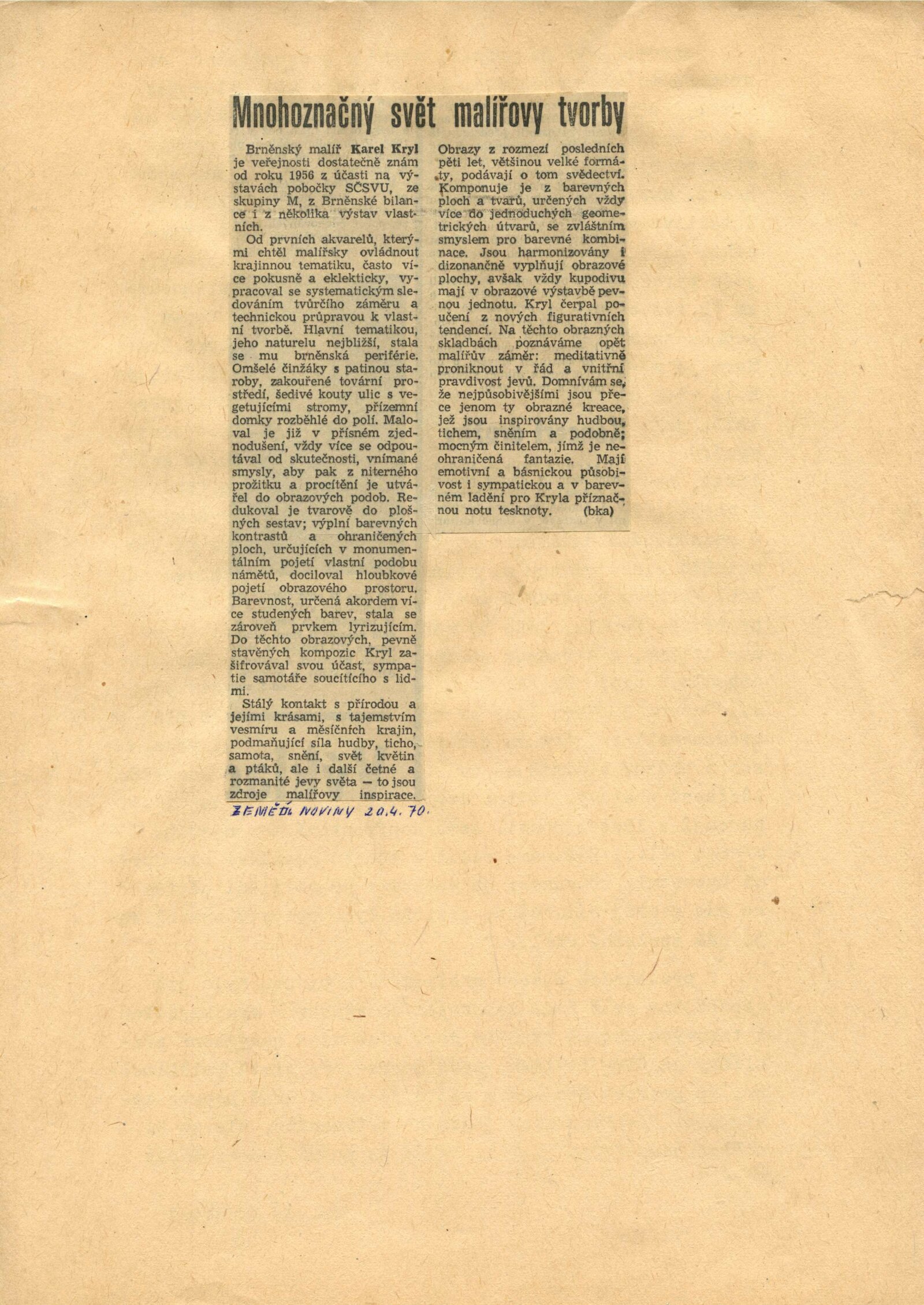 pozvánka, katalog, fotografie děl, informační zpráva o výstavě z DU, úvodní slovo Niny Dvořákové, strojopis katalogu, korespondence (dopis Karla Kryla s žádostí o výstavu), recenze v tisku, katalog výstavy Karla Kryla v Závodním klubu ROH ČKD Blansko